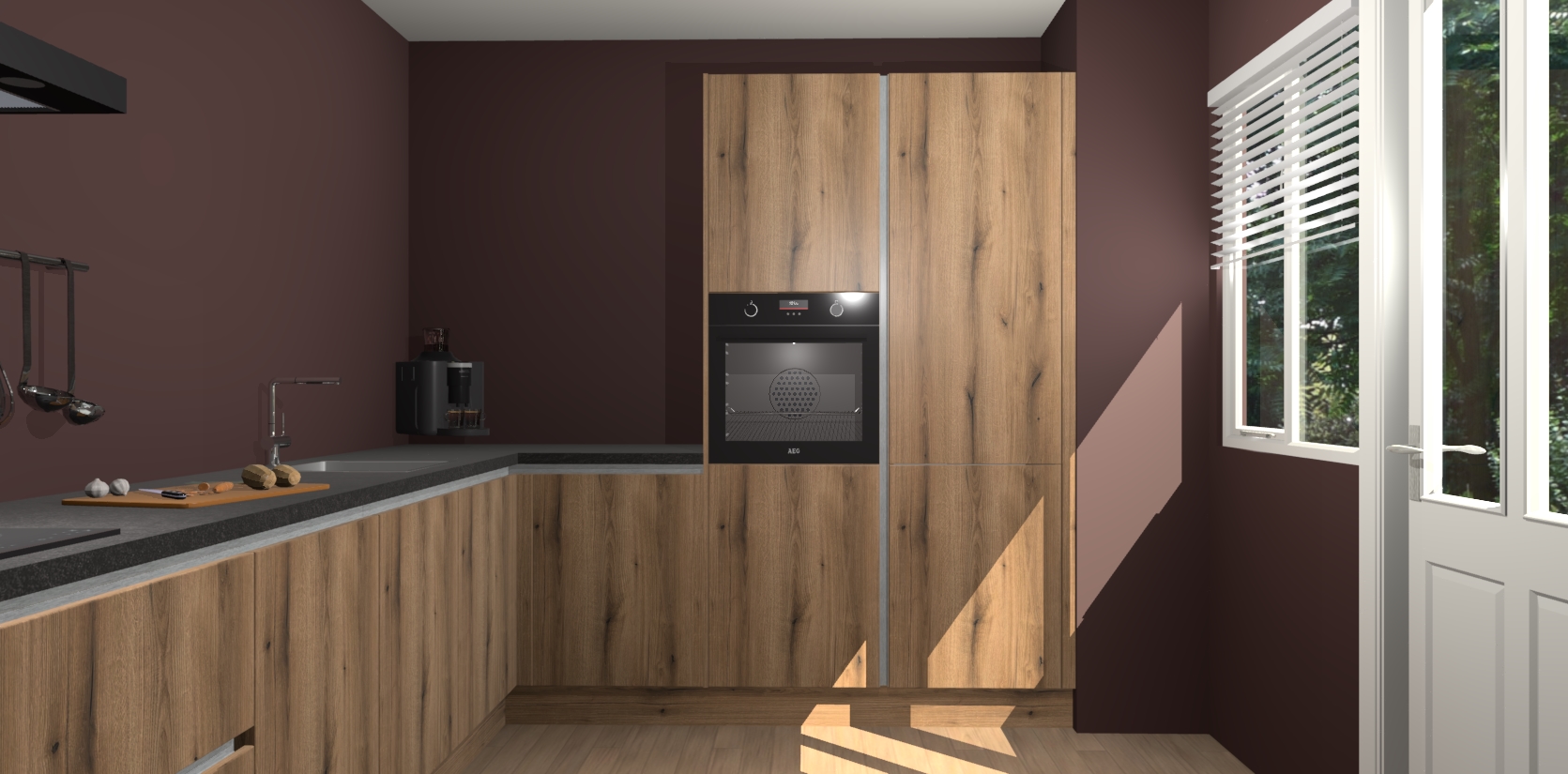 Welkom bij de Goud Eiken greeploze keuken Portland. Deze prachtige keuken zal de komende jaren het middelpunt van de belangstelling in uw huis zijn. Uitgerust met vijf inbouwapparaten komt u nooit kookgereedschap tekort. Bovendien geeft de warme houtlook elke ruimte een uitnodigende en tijdloze uitstraling.