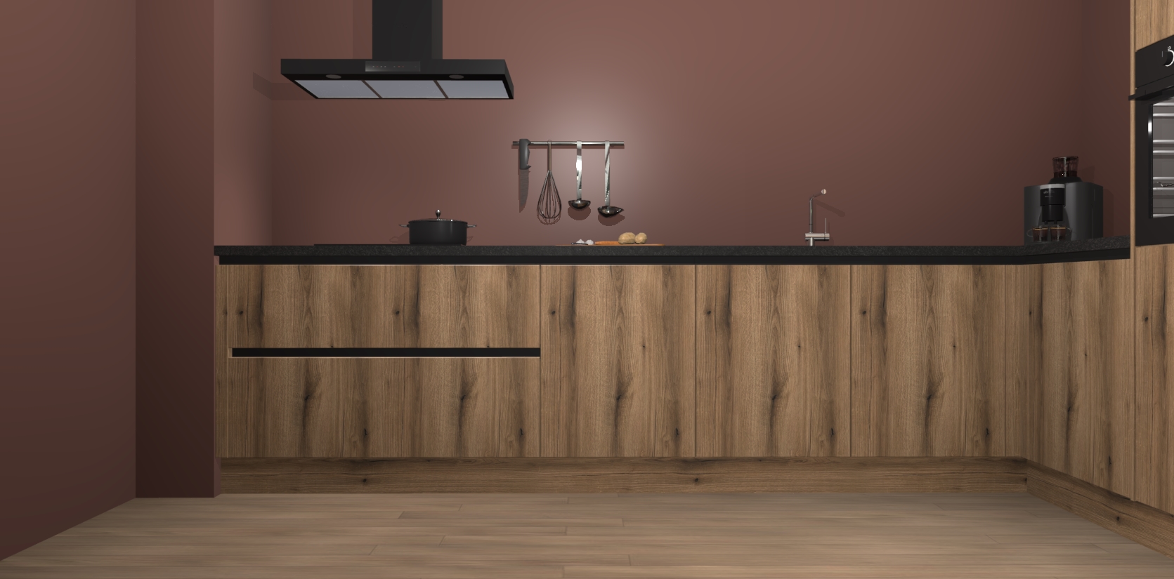 Welkom bij de Goud Eiken greeploze keuken Portland. Deze prachtige keuken zal de komende jaren het middelpunt van de belangstelling in uw huis zijn. Uitgerust met vijf inbouwapparaten komt u nooit kookgereedschap tekort. Bovendien geeft de warme houtlook elke ruimte een uitnodigende en tijdloze uitstraling.