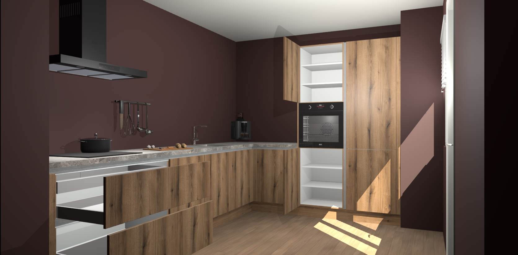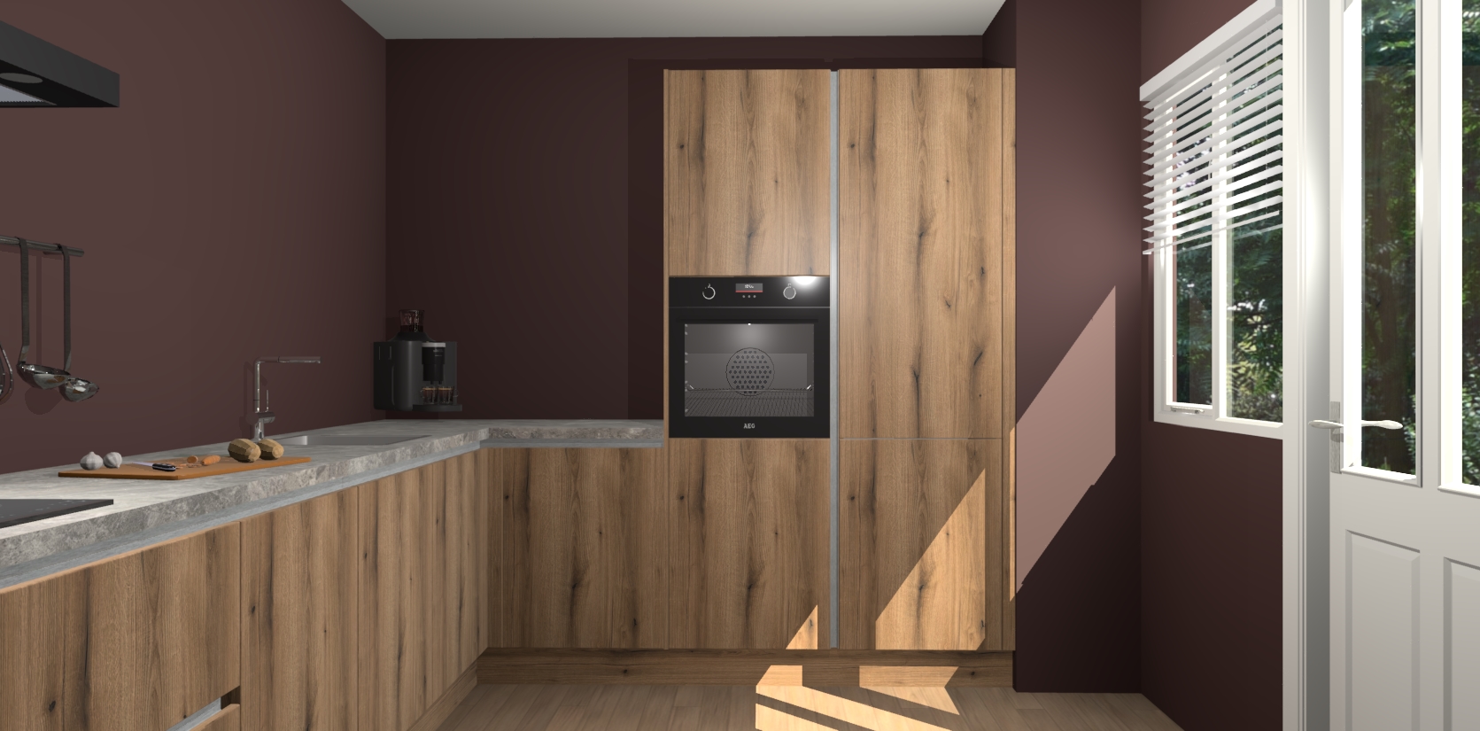 Welkom bij de Goud Eiken greeploze keuken Portland. Deze prachtige keuken zal de komende jaren het middelpunt van de belangstelling in uw huis zijn. Uitgerust met vijf inbouwapparaten komt u nooit kookgereedschap tekort. Bovendien geeft de warme houtlook elke ruimte een uitnodigende en tijdloze uitstraling.