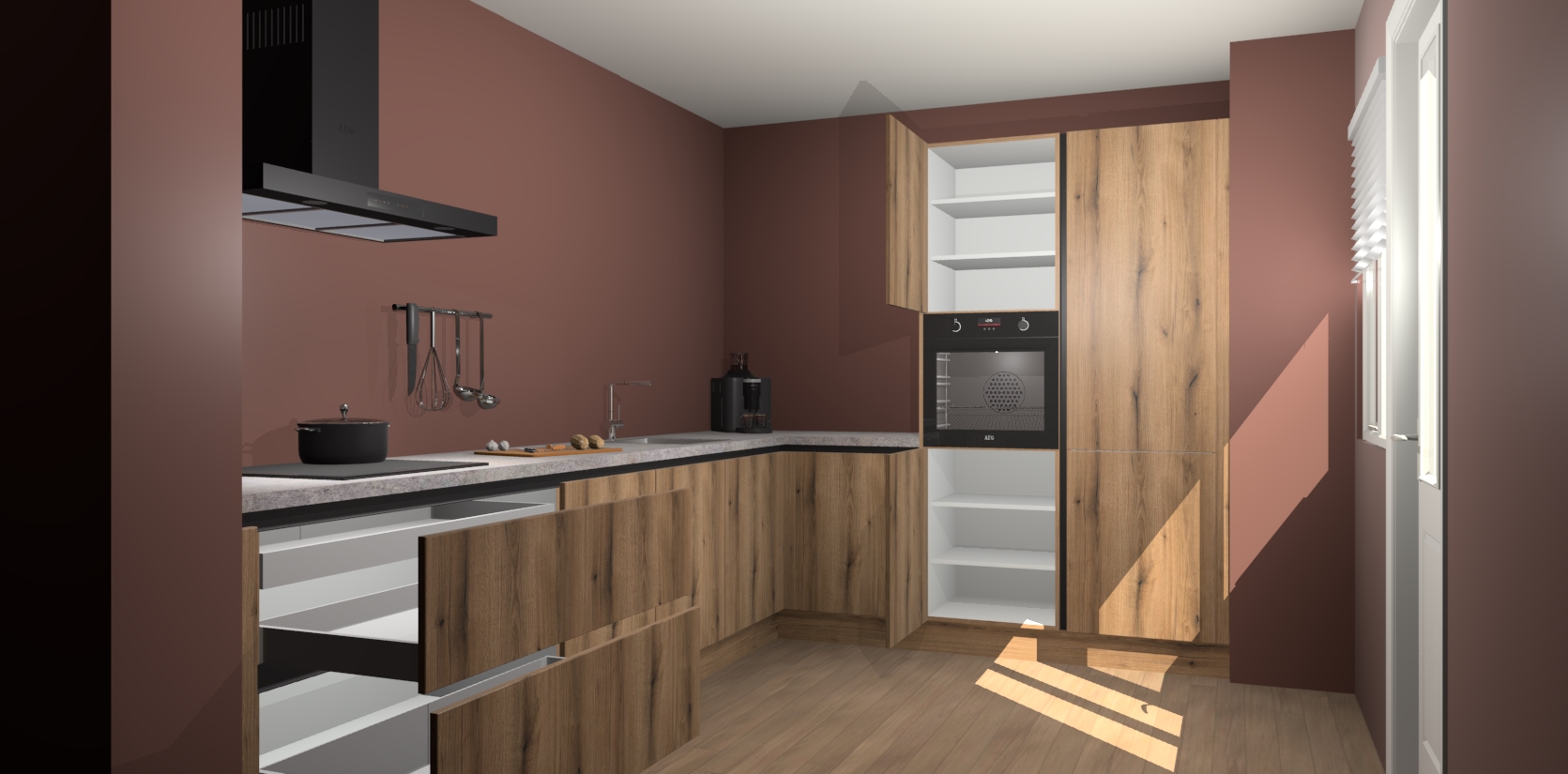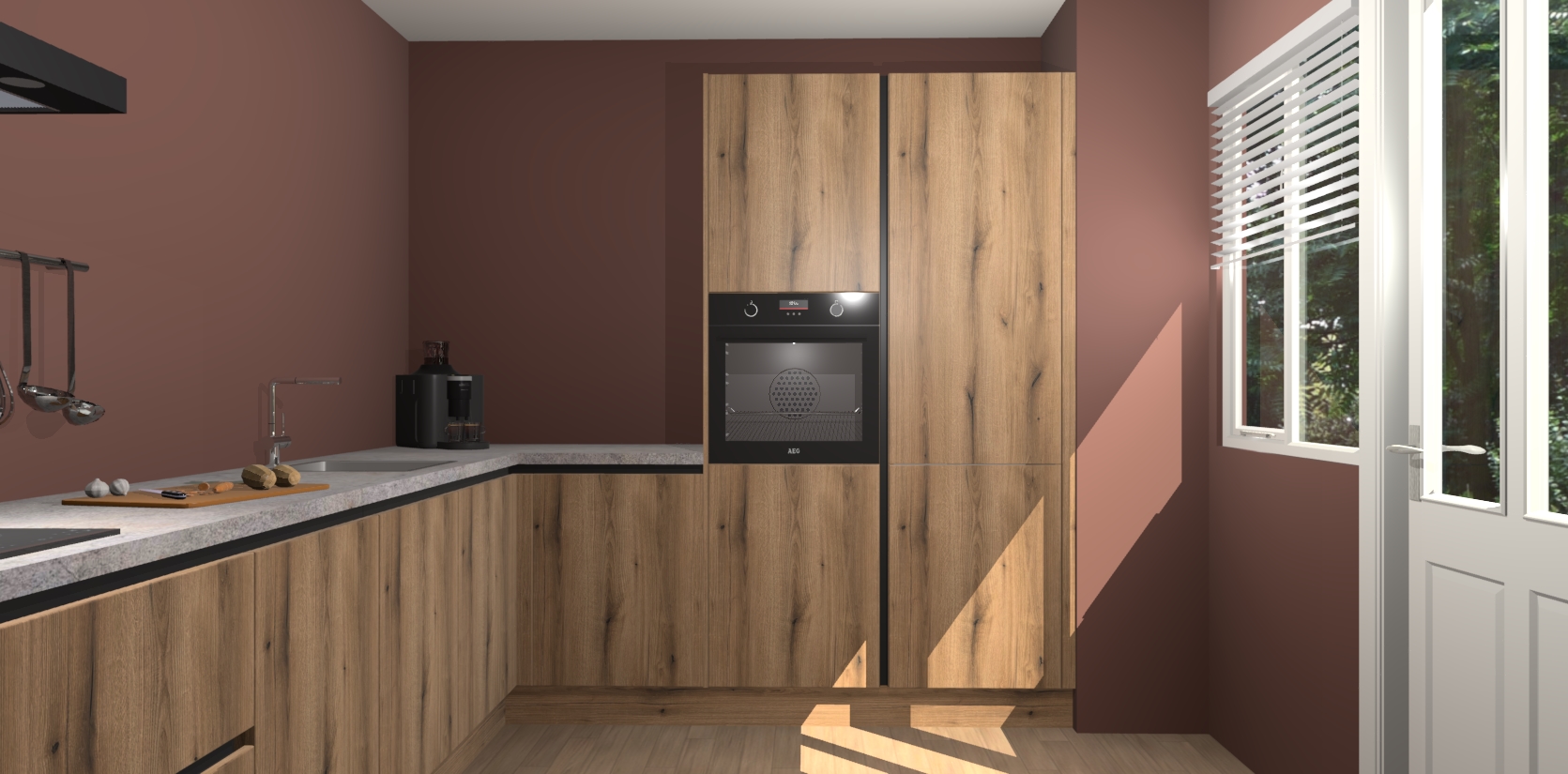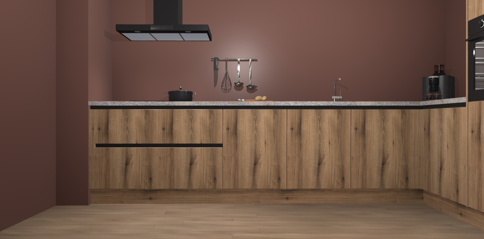 Welkom bij de Goud Eiken greeploze keuken Portland. Deze prachtige keuken zal de komende jaren het middelpunt van de belangstelling in uw huis zijn. Uitgerust met vijf inbouwapparaten komt u nooit kookgereedschap tekort. Bovendien geeft de warme houtlook elke ruimte een uitnodigende en tijdloze uitstraling.