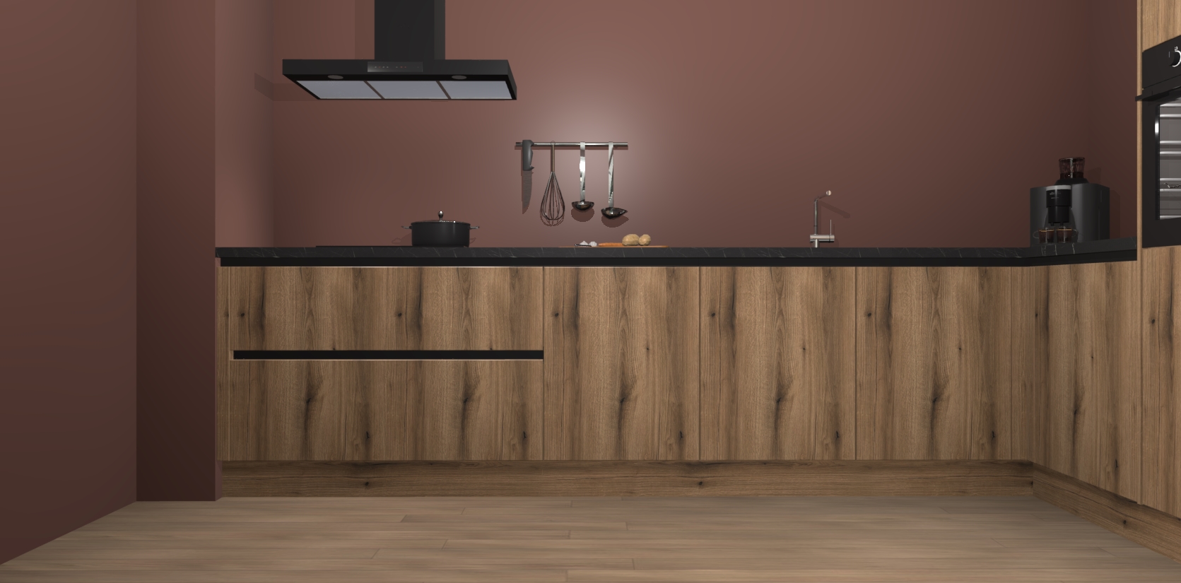 Welkom bij de Goud Eiken greeploze keuken Portland. Deze prachtige keuken zal de komende jaren het middelpunt van de belangstelling in uw huis zijn. Uitgerust met vijf inbouwapparaten komt u nooit kookgereedschap tekort. Bovendien geeft de warme houtlook elke ruimte een uitnodigende en tijdloze uitstraling.