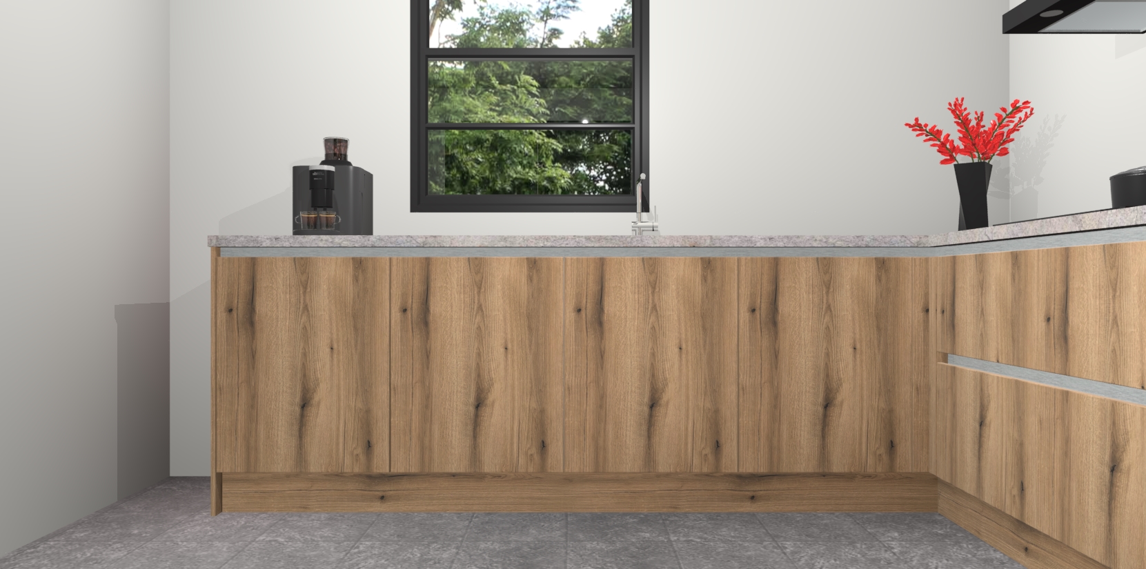 De Goud Eiken greeploze keuken Porto heeft 5 ingebouwde apparaten - een oven, inductiekookplaat, afzuigkap, vaatwasser en koelkast - waarmee u in een handomdraai heerlijke gerechten bereidt. Soft-close deuren zorgen voor nog meer functionaliteit en gemak. En dit alles voor een onverslaanbaar vaste prijs. En als u nu bestelt, duurt de levering maar 7 weken! Wat nog ongelooflijker is, is dat onze kasten voor gemonteerd worden geleverd.