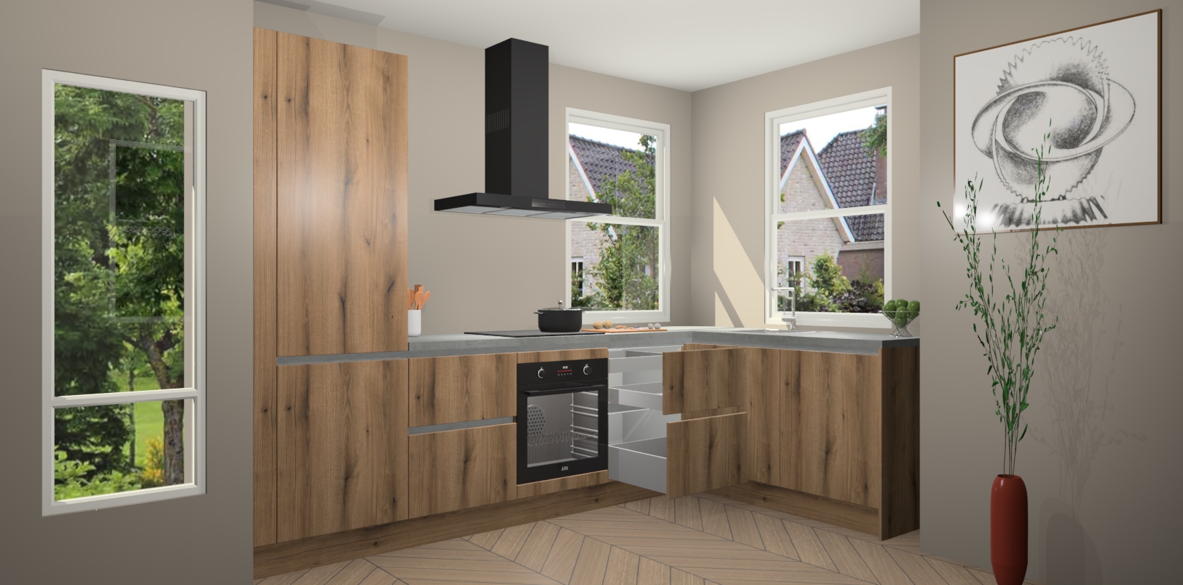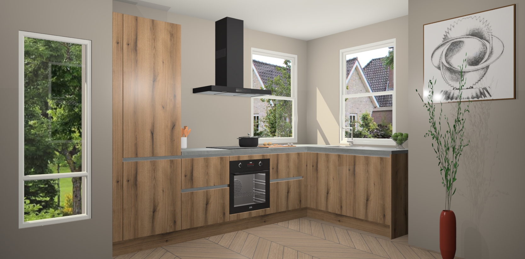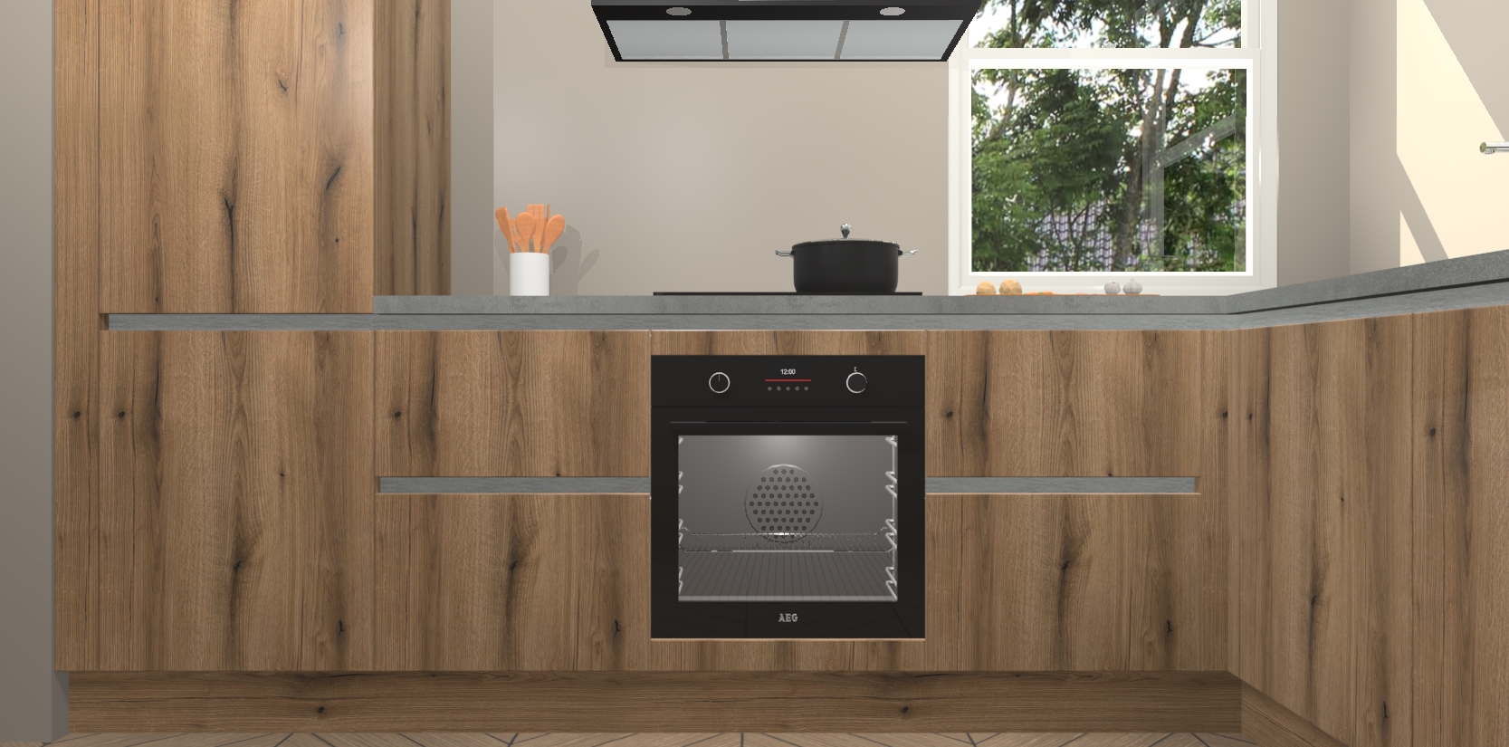Wat maakt deze keuken zo bijzonder? Ten eerste geeft het houten werkblad uw ruimte een onmiskenbaar klassieke uitstraling. De natuurlijke afwerking roept warmte en elegantie op die nooit uit de mode zullen raken. Bovendien is het gemakkelijk schoon te houden en te onderhouden, zodat je er jarenlang plezier van kunt hebben. Als u op zoek bent naar extra gemak in uw keuken, dan heeft u bij het plaatsen van een bestelling bij ons ook de optie om uw toestellen te upgraden naar AEG-modellen - zo haalt u moderne innovatie van topmerken in apparatentechnologie rechtstreeks in huis.