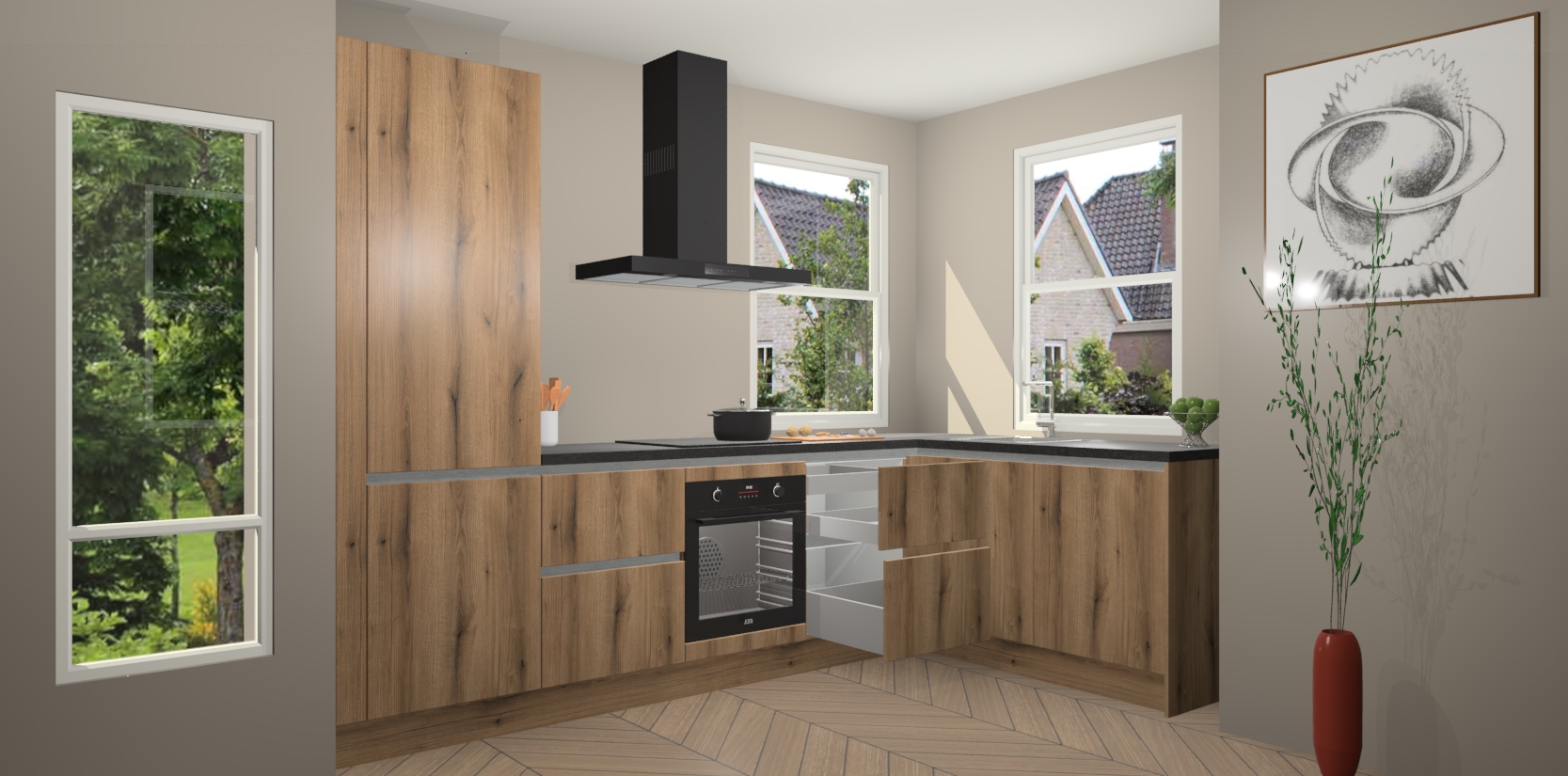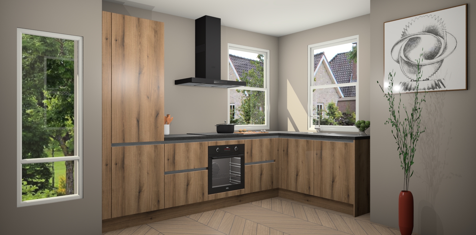 Wat maakt deze keuken zo bijzonder? Ten eerste geeft het houten werkblad uw ruimte een onmiskenbaar klassieke uitstraling. De natuurlijke afwerking roept warmte en elegantie op die nooit uit de mode zullen raken. Bovendien is het gemakkelijk schoon te houden en te onderhouden, zodat je er jarenlang plezier van kunt hebben. Als u op zoek bent naar extra gemak in uw keuken, dan heeft u bij het plaatsen van een bestelling bij ons ook de optie om uw toestellen te upgraden naar AEG-modellen - zo haalt u moderne innovatie van topmerken in apparatentechnologie rechtstreeks in huis.