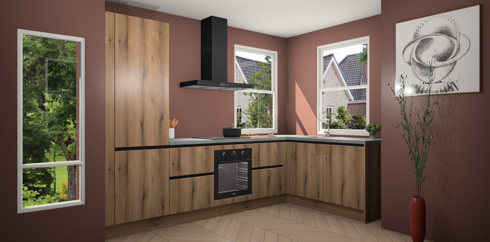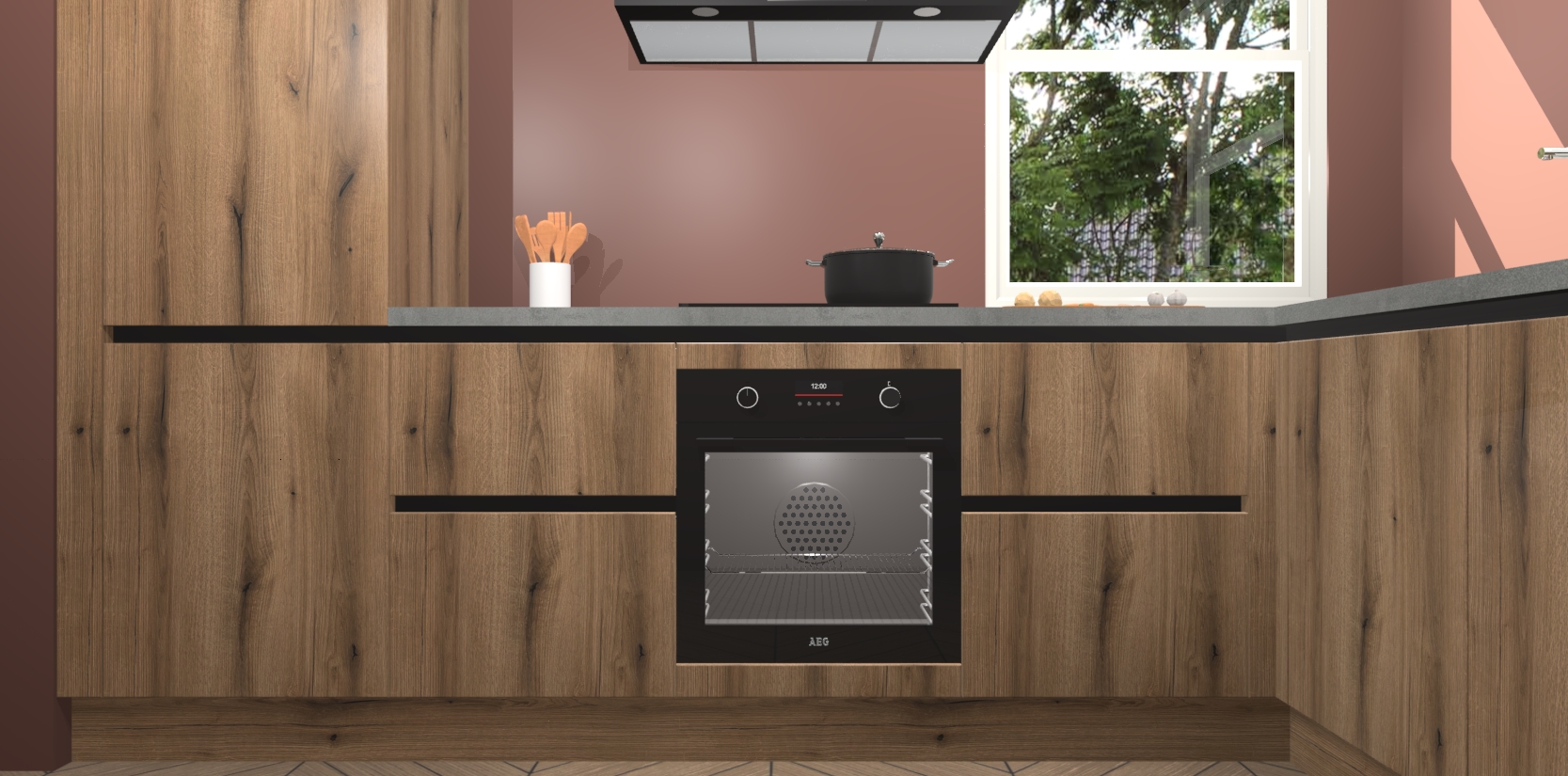 Wat maakt deze keuken zo bijzonder? Ten eerste geeft het houten werkblad uw ruimte een onmiskenbaar klassieke uitstraling. De natuurlijke afwerking roept warmte en elegantie op die nooit uit de mode zullen raken. Bovendien is het gemakkelijk schoon te houden en te onderhouden, zodat je er jarenlang plezier van kunt hebben. Als u op zoek bent naar extra gemak in uw keuken, dan heeft u bij het plaatsen van een bestelling bij ons ook de optie om uw toestellen te upgraden naar AEG-modellen - zo haalt u moderne innovatie van topmerken in apparatentechnologie rechtstreeks in huis.