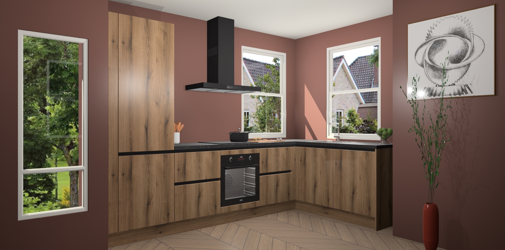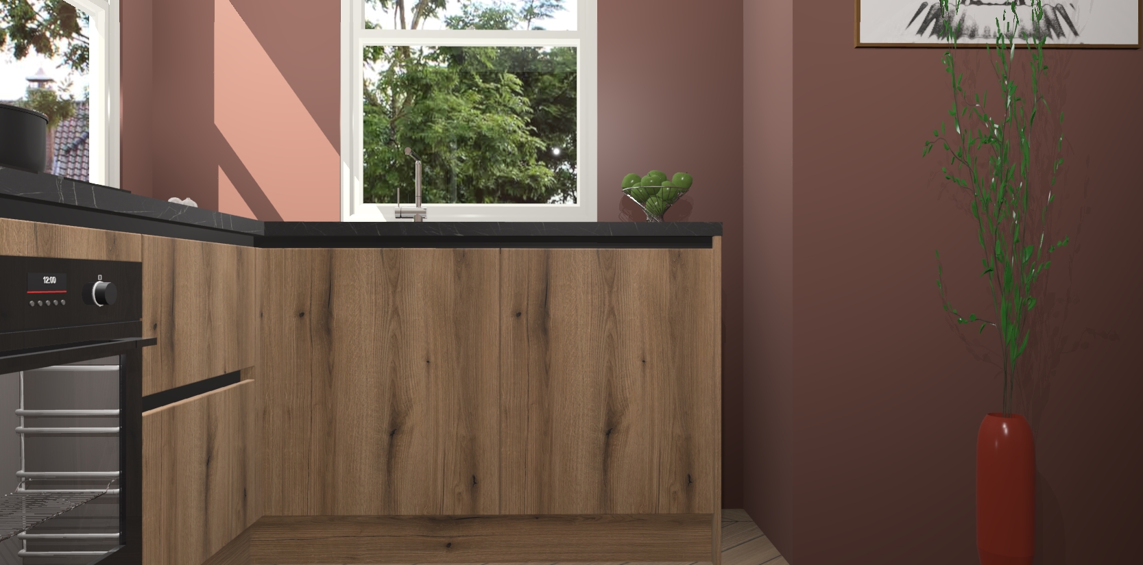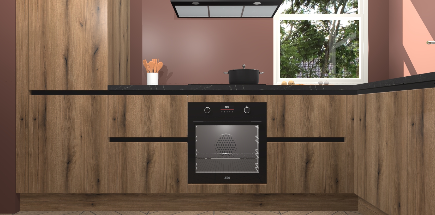 Wat maakt deze keuken zo bijzonder? Ten eerste geeft het houten werkblad uw ruimte een onmiskenbaar klassieke uitstraling. De natuurlijke afwerking roept warmte en elegantie op die nooit uit de mode zullen raken. Bovendien is het gemakkelijk schoon te houden en te onderhouden, zodat je er jarenlang plezier van kunt hebben. Als u op zoek bent naar extra gemak in uw keuken, dan heeft u bij het plaatsen van een bestelling bij ons ook de optie om uw toestellen te upgraden naar AEG-modellen - zo haalt u moderne innovatie van topmerken in apparatentechnologie rechtstreeks in huis.