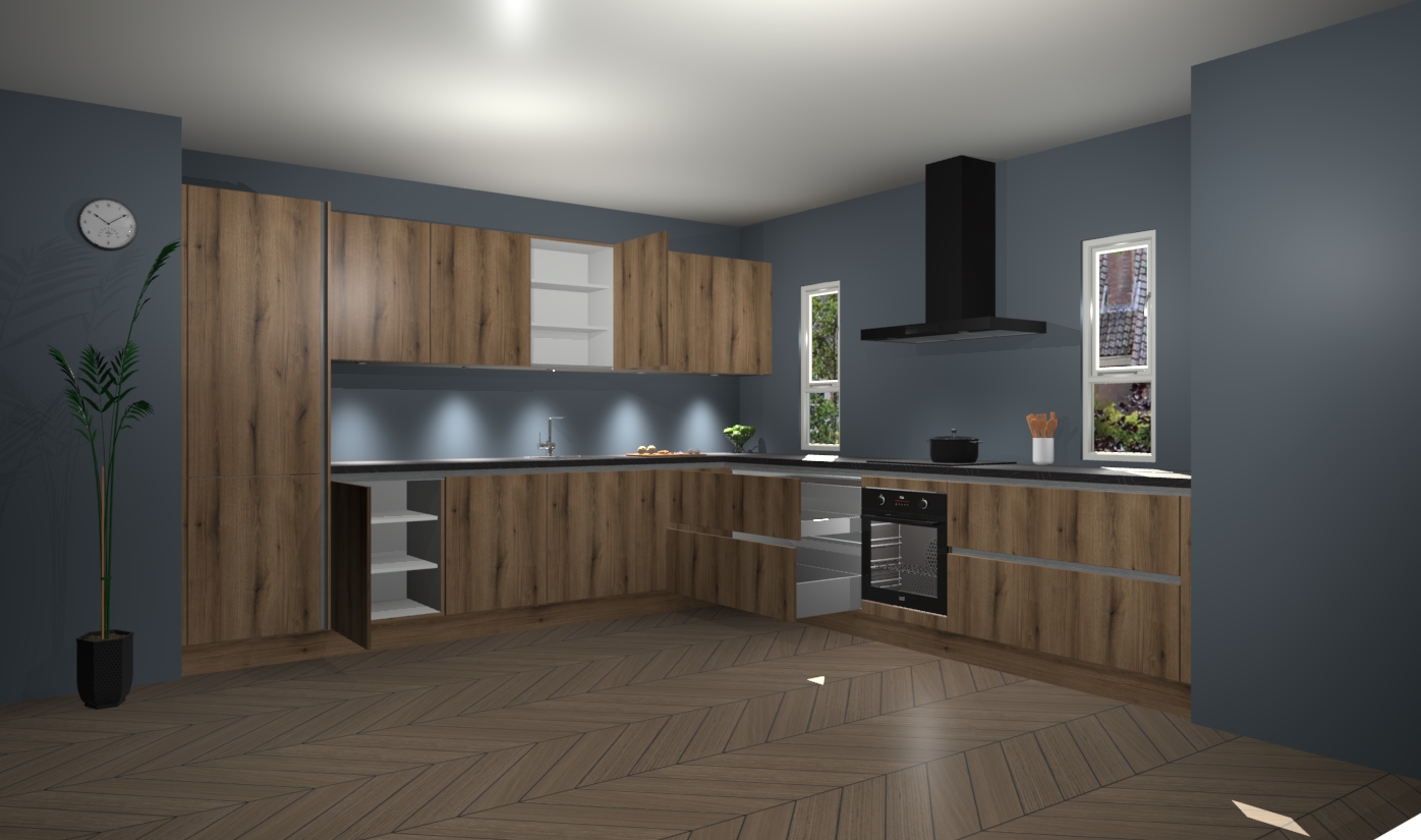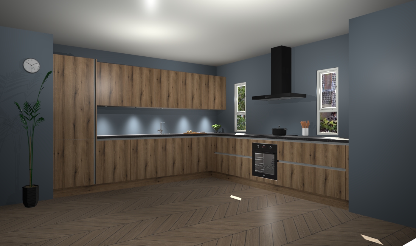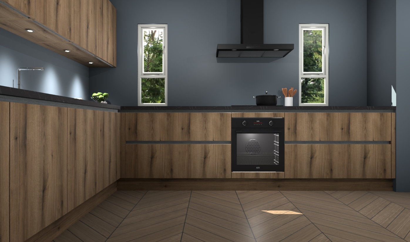 De goud eiken greeploze keuken is een ideale hoekkeuken en heeft alle functies en apparatuur die u maar nodig kunt hebben. Bij de bestelling krijgt u een oven, inductiekookplaat, afzuigkap, vaatwasser en koelkast - deze kunnen desgewenst eenvoudig worden uitgebreid naar AEG na bestellen. Elke kast wordt ook voor gemonteerd geleverd met soft close deuren die jarenlang gebruik beloven. Stelt u zich voor dat u geen gedoe heeft met vervelende montage - vanaf het moment dat u uw bestelling plaats, duurt het slechts 7 weken voor het bij u thuis geleverd wordt.