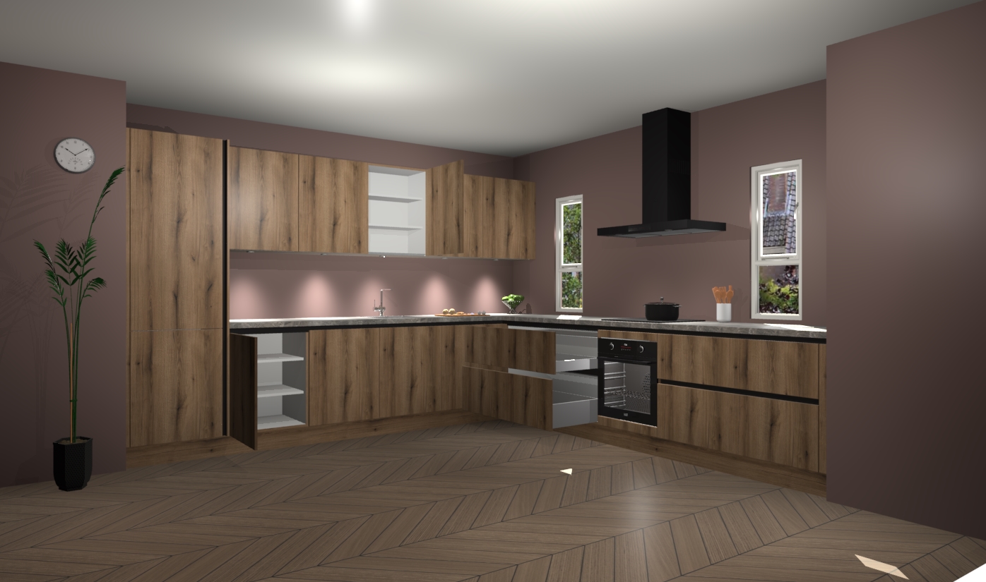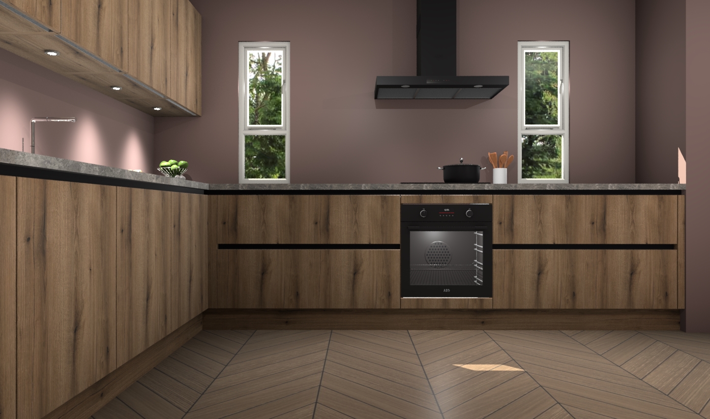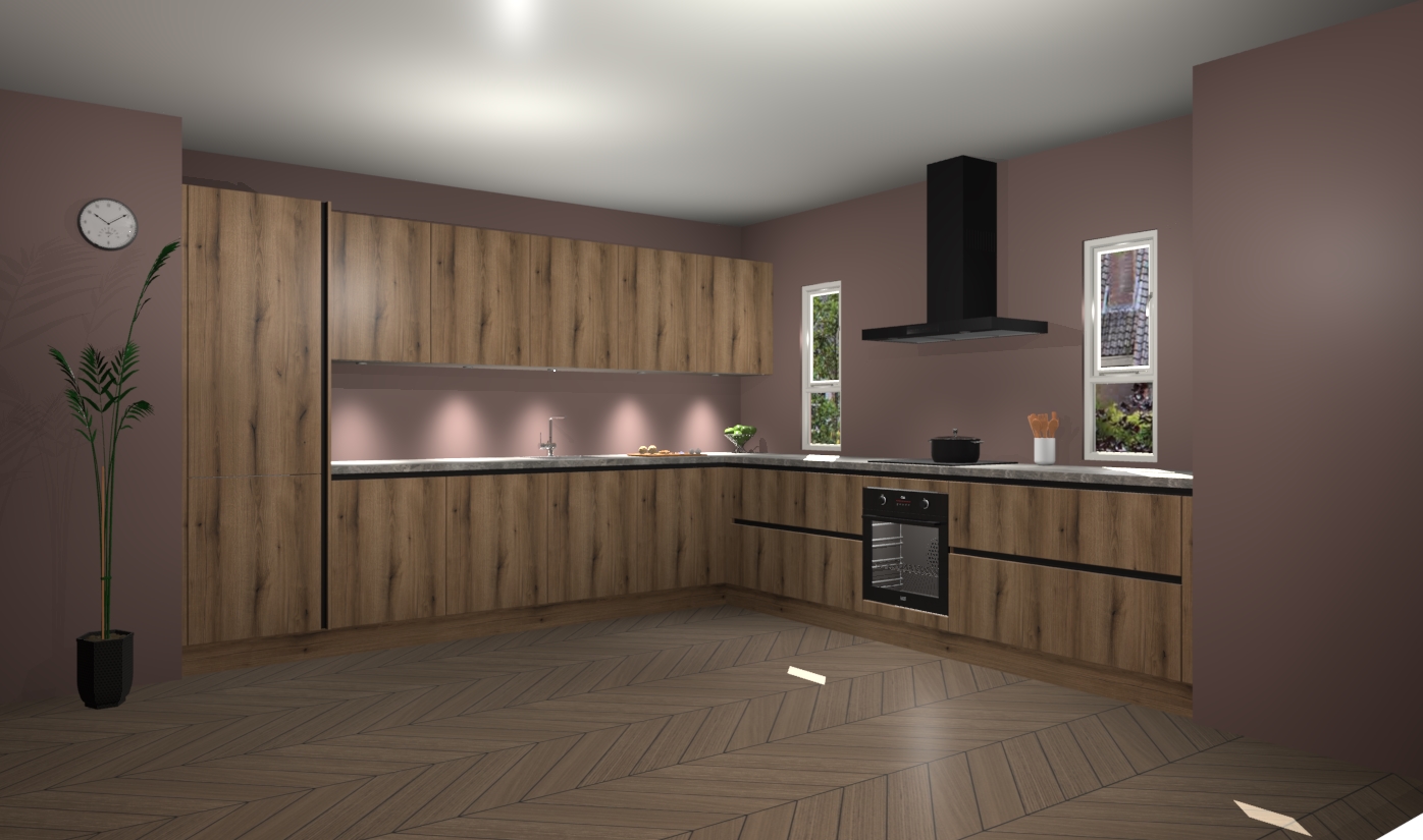 De goud eiken greeploze keuken is een ideale hoekkeuken en heeft alle functies en apparatuur die u maar nodig kunt hebben. Bij de bestelling krijgt u een oven, inductiekookplaat, afzuigkap, vaatwasser en koelkast - deze kunnen desgewenst eenvoudig worden uitgebreid naar AEG na bestellen. Elke kast wordt ook voor gemonteerd geleverd met soft close deuren die jarenlang gebruik beloven. Stelt u zich voor dat u geen gedoe heeft met vervelende montage - vanaf het moment dat u uw bestelling plaats, duurt het slechts 7 weken voor het bij u thuis geleverd wordt.