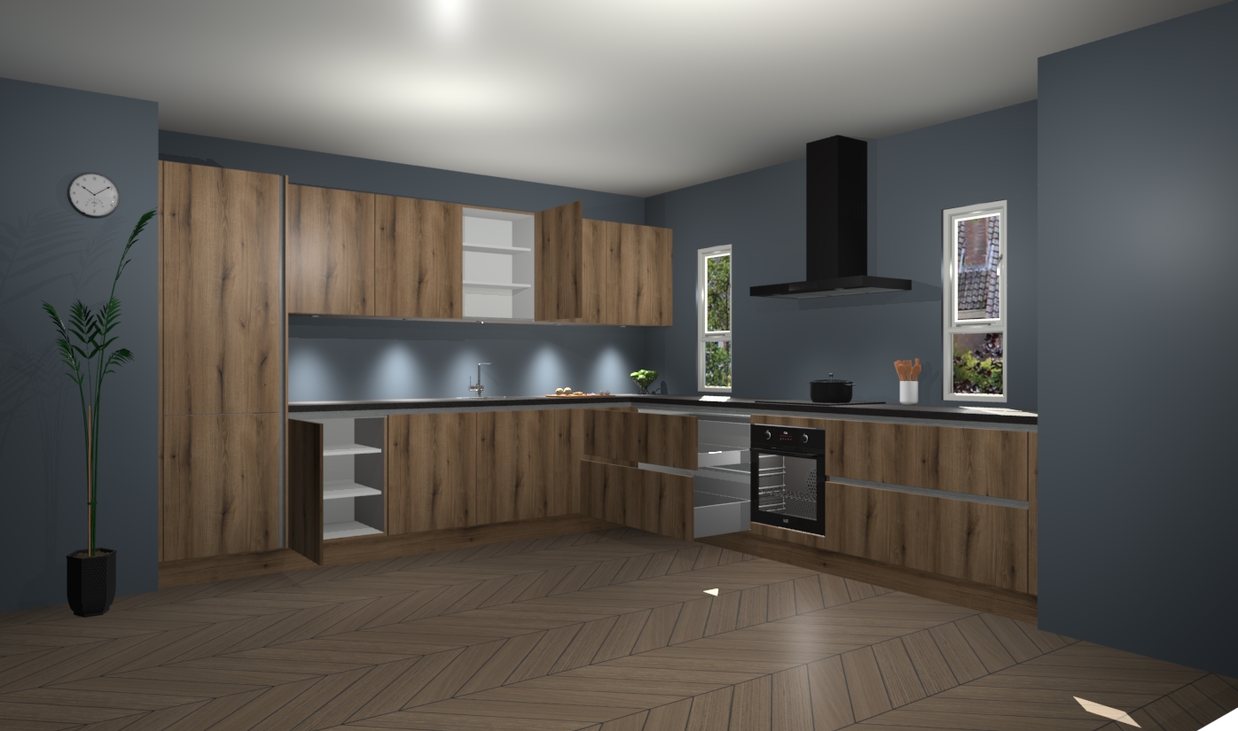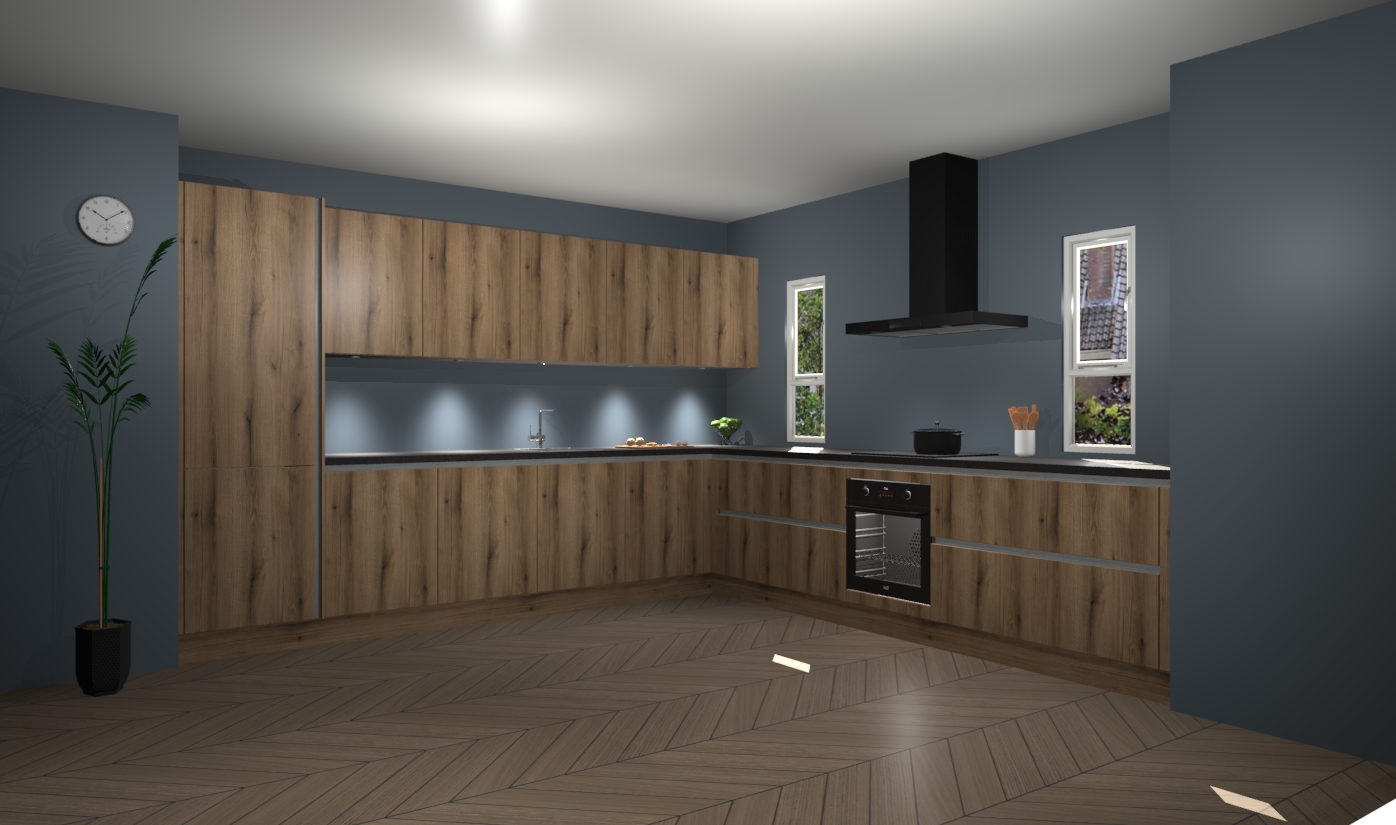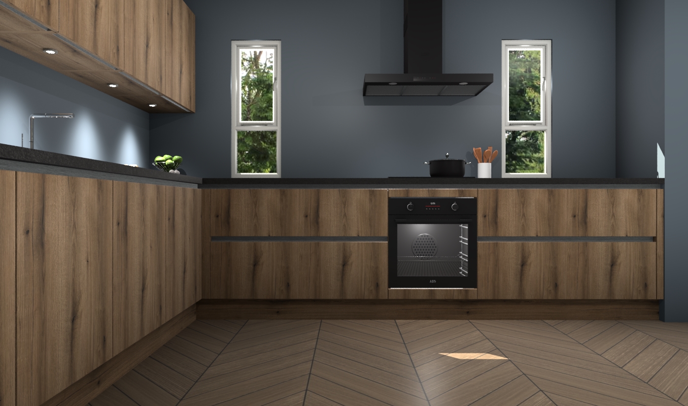 De goud eiken greeploze keuken is een ideale hoekkeuken en heeft alle functies en apparatuur die u maar nodig kunt hebben. Bij de bestelling krijgt u een oven, inductiekookplaat, afzuigkap, vaatwasser en koelkast - deze kunnen desgewenst eenvoudig worden uitgebreid naar AEG na bestellen. Elke kast wordt ook voor gemonteerd geleverd met soft close deuren die jarenlang gebruik beloven. Stelt u zich voor dat u geen gedoe heeft met vervelende montage - vanaf het moment dat u uw bestelling plaats, duurt het slechts 7 weken voor het bij u thuis geleverd wordt.