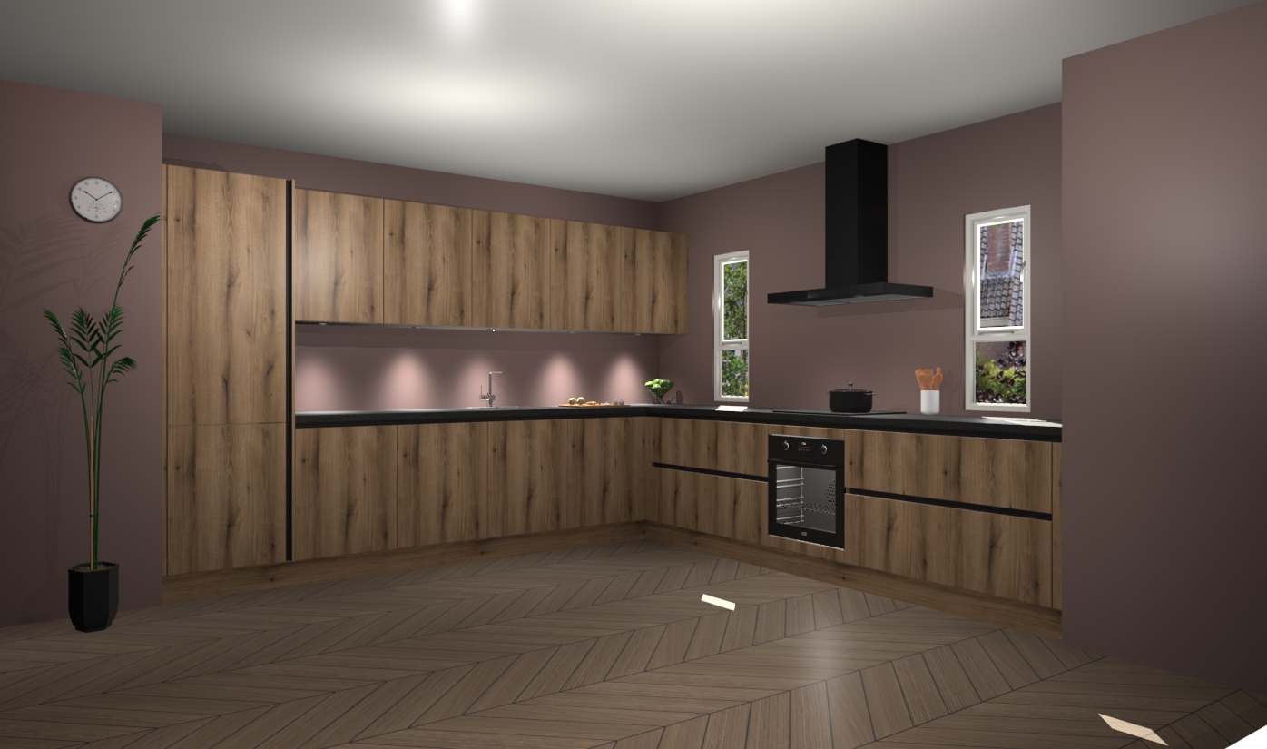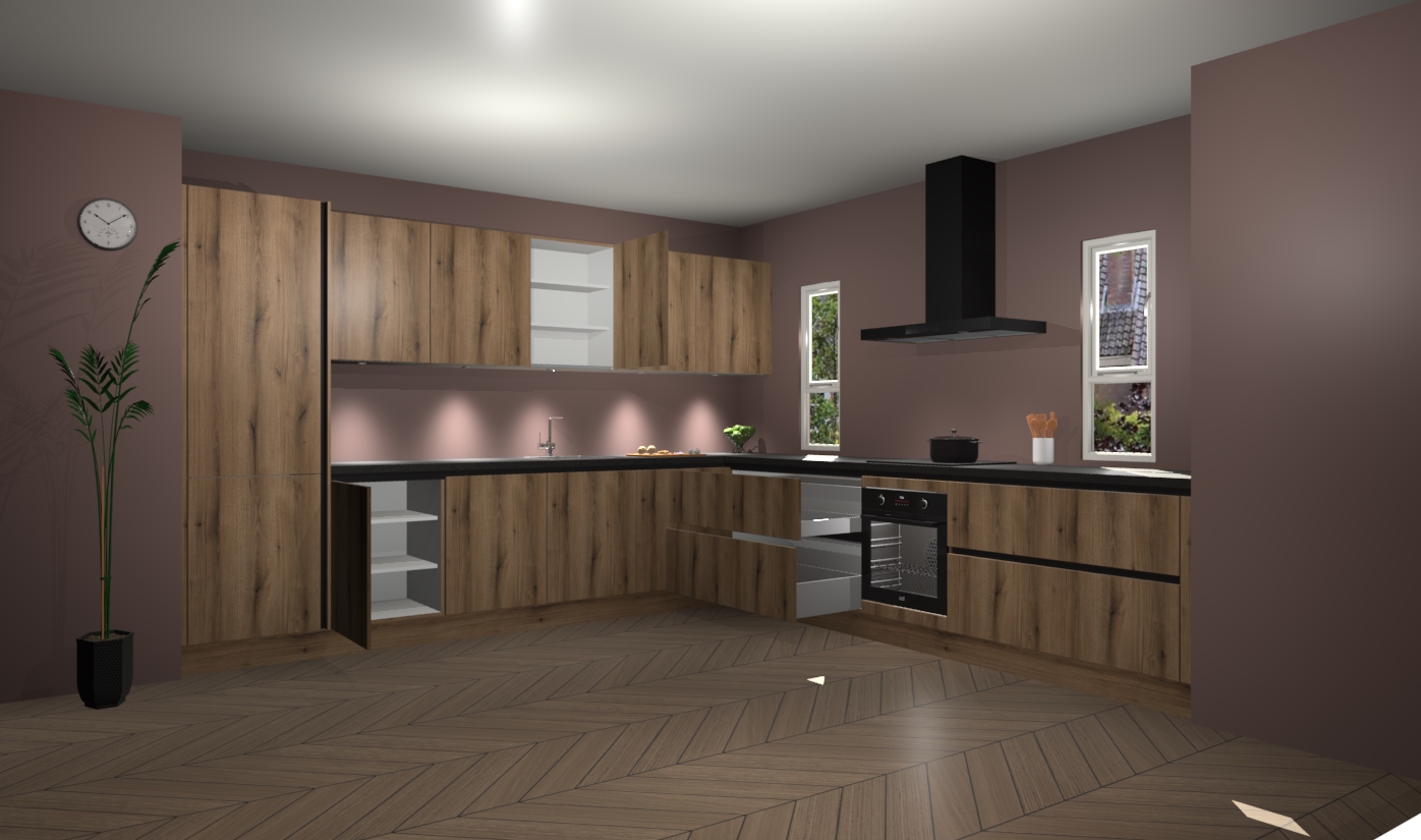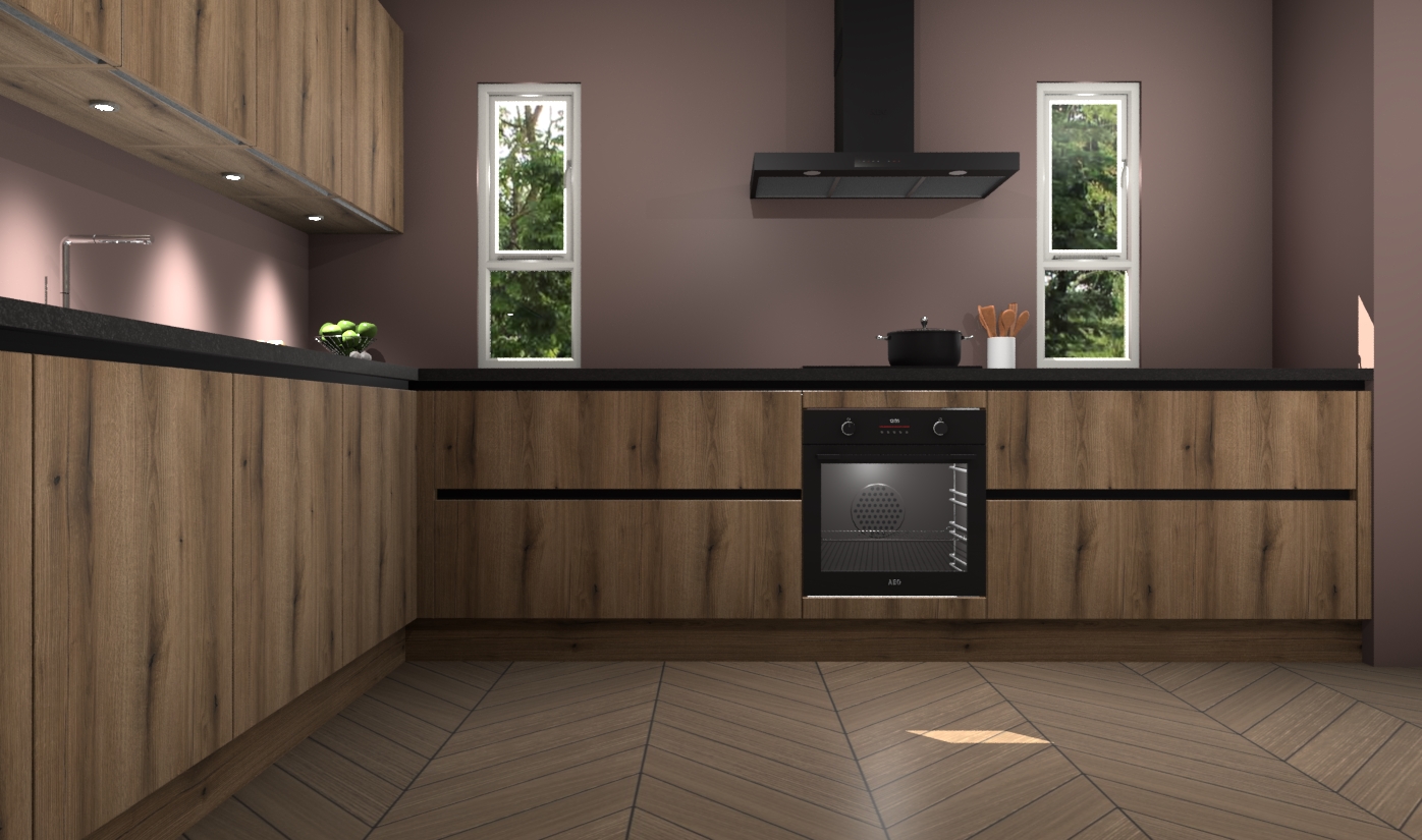 De goud eiken greeploze keuken is een ideale hoekkeuken en heeft alle functies en apparatuur die u maar nodig kunt hebben. Bij de bestelling krijgt u een oven, inductiekookplaat, afzuigkap, vaatwasser en koelkast - deze kunnen desgewenst eenvoudig worden uitgebreid naar AEG na bestellen. Elke kast wordt ook voor gemonteerd geleverd met soft close deuren die jarenlang gebruik beloven. Stelt u zich voor dat u geen gedoe heeft met vervelende montage - vanaf het moment dat u uw bestelling plaats, duurt het slechts 7 weken voor het bij u thuis geleverd wordt.