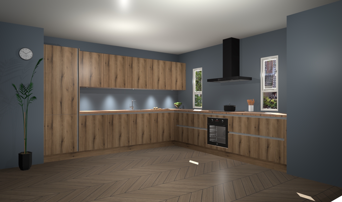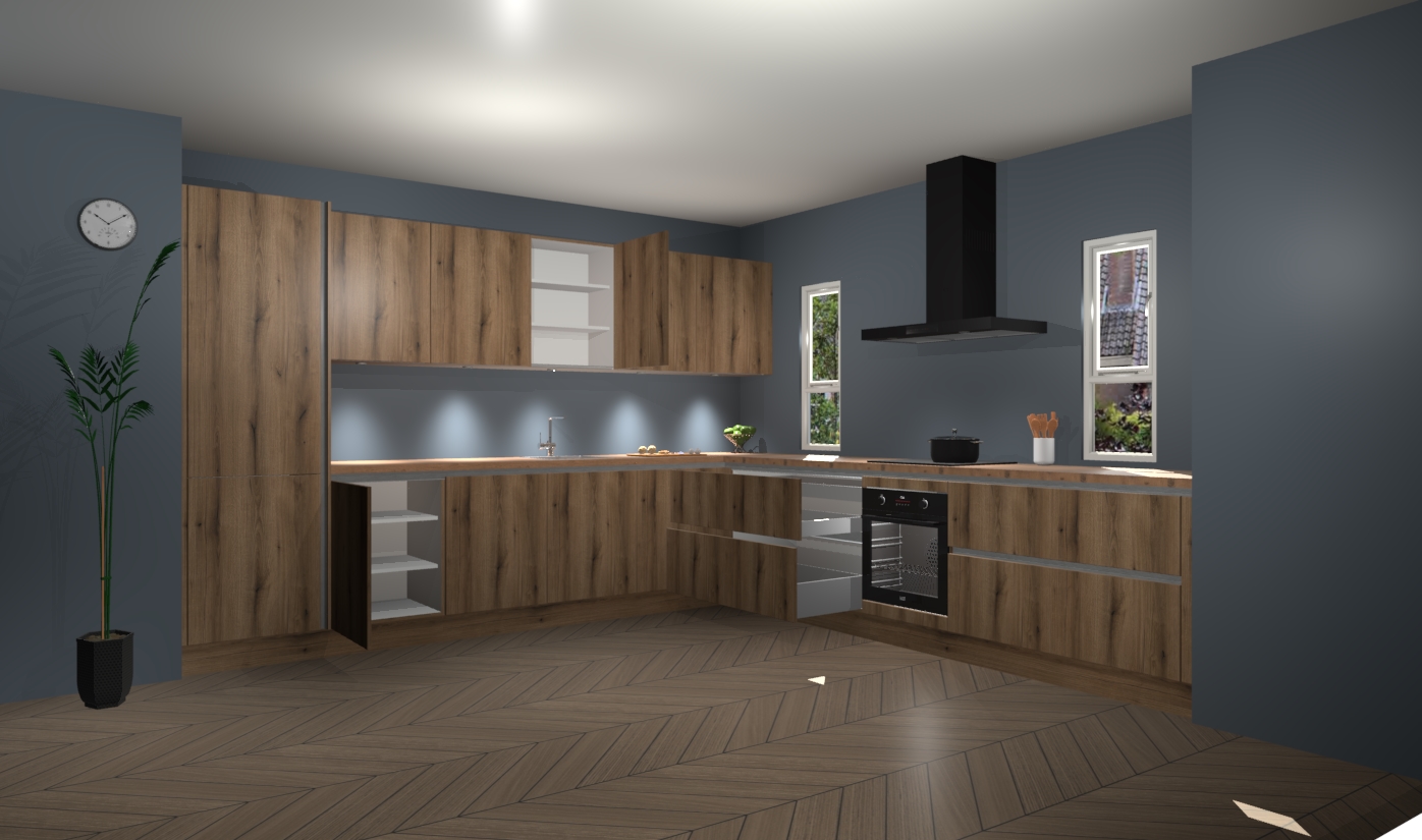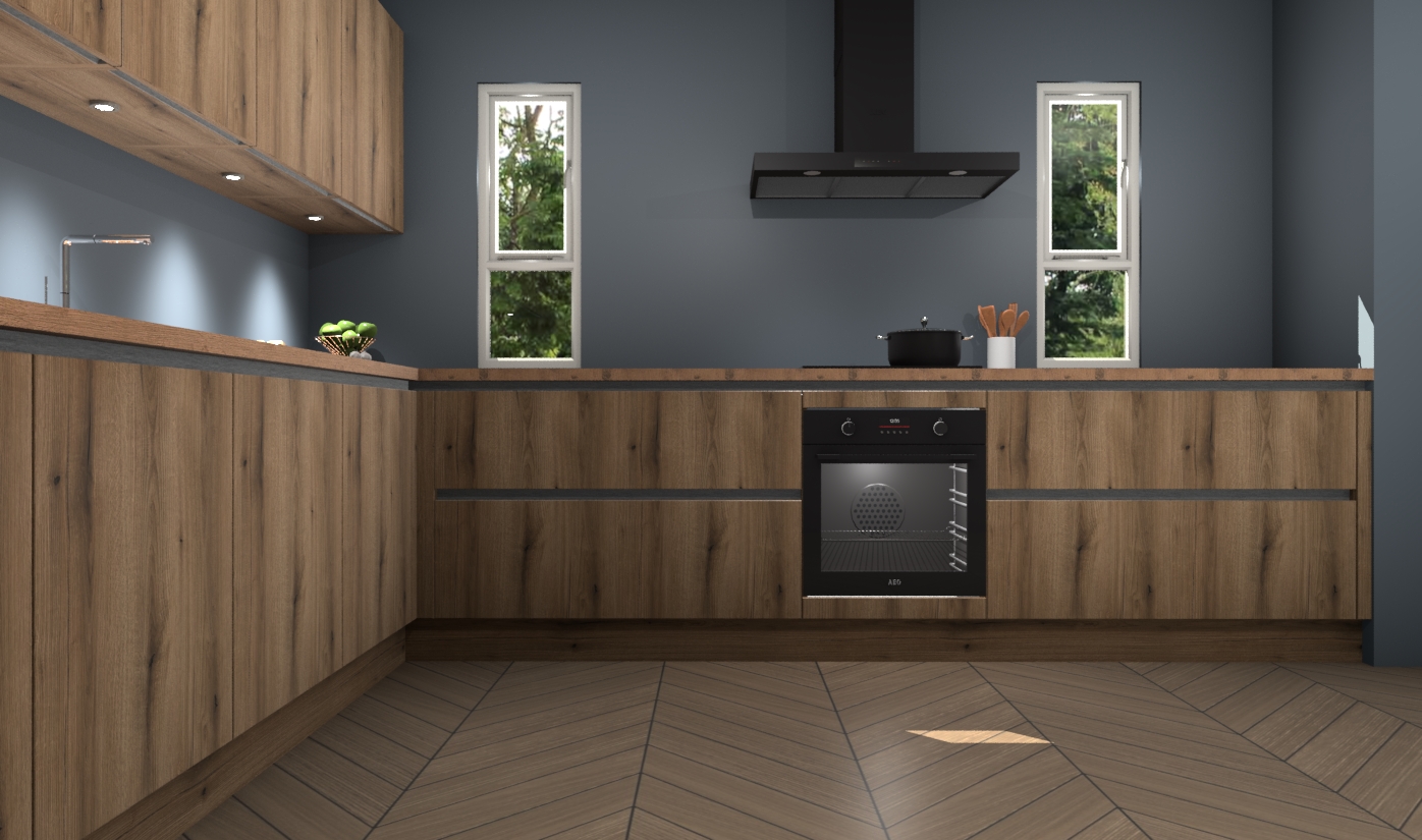 De goud eiken greeploze keuken is een ideale hoekkeuken en heeft alle functies en apparatuur die u maar nodig kunt hebben. Bij de bestelling krijgt u een oven, inductiekookplaat, afzuigkap, vaatwasser en koelkast - deze kunnen desgewenst eenvoudig worden uitgebreid naar AEG na bestellen. Elke kast wordt ook voor gemonteerd geleverd met soft close deuren die jarenlang gebruik beloven. Stelt u zich voor dat u geen gedoe heeft met vervelende montage - vanaf het moment dat u uw bestelling plaats, duurt het slechts 7 weken voor het bij u thuis geleverd wordt.