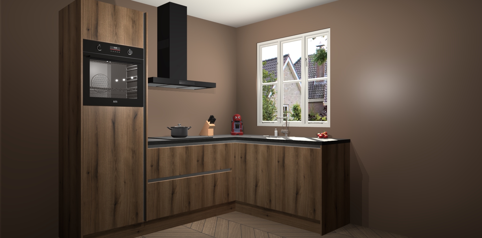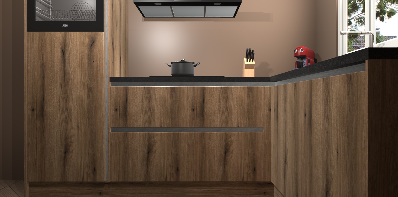 Dit model biedt u voldoende opbergruimte en vijf ingebouwde apparaten: een oven, inductiekookplaat, afzuigkap, vaatwasser en koelkast. Deze apparaten kunnen gemakkelijk worden geüpgrade naar AEG nadat u besteld heeft. De verschillende laden en kastjes bevatten softclose-deuren waardoor ze gezellig dichtvallen met een geruststellend helemaal geruisloos geluid. En dat is nog niet alles! We garanderen ook dat de prijs altijd laag blijft - dus haal nu uw Goud Eiken greeploze keuken Victoria terwijl het kan.