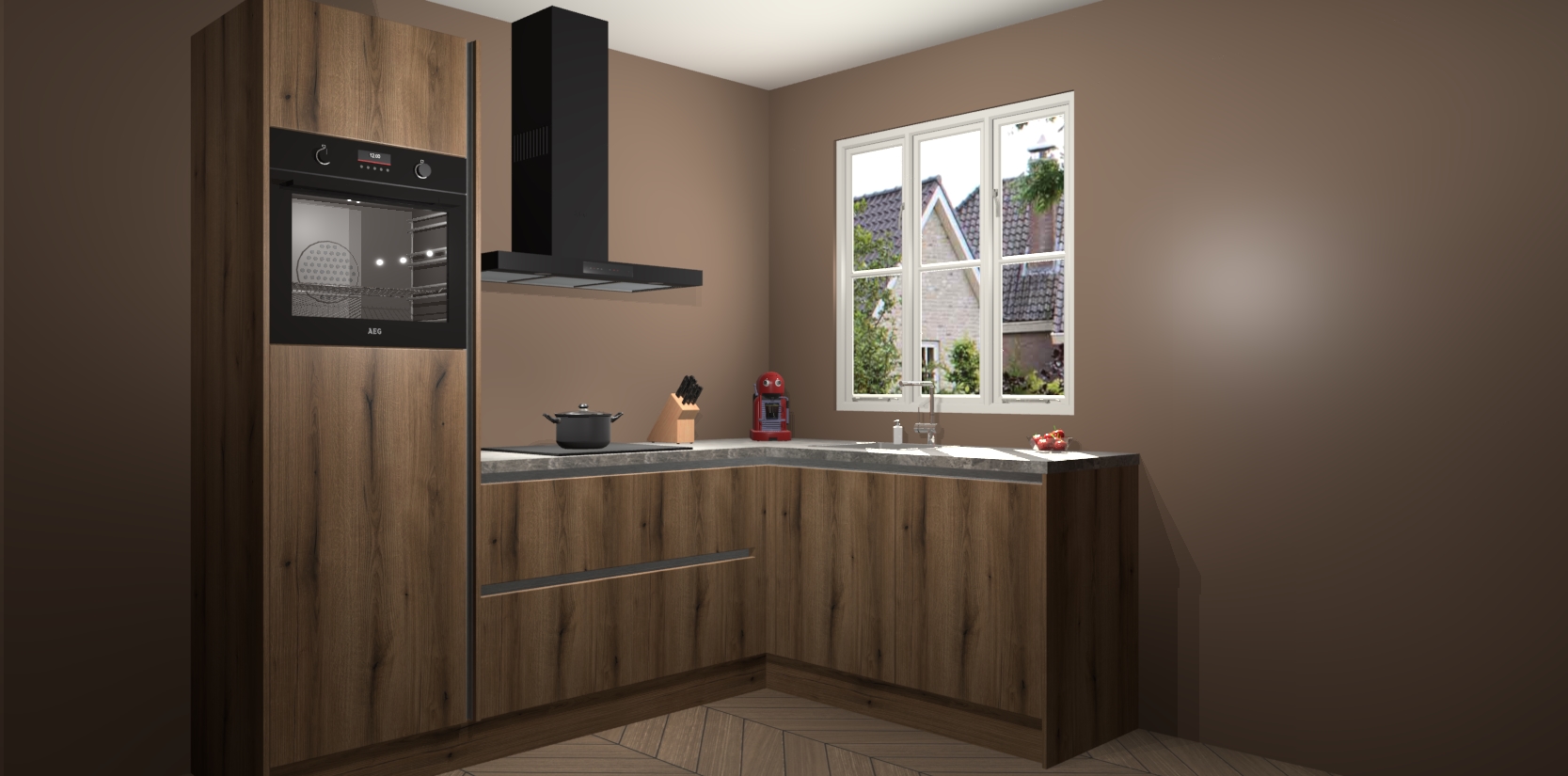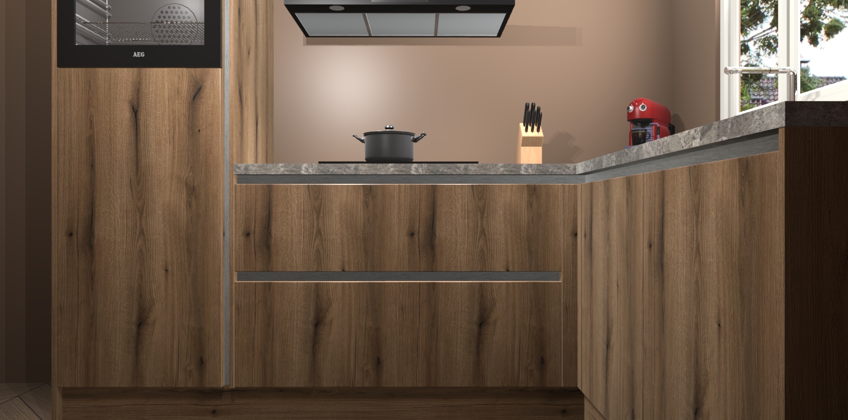 Dit model biedt u voldoende opbergruimte en vijf ingebouwde apparaten: een oven, inductiekookplaat, afzuigkap, vaatwasser en koelkast. Deze apparaten kunnen gemakkelijk worden geüpgrade naar AEG nadat u besteld heeft. De verschillende laden en kastjes bevatten softclose-deuren waardoor ze gezellig dichtvallen met een geruststellend helemaal geruisloos geluid. En dat is nog niet alles! We garanderen ook dat de prijs altijd laag blijft - dus haal nu uw Goud Eiken greeploze keuken Victoria terwijl het kan.