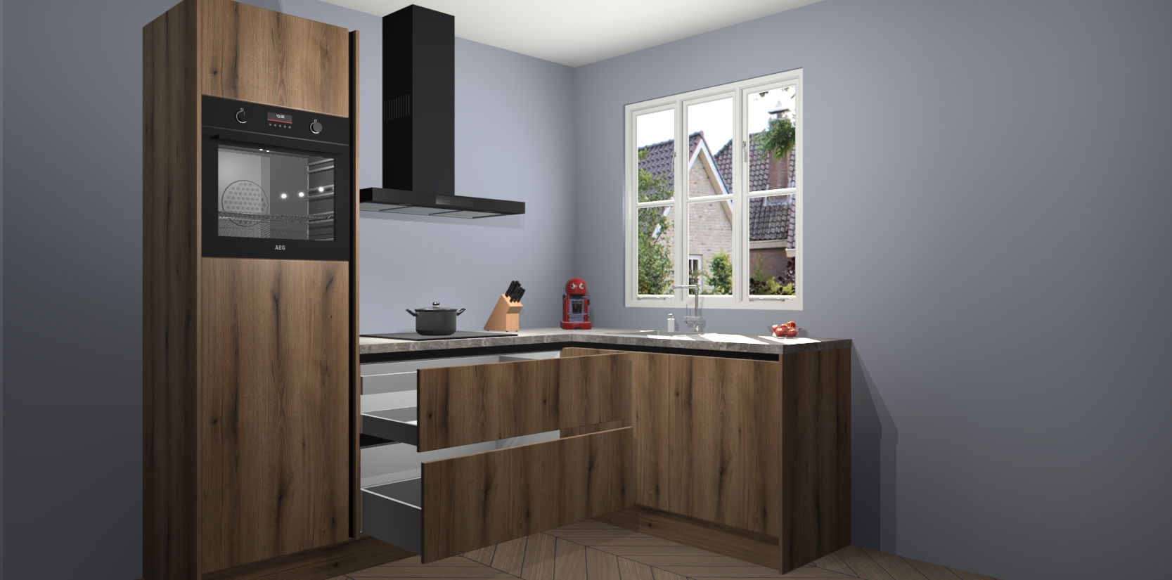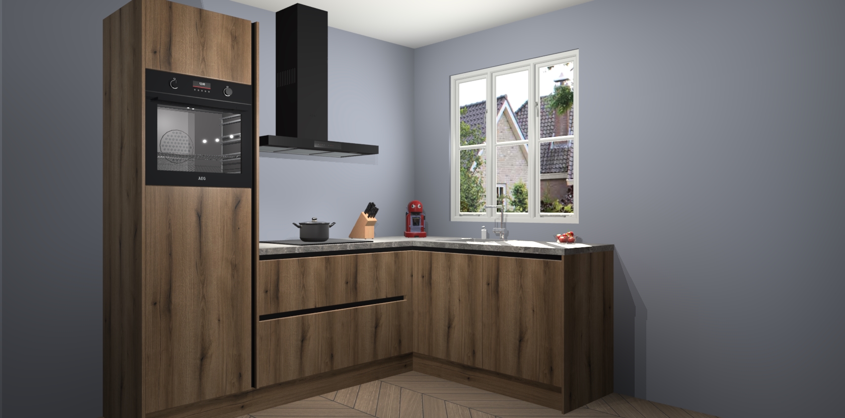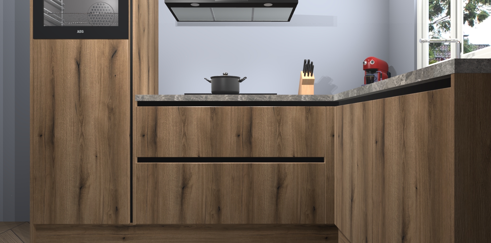 Dit model biedt u voldoende opbergruimte en vijf ingebouwde apparaten: een oven, inductiekookplaat, afzuigkap, vaatwasser en koelkast. Deze apparaten kunnen gemakkelijk worden geüpgrade naar AEG nadat u besteld heeft. De verschillende laden en kastjes bevatten softclose-deuren waardoor ze gezellig dichtvallen met een geruststellend helemaal geruisloos geluid. En dat is nog niet alles! We garanderen ook dat de prijs altijd laag blijft - dus haal nu uw Goud Eiken greeploze keuken Victoria terwijl het kan.