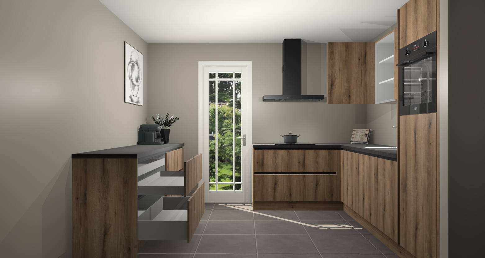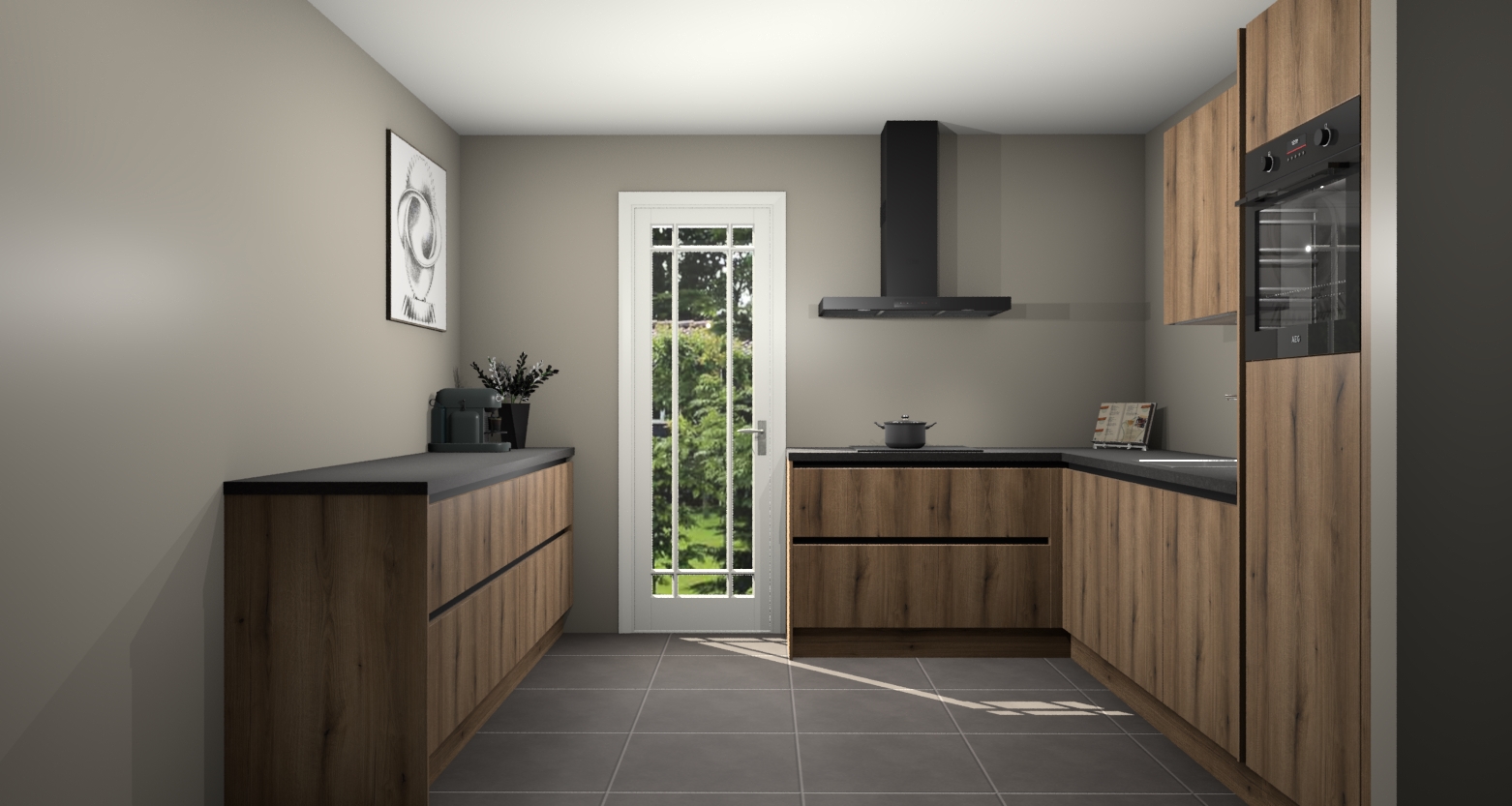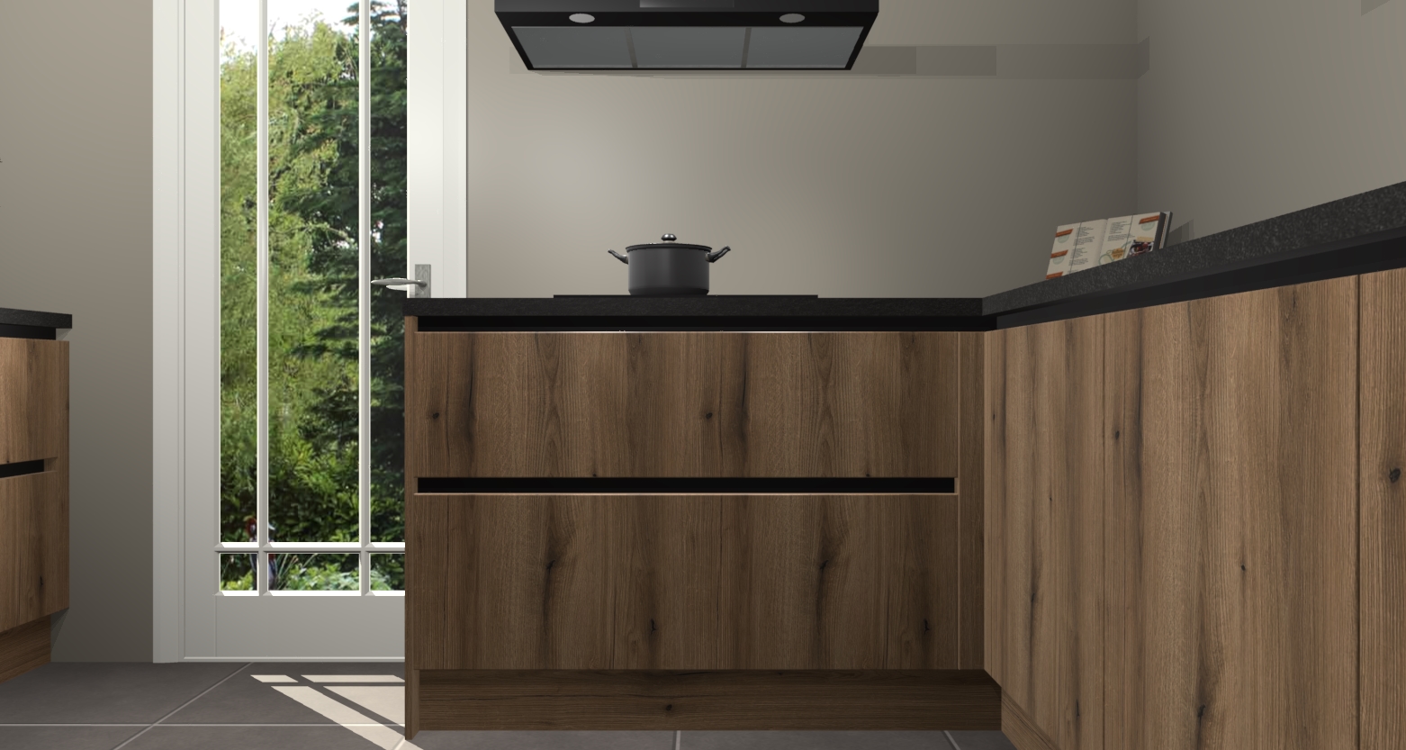 Maak kennis met de Goud eiken greeploze keuken Visby, een prachtige hoekkeuken met een warme houten look en een modern design. Dit opmerkelijke meubelstuk is ontworpen om op te vallen in elke ruimte en geeft het een onmiskenbaar vleugje verfijning en elegantie.