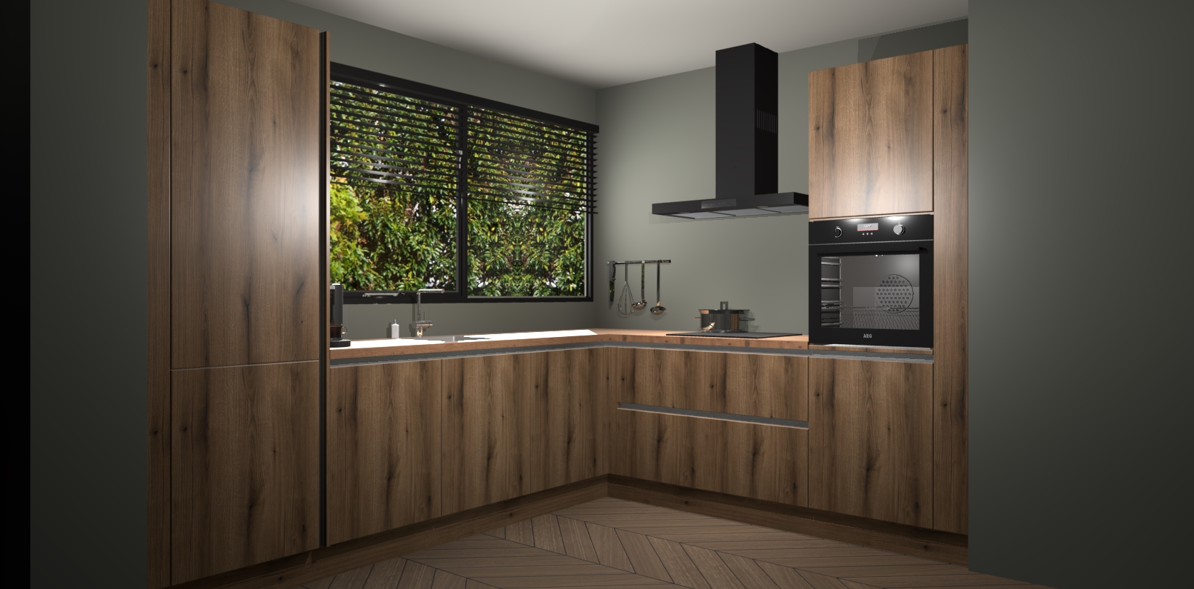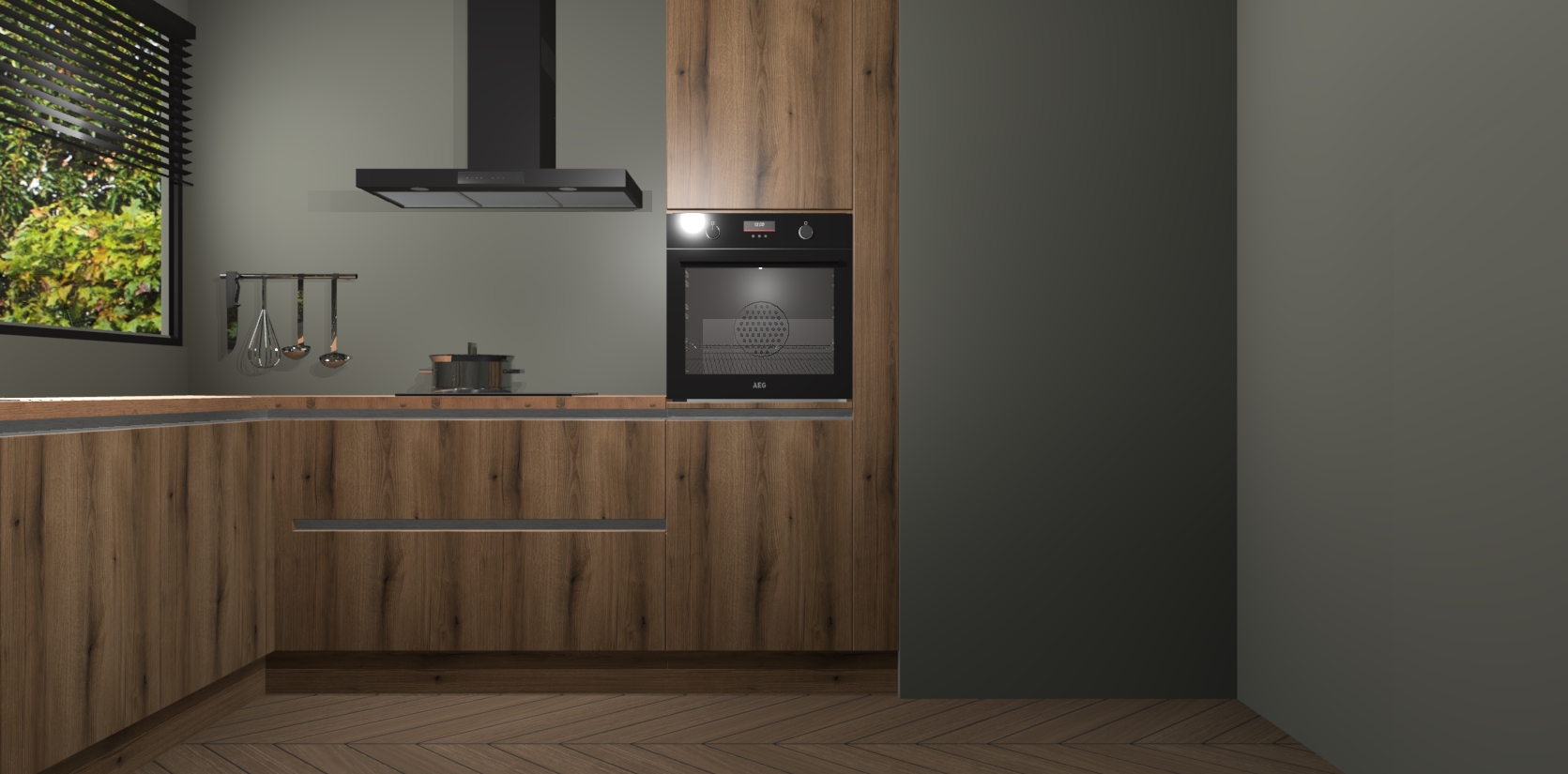 Met een modern, tijdloos design en ruime opslagruimte, zult u zich in no-time thuis voelen in uw nieuwe keuken. Uw leven wordt eenvoudiger met de soft-close deuren die voor het ultieme stille comfort zorgen - geen geluid dat u stoort terwijl u kookt. Ook is de keuken voorzien van 5 ingebouwde apparaten: een oven, inductie kookplaat, afzuigkap, vaatwasser en koelkast. Deze kunnen gemakkelijk na bestelling worden bijgewerkt naar AEG - waardoor uw luxe ervaring compleet is.