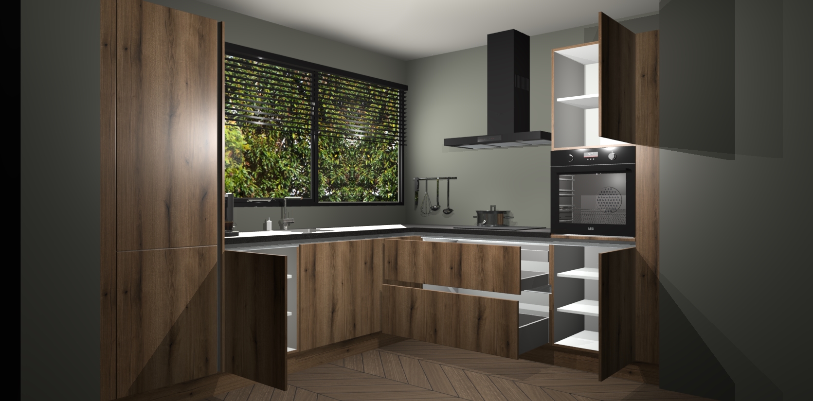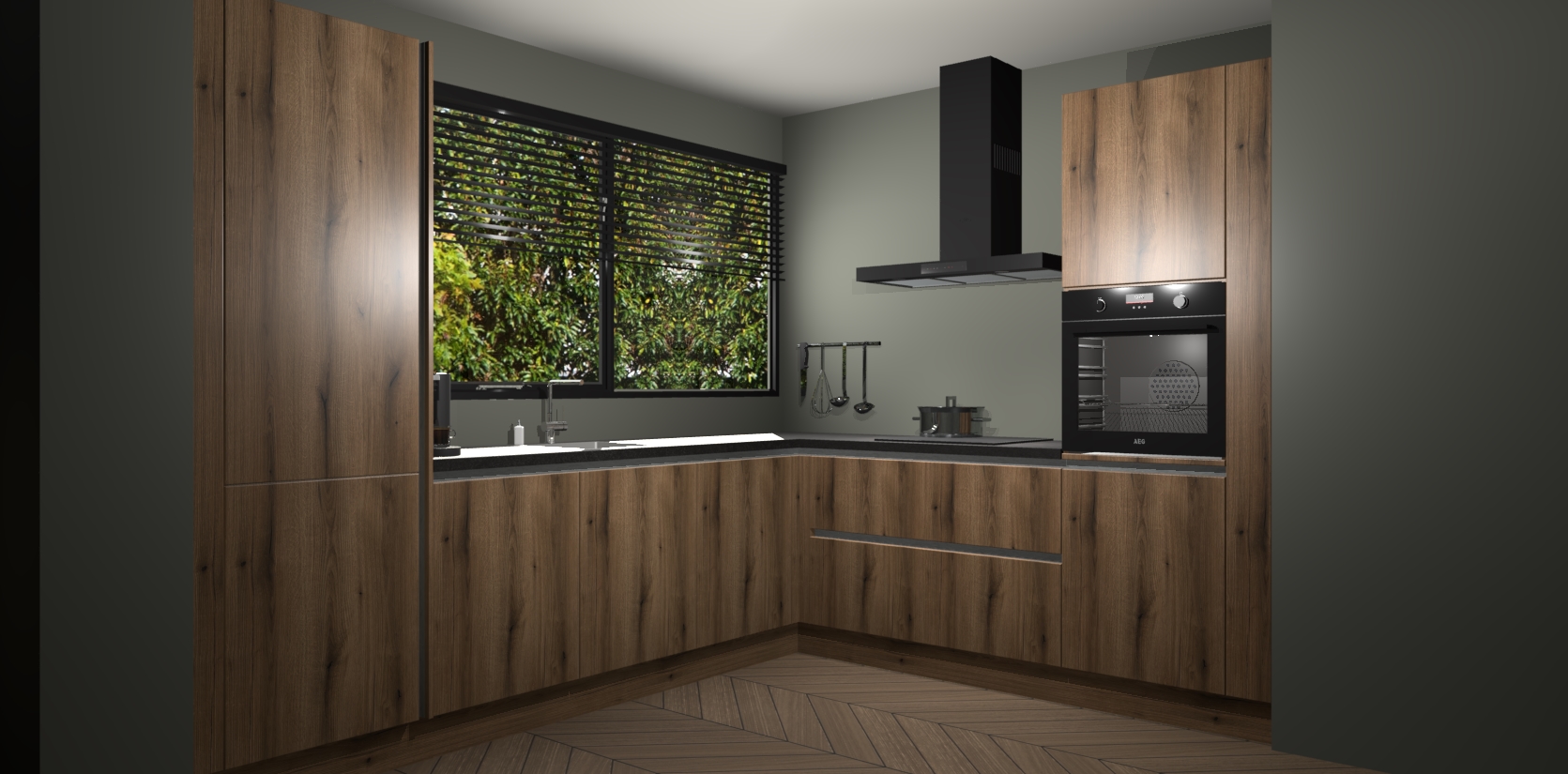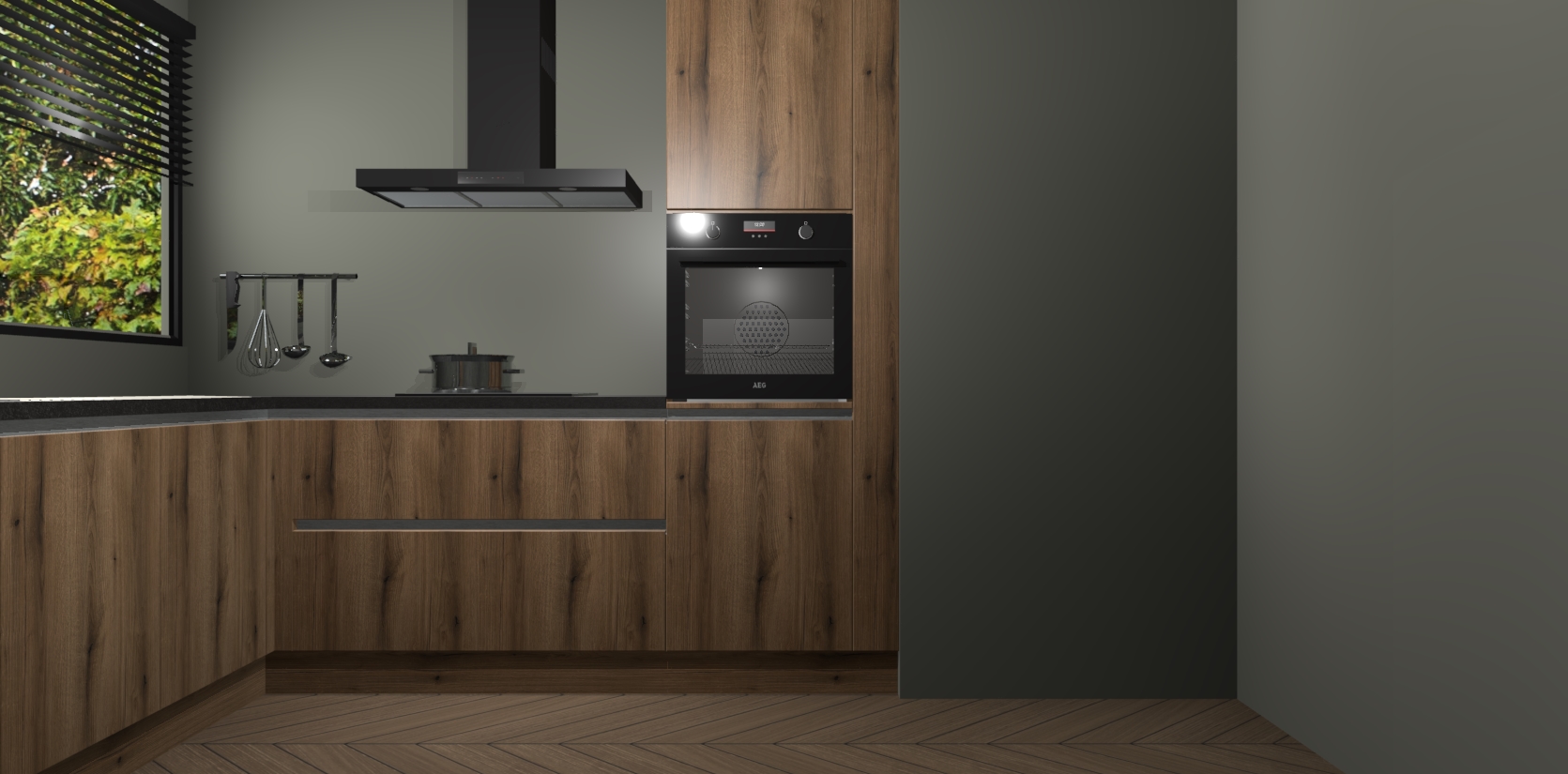 Met een modern, tijdloos design en ruime opslagruimte, zult u zich in no-time thuis voelen in uw nieuwe keuken. Uw leven wordt eenvoudiger met de soft-close deuren die voor het ultieme stille comfort zorgen - geen geluid dat u stoort terwijl u kookt. Ook is de keuken voorzien van 5 ingebouwde apparaten: een oven, inductie kookplaat, afzuigkap, vaatwasser en koelkast. Deze kunnen gemakkelijk na bestelling worden bijgewerkt naar AEG - waardoor uw luxe ervaring compleet is.