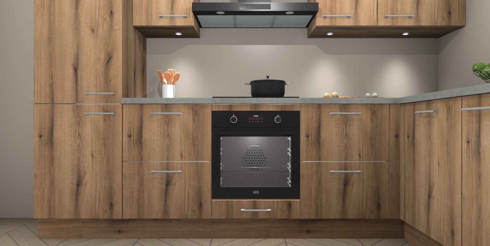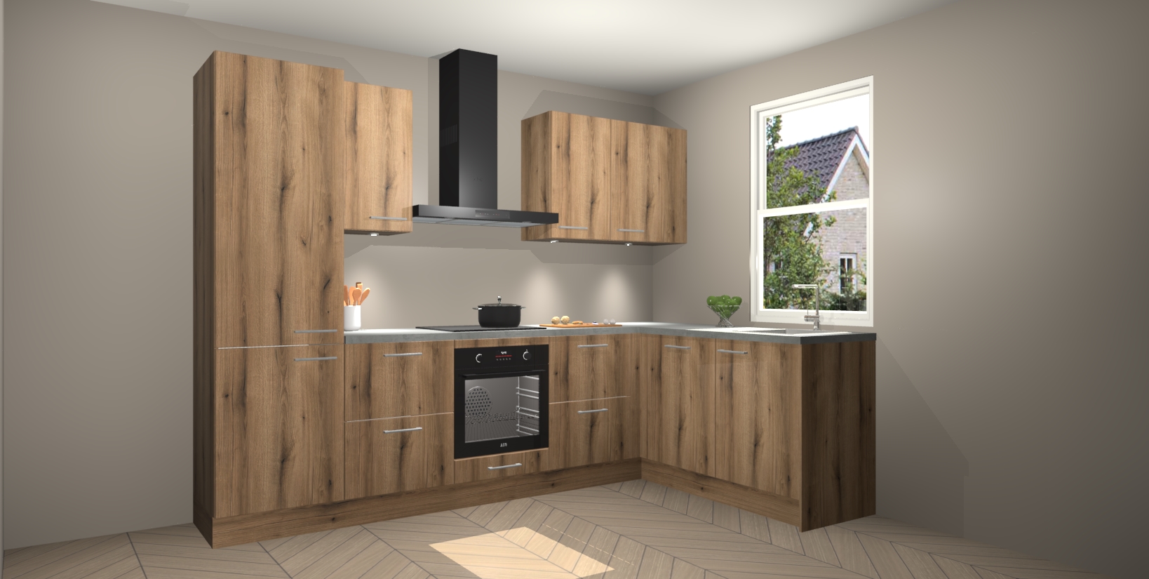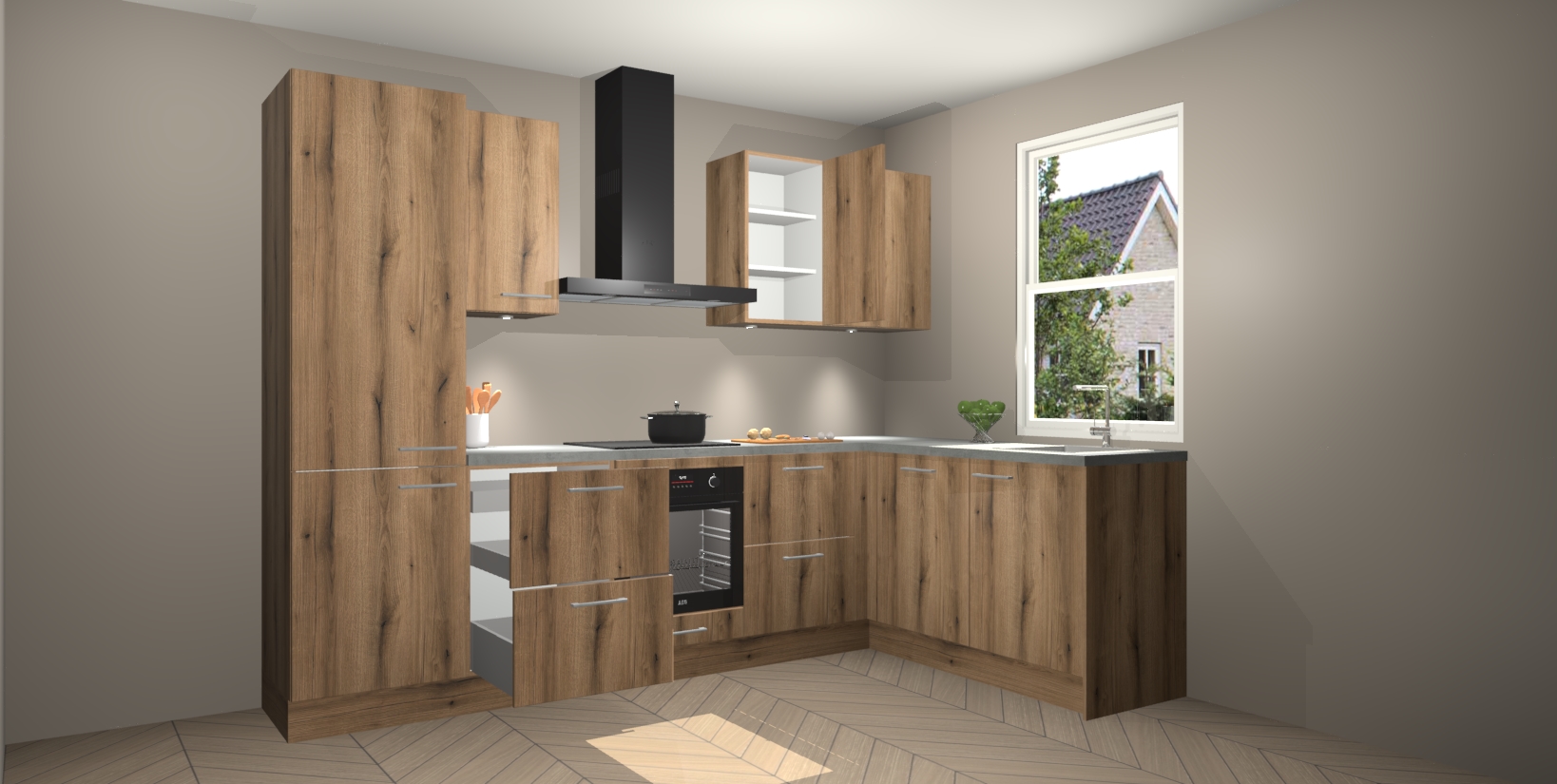 Maak kennis met de trendsettende en luxe Goud Eiken keuken Bazel! Deze uitzonderlijke keuken van Duitse kwaliteit is stijlvol, modern en perfect om elk huis mee op te fleuren. De binnenkant van de kasten worden meegenomen in een bijpassende kleur om een samenhangende eigentijdse esthetiek te voltooien. U zult dol zijn op hoe uw pas gerenoveerde keuken eruitziet met de Goud Eiken editie!