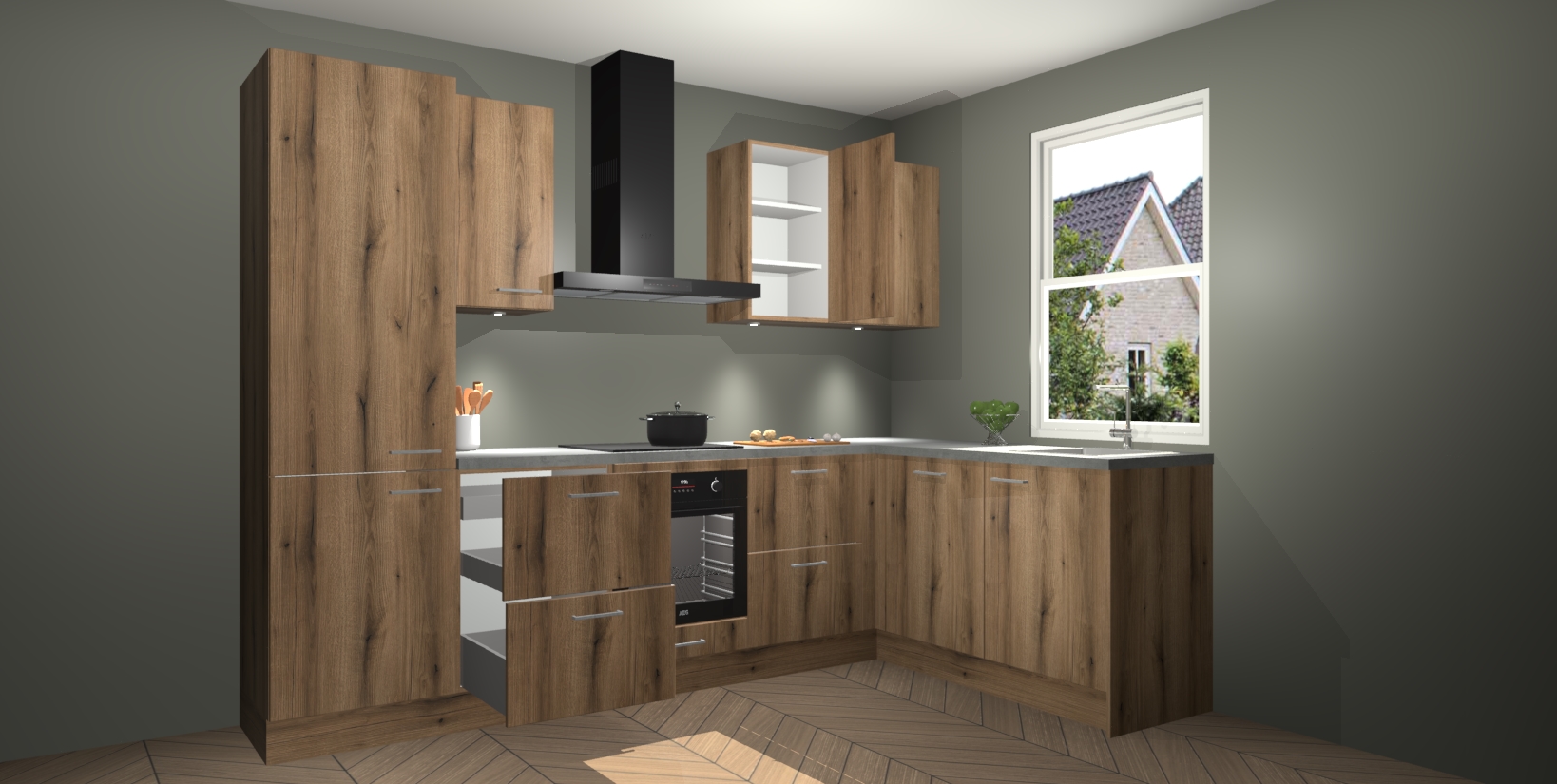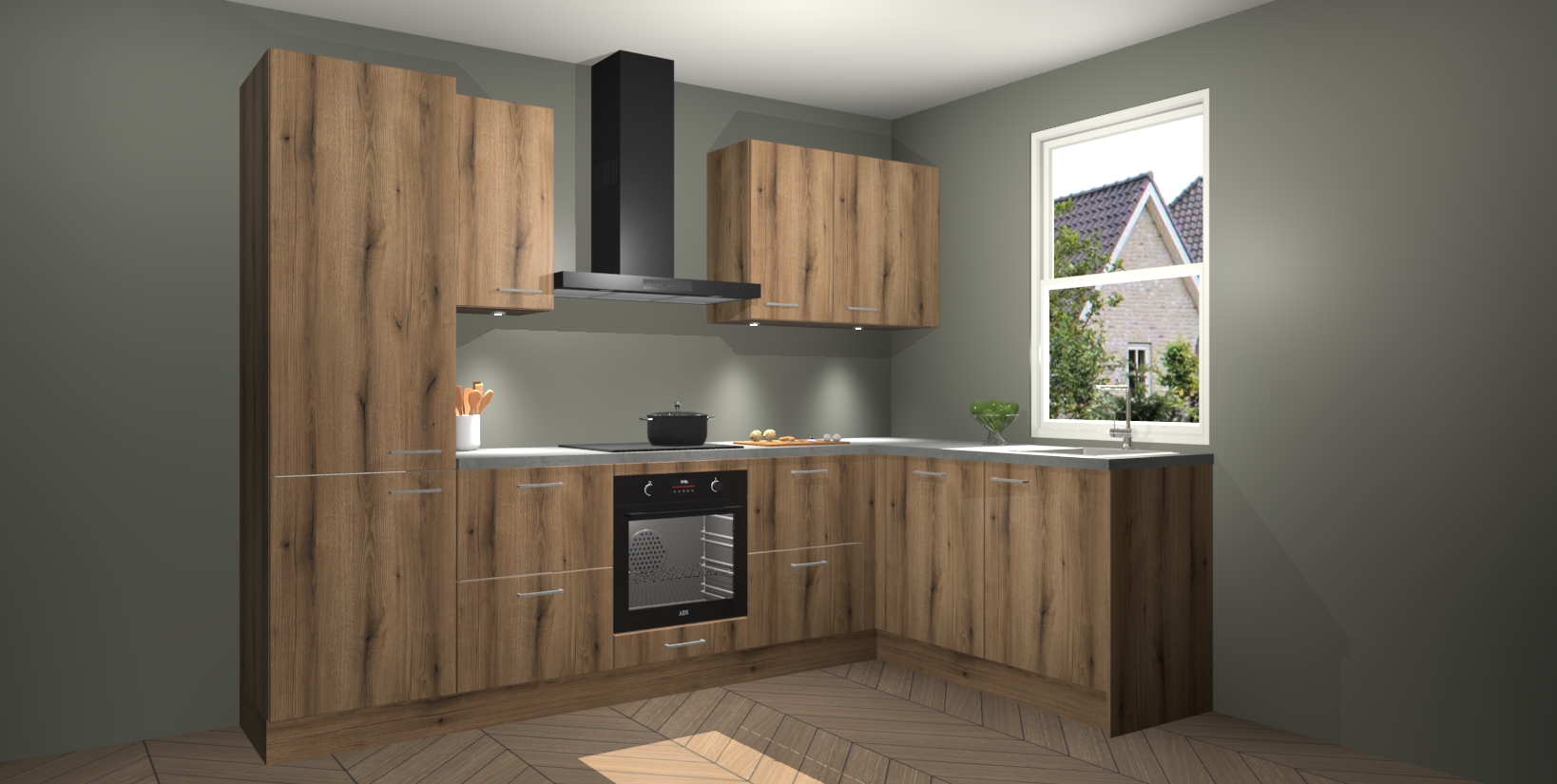 Maak kennis met de trendsettende en luxe Goud Eiken keuken Bazel! Deze uitzonderlijke keuken van Duitse kwaliteit is stijlvol, modern en perfect om elk huis mee op te fleuren. De binnenkant van de kasten worden meegenomen in een bijpassende kleur om een samenhangende eigentijdse esthetiek te voltooien. U zult dol zijn op hoe uw pas gerenoveerde keuken eruitziet met de Goud Eiken editie!
