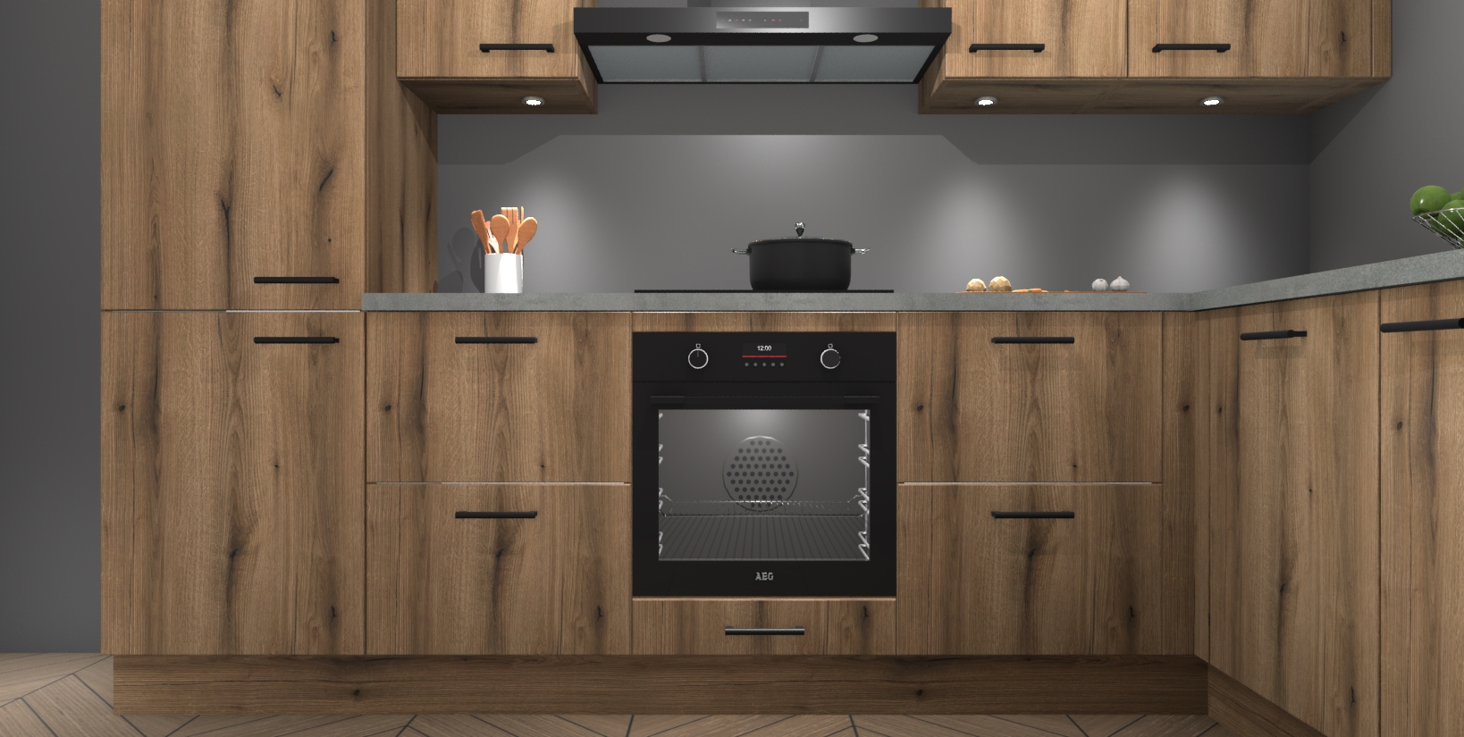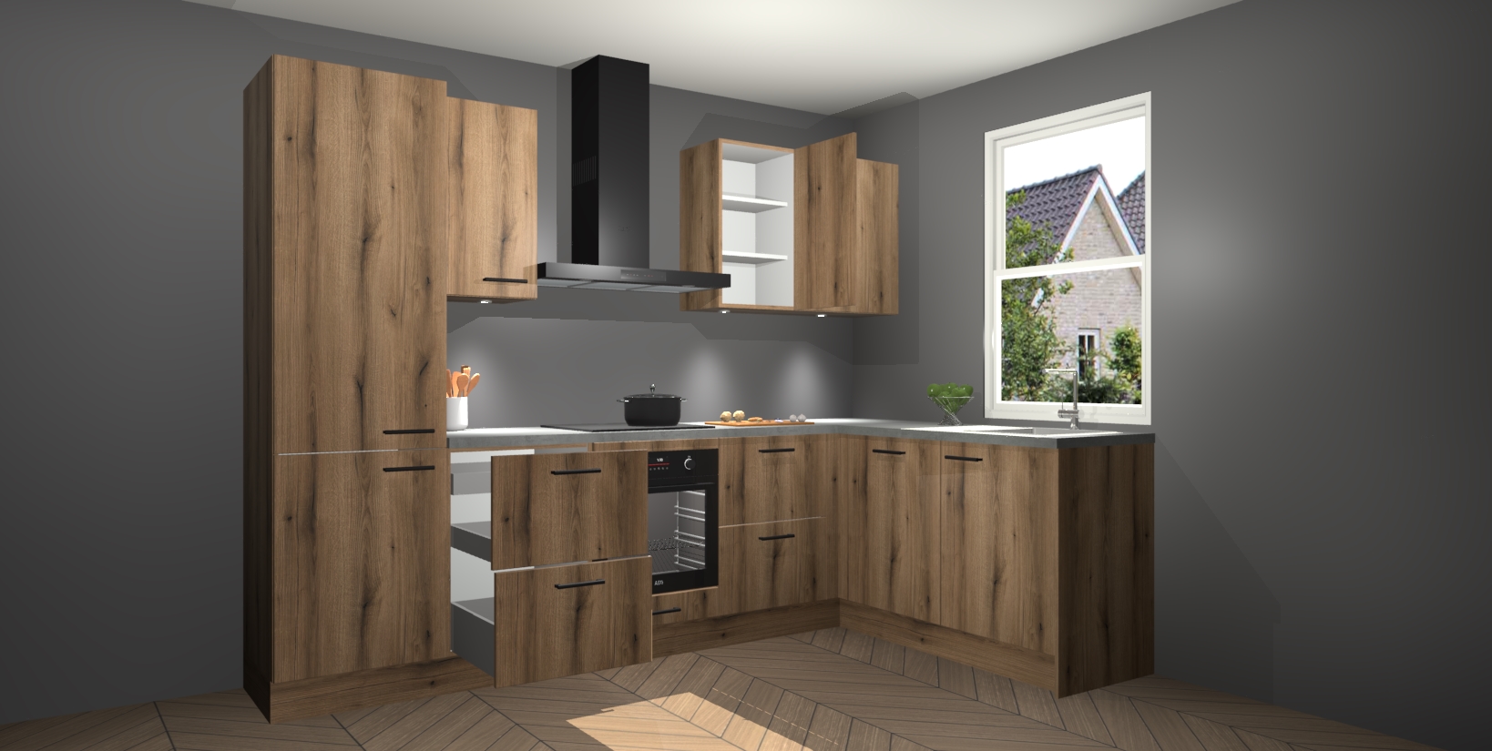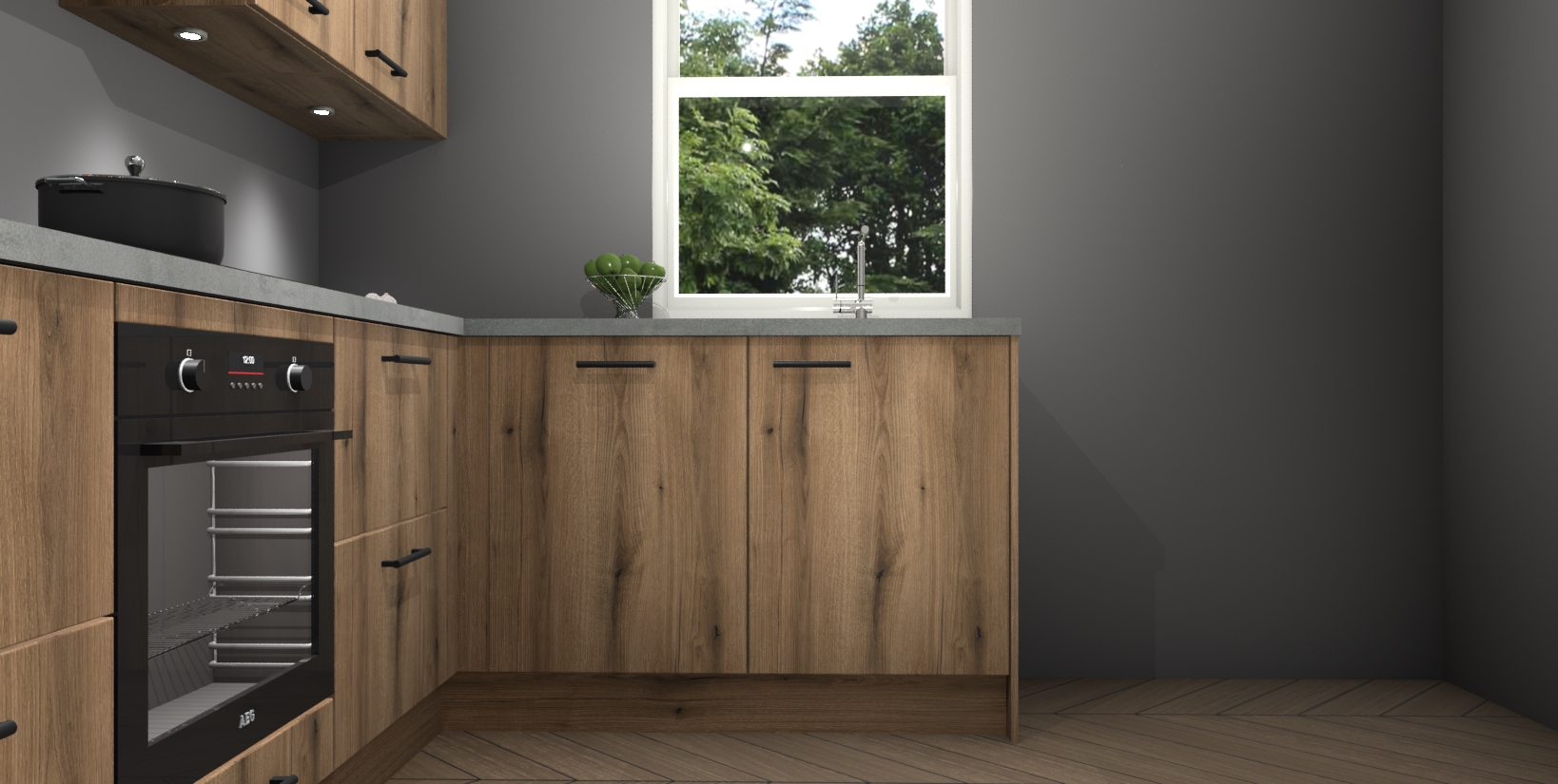 Maak kennis met de trendsettende en luxe Goud Eiken keuken Bazel! Deze uitzonderlijke keuken van Duitse kwaliteit is stijlvol, modern en perfect om elk huis mee op te fleuren. De binnenkant van de kasten worden meegenomen in een bijpassende kleur om een samenhangende eigentijdse esthetiek te voltooien. U zult dol zijn op hoe uw pas gerenoveerde keuken eruitziet met de Goud Eiken editie!