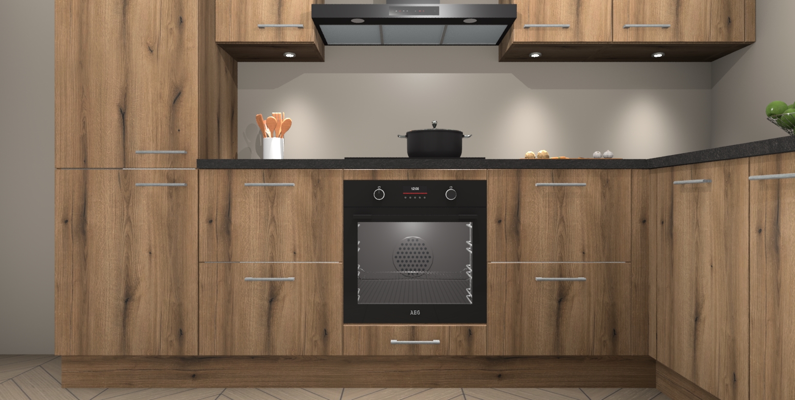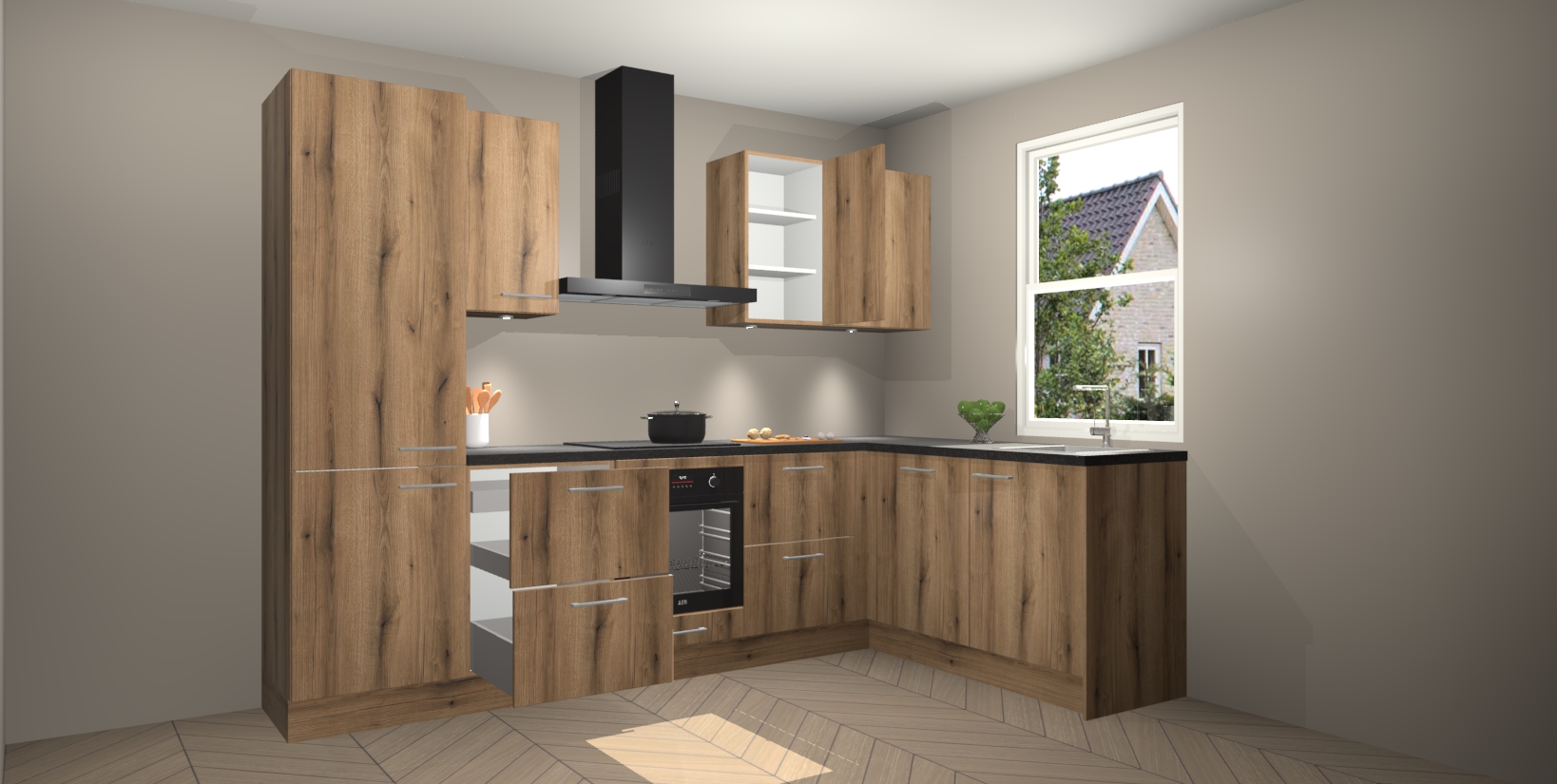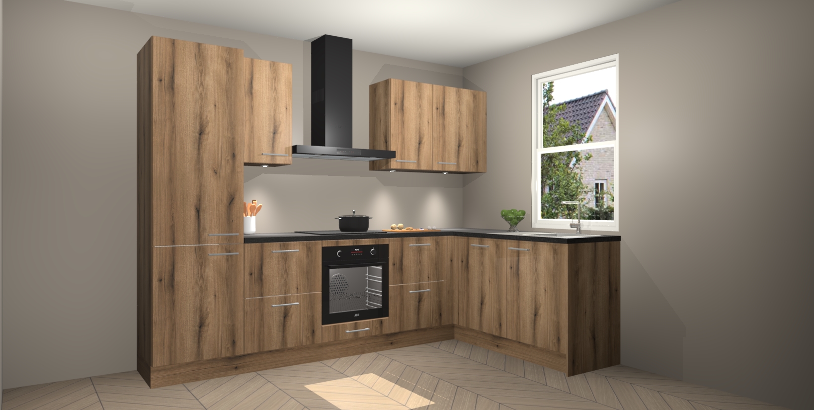 Maak kennis met de trendsettende en luxe Goud Eiken keuken Bazel! Deze uitzonderlijke keuken van Duitse kwaliteit is stijlvol, modern en perfect om elk huis mee op te fleuren. De binnenkant van de kasten worden meegenomen in een bijpassende kleur om een samenhangende eigentijdse esthetiek te voltooien. U zult dol zijn op hoe uw pas gerenoveerde keuken eruitziet met de Goud Eiken editie!