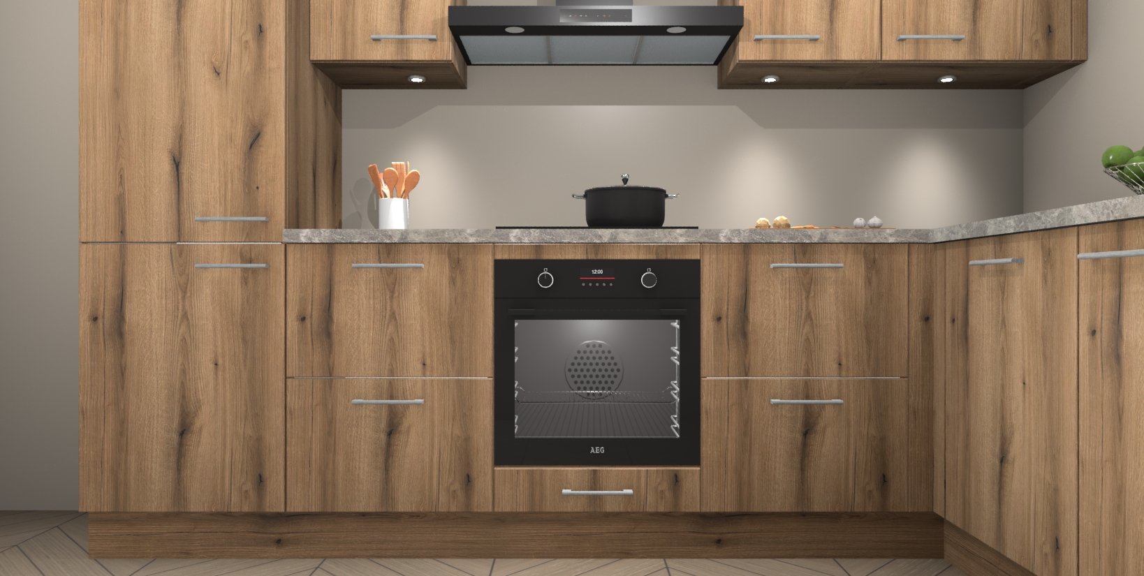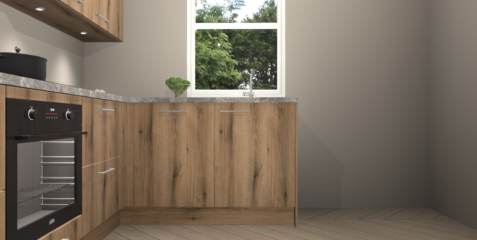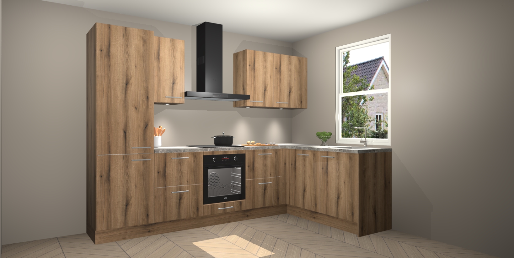 Maak kennis met de trendsettende en luxe Goud Eiken keuken Bazel! Deze uitzonderlijke keuken van Duitse kwaliteit is stijlvol, modern en perfect om elk huis mee op te fleuren. De binnenkant van de kasten worden meegenomen in een bijpassende kleur om een samenhangende eigentijdse esthetiek te voltooien. U zult dol zijn op hoe uw pas gerenoveerde keuken eruitziet met de Goud Eiken editie!