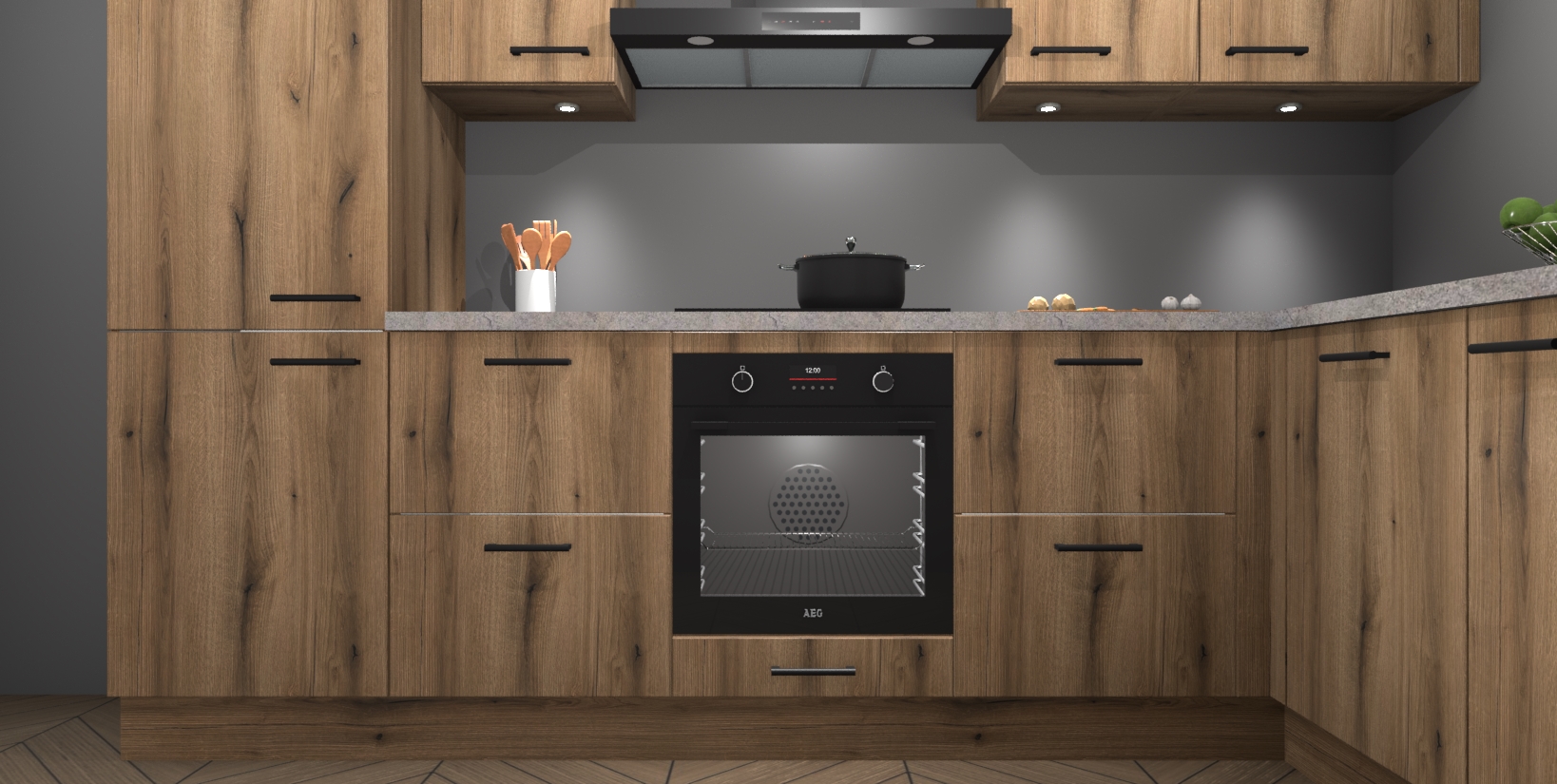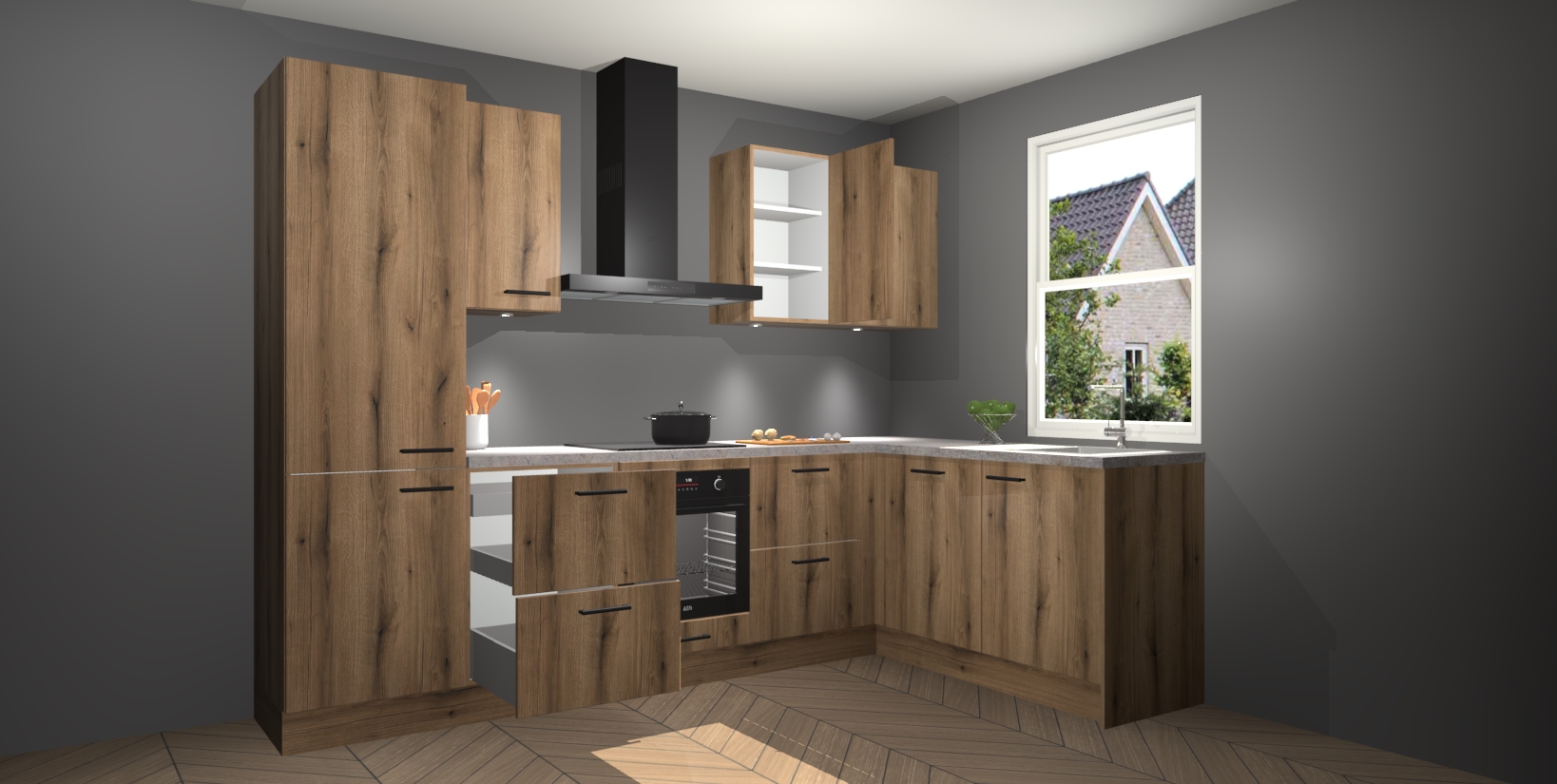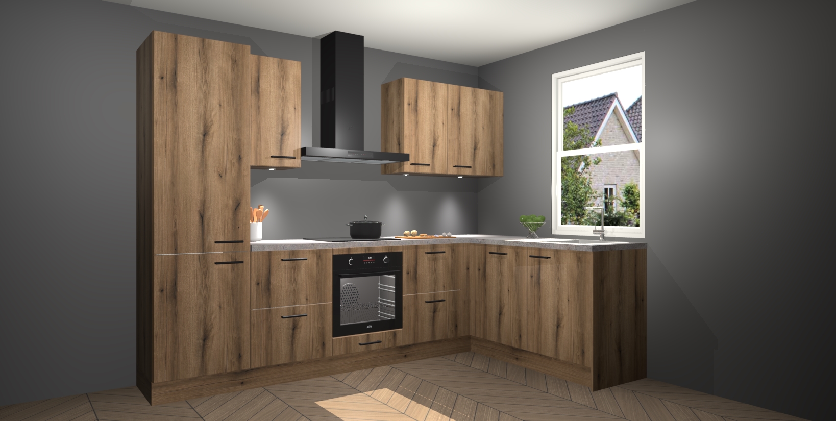 Maak kennis met de trendsettende en luxe Goud Eiken keuken Bazel! Deze uitzonderlijke keuken van Duitse kwaliteit is stijlvol, modern en perfect om elk huis mee op te fleuren. De binnenkant van de kasten worden meegenomen in een bijpassende kleur om een samenhangende eigentijdse esthetiek te voltooien. U zult dol zijn op hoe uw pas gerenoveerde keuken eruitziet met de Goud Eiken editie!