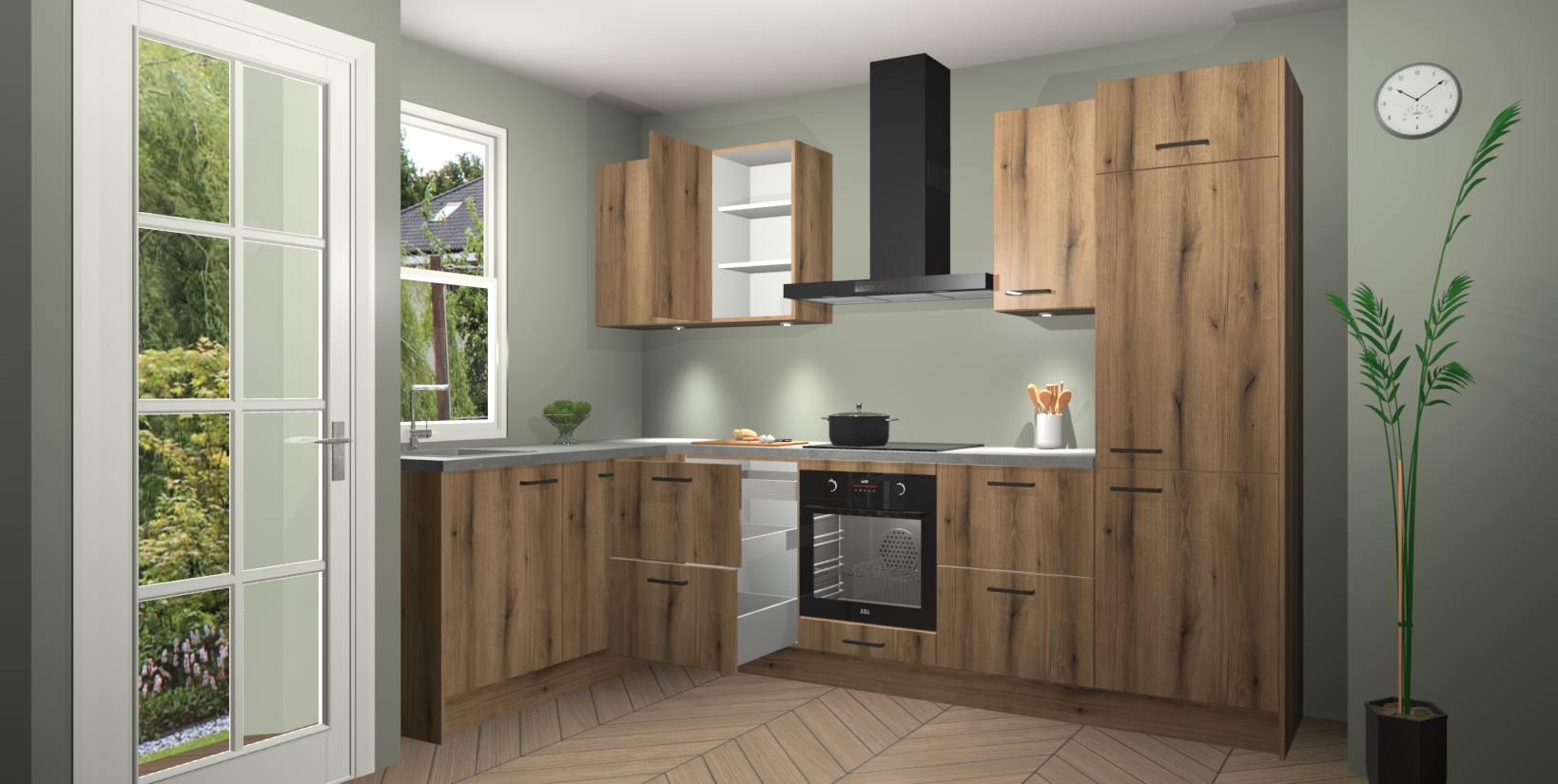 U hoeft zich ook geen zorgen te maken over een gebrek aan opbergruimte, want deze keuken heeft voldoende opbergmogelijkheden zowel boven als onder het aanrecht. Om het leven nog makkelijker te maken, wordt deze moderne hoekkeuken geleverd met 5 ingebouwde apparaten, waaronder een oven, inductiekookplaat, afzuigkap, vaatwasser en koelkast, zodat u in een mum van tijd klaar bent voor actie!