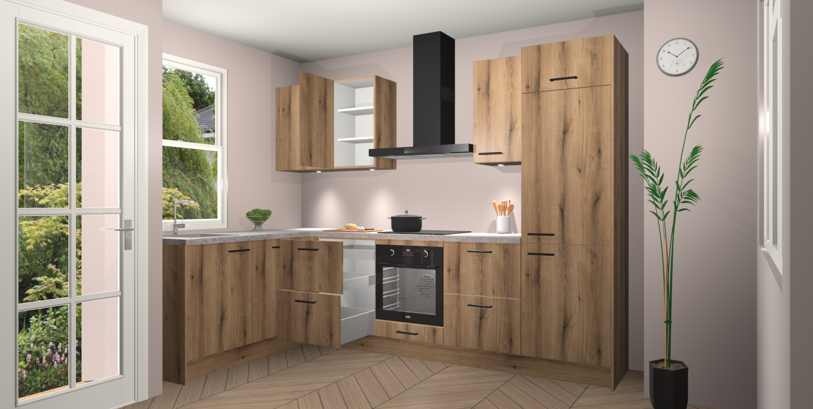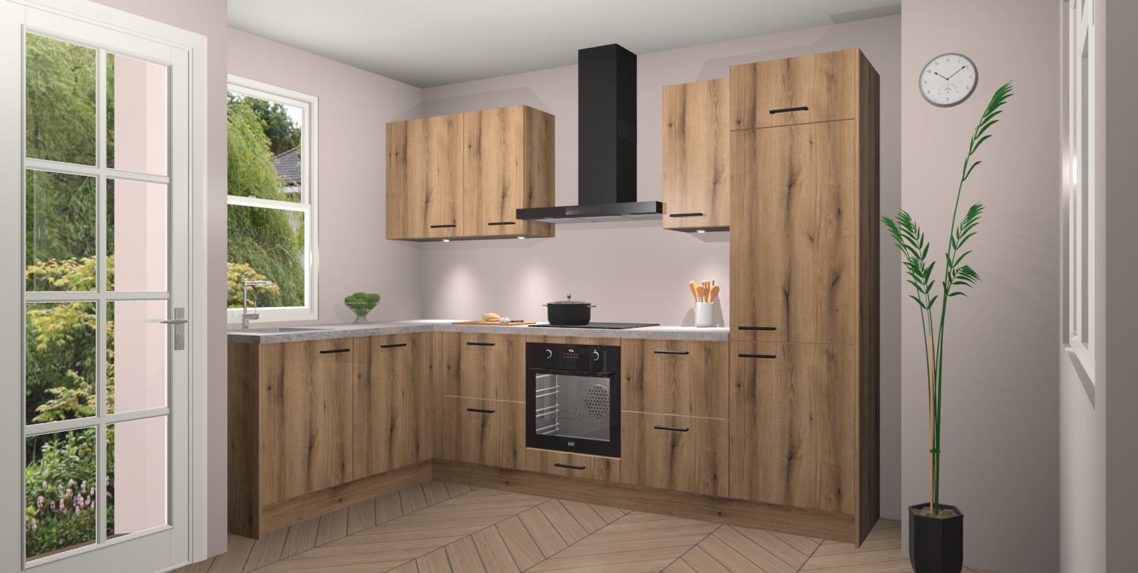 Bent u op zoek naar een strakke, moderne hoekkeuken die uw huis oppept en een moderne uitstraling geeft? Kijk dan niet verder dan de goud eiken keuken Beijing. Deze verbluffende hoekkeuken tilt hedendaags design naar een hoger niveau. Qua stijl is deze chique hoekkeuken voorzien van goud eiken accenten, om een strakke maar opvallende look te creëren. De binnenkant van de kasten is afgewerkt in dezelfde prachtige goud eiken kleur voor extra esthetische aantrekkingskracht.