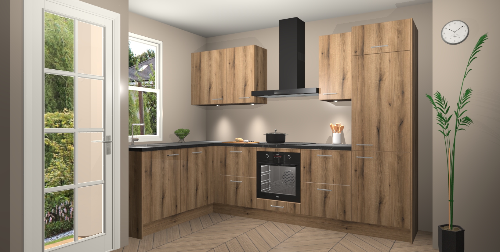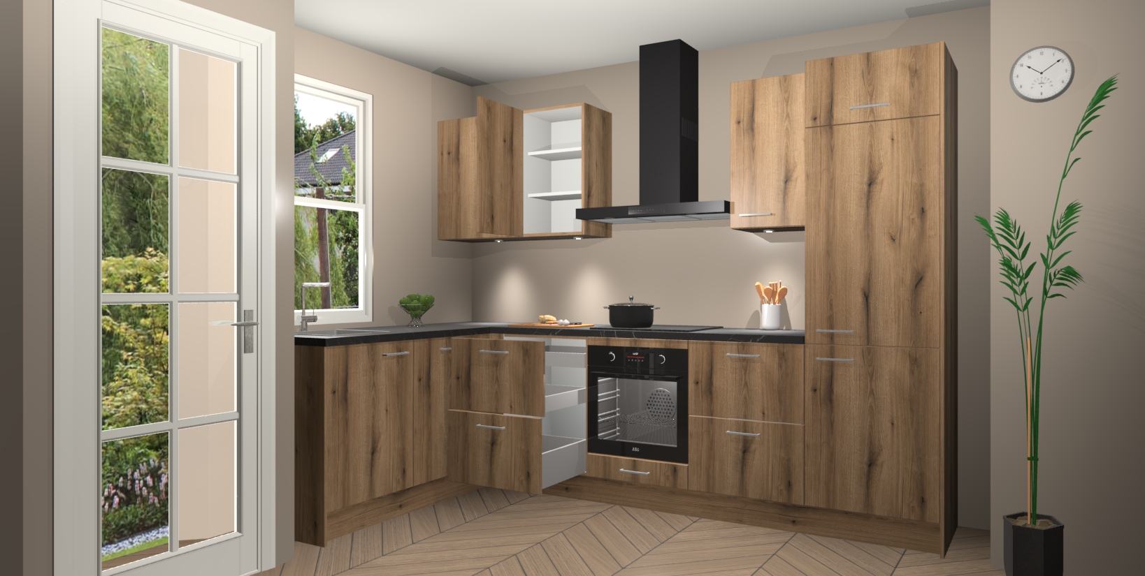 Bent u op zoek naar een strakke, moderne hoekkeuken die uw huis oppept en een moderne uitstraling geeft? Kijk dan niet verder dan de goud eiken keuken Beijing. Deze verbluffende hoekkeuken tilt hedendaags design naar een hoger niveau. Qua stijl is deze chique hoekkeuken voorzien van goud eiken accenten, om een strakke maar opvallende look te creëren. De binnenkant van de kasten is afgewerkt in dezelfde prachtige goud eiken kleur voor extra esthetische aantrekkingskracht.