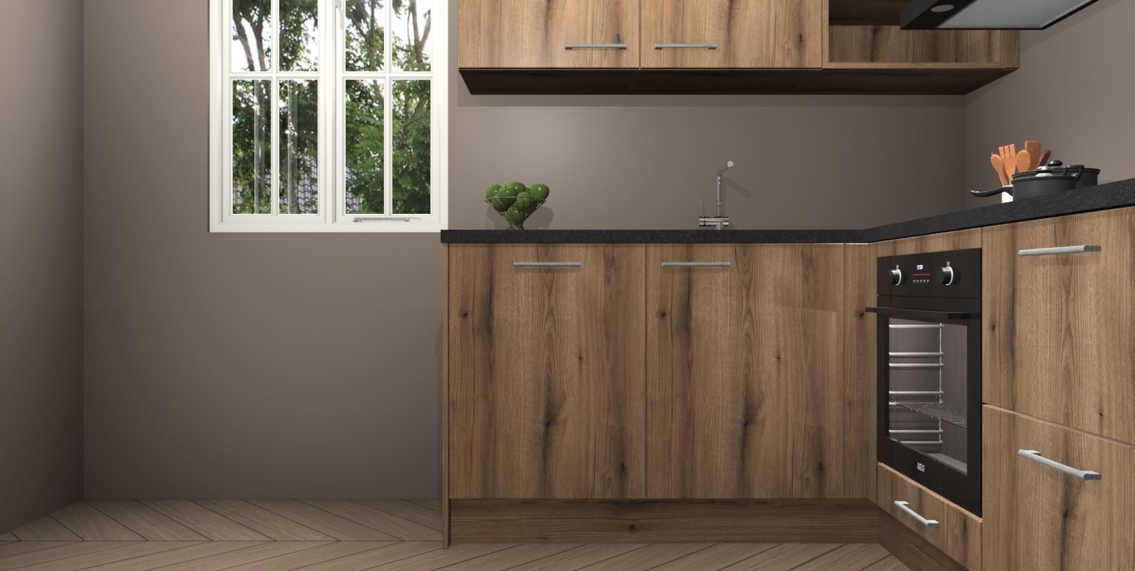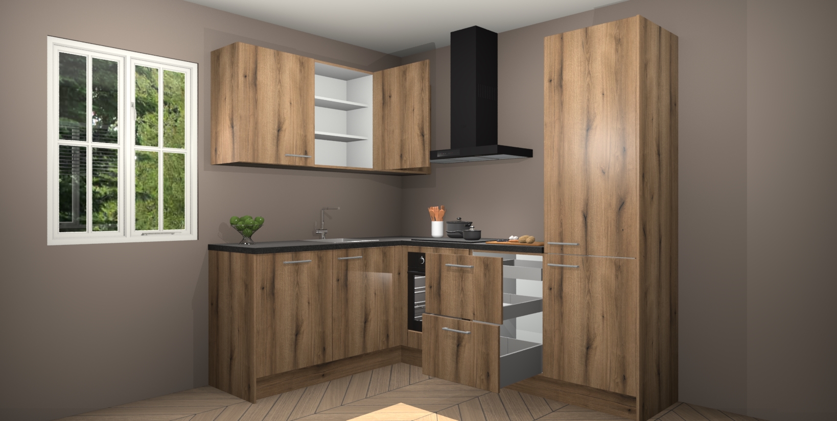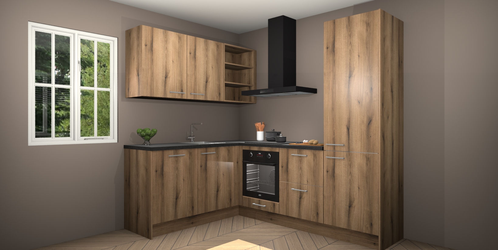 Maak kennis met de Goud Eiken keuken Boekarest, een moderne hoekkeuken waar al uw vrienden en familie jaloers op zullen zijn! Het verbluffende mooie ontwerp past in elk interieur en is een ideale keuze voor wie op zoek is naar een klassieke, maar verfijnde look.