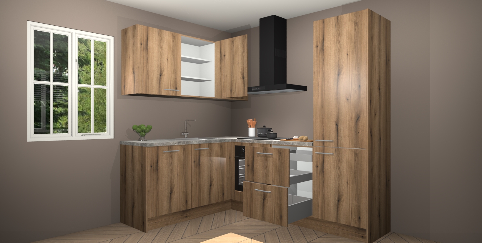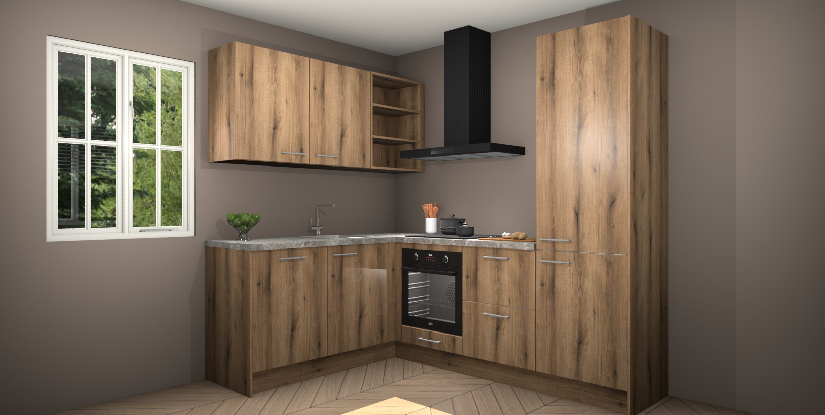 Maak kennis met de Goud Eiken keuken Boekarest, een moderne hoekkeuken waar al uw vrienden en familie jaloers op zullen zijn! Het verbluffende mooie ontwerp past in elk interieur en is een ideale keuze voor wie op zoek is naar een klassieke, maar verfijnde look.