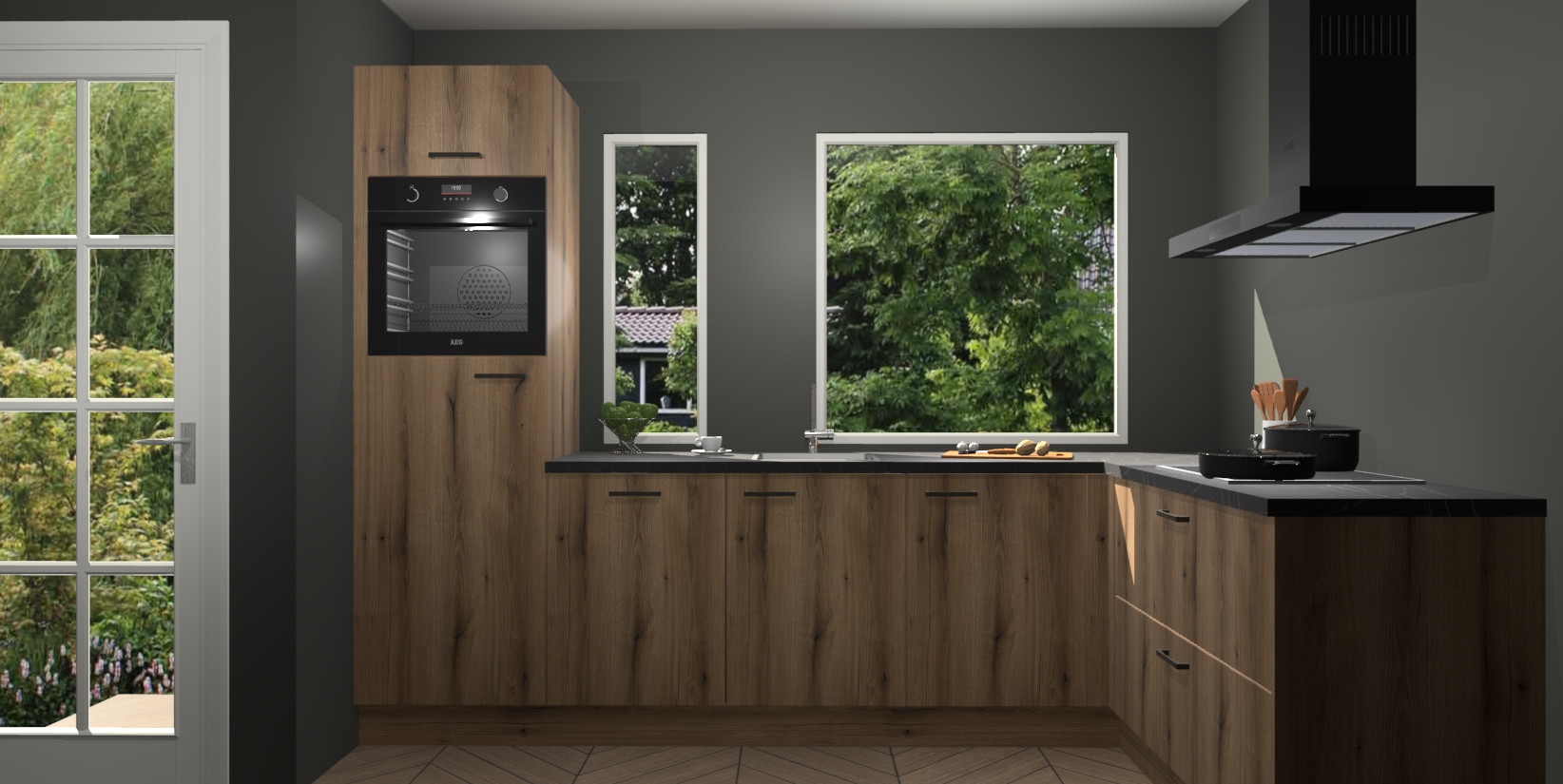 Deze complete keuken wordt geleverd met 5 inbouwapparaten: een oven, inductiekookplaat, afzuigkap, vaatwasser en koelkast.  De toestellen kunnen na bestelling ook gemakkelijk worden opgewaardeerd naar AEG. Bovendien is elke deur in deze keuken voorzien van handige softclose technologie voor eenvoudig gebruik! Als een leuke toevoeging zit in deze keuken ook een carrousel, zo hoef je niet meer de hoek in duiken om iets te pakken.