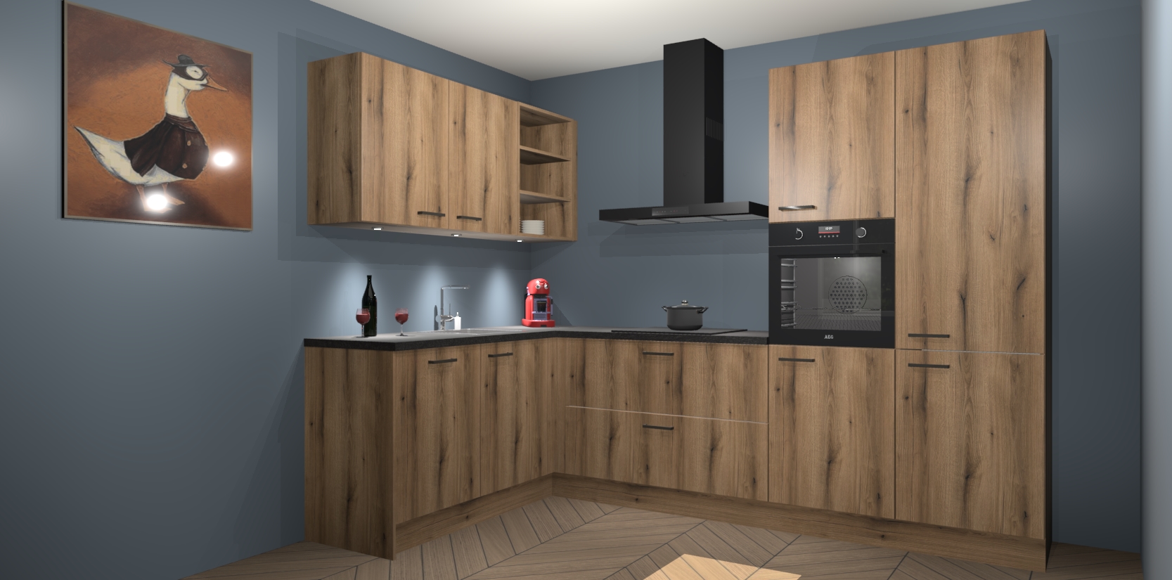 De Goud Eiken keuken Cognac is een adembenemend ontwerp met een modern en tijdloos uiterlijk. Deze luxe keuken straalt echt aristocratisch uit, waardoor uw koken plezieriger zal worden! Het prachtige design begint bij de hoekkeuken, wat perfect past bij elk type interieur. Bovendien bevat deze hoogwaardige set vijf inbouwapparaten - van oven tot koelkast - die via bestelling naar AEG geüpgraded kunnen worden!