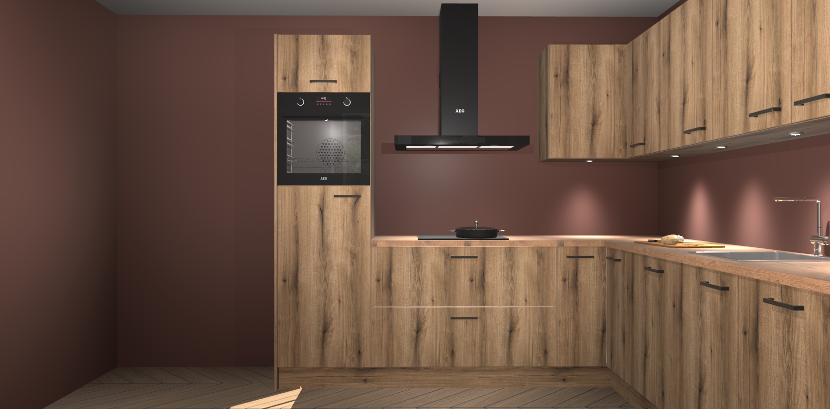 De Goud Eiken keuken Debar is uitgerust met vijf inbouwapparaten die elke kooktaak handig en efficiënt maken. Een oven, inductiekookplaat, afzuigkap, vaatwasser en koelkast zijn standaard, maar kunnen na bestelling eenvoudig worden geupgrade naar AEG. Profiteer vervolgens van de softclose deuren voor snelle toegang en geruisloze toegang.