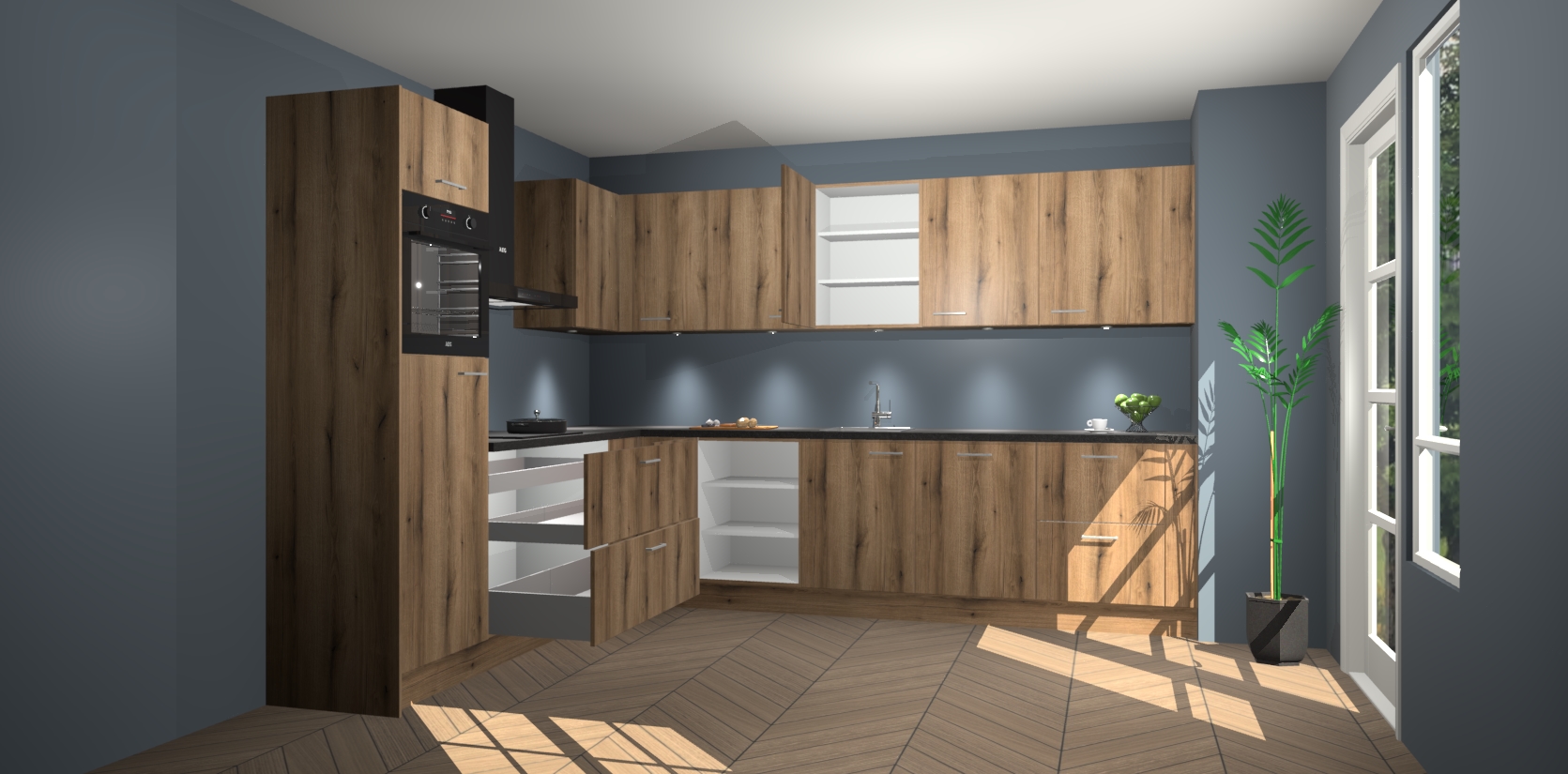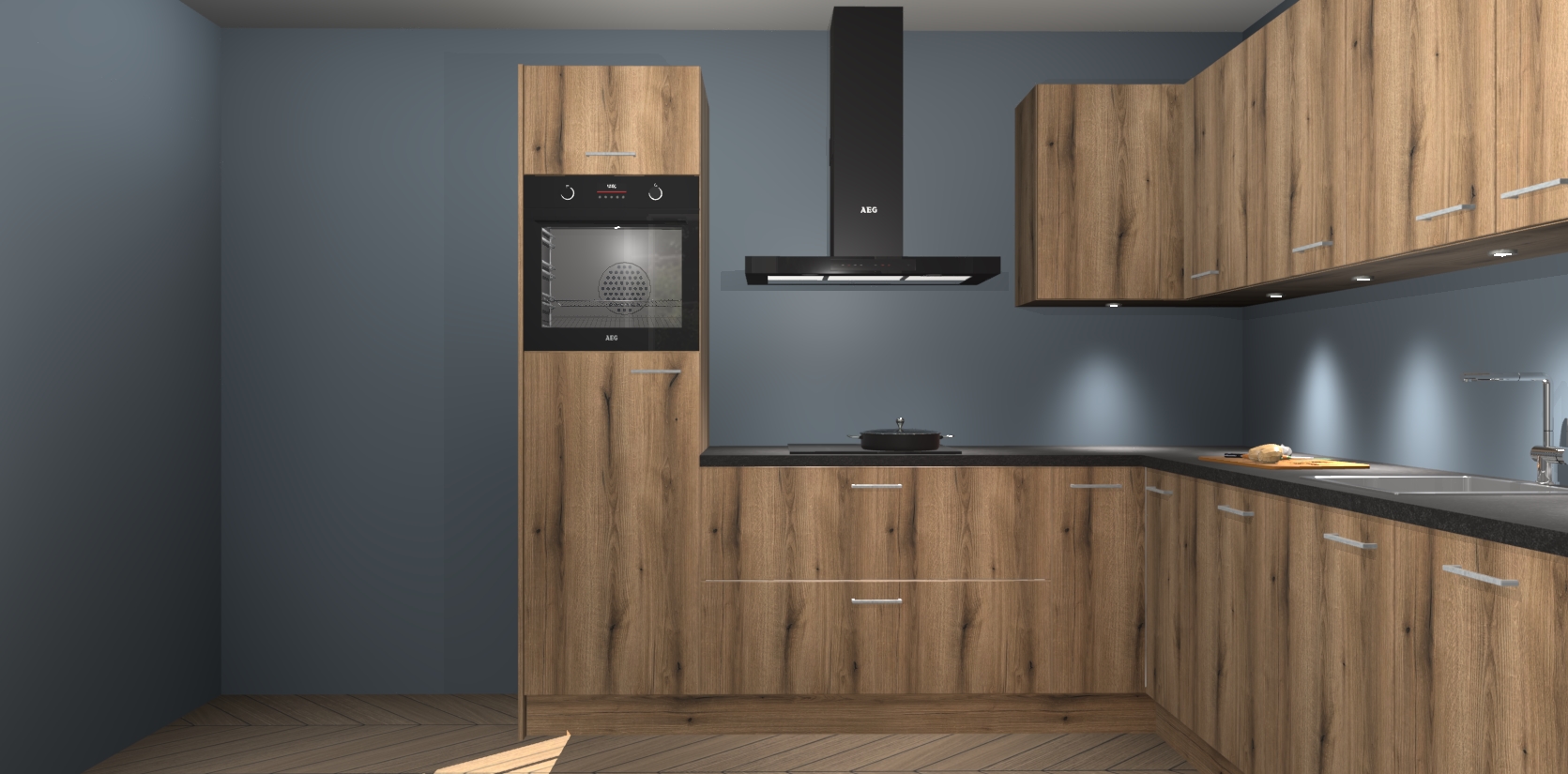 De Goud Eiken keuken Debar is uitgerust met vijf inbouwapparaten die elke kooktaak handig en efficiënt maken. Een oven, inductiekookplaat, afzuigkap, vaatwasser en koelkast zijn standaard, maar kunnen na bestelling eenvoudig worden geupgrade naar AEG. Profiteer vervolgens van de softclose deuren voor snelle toegang en geruisloze toegang.