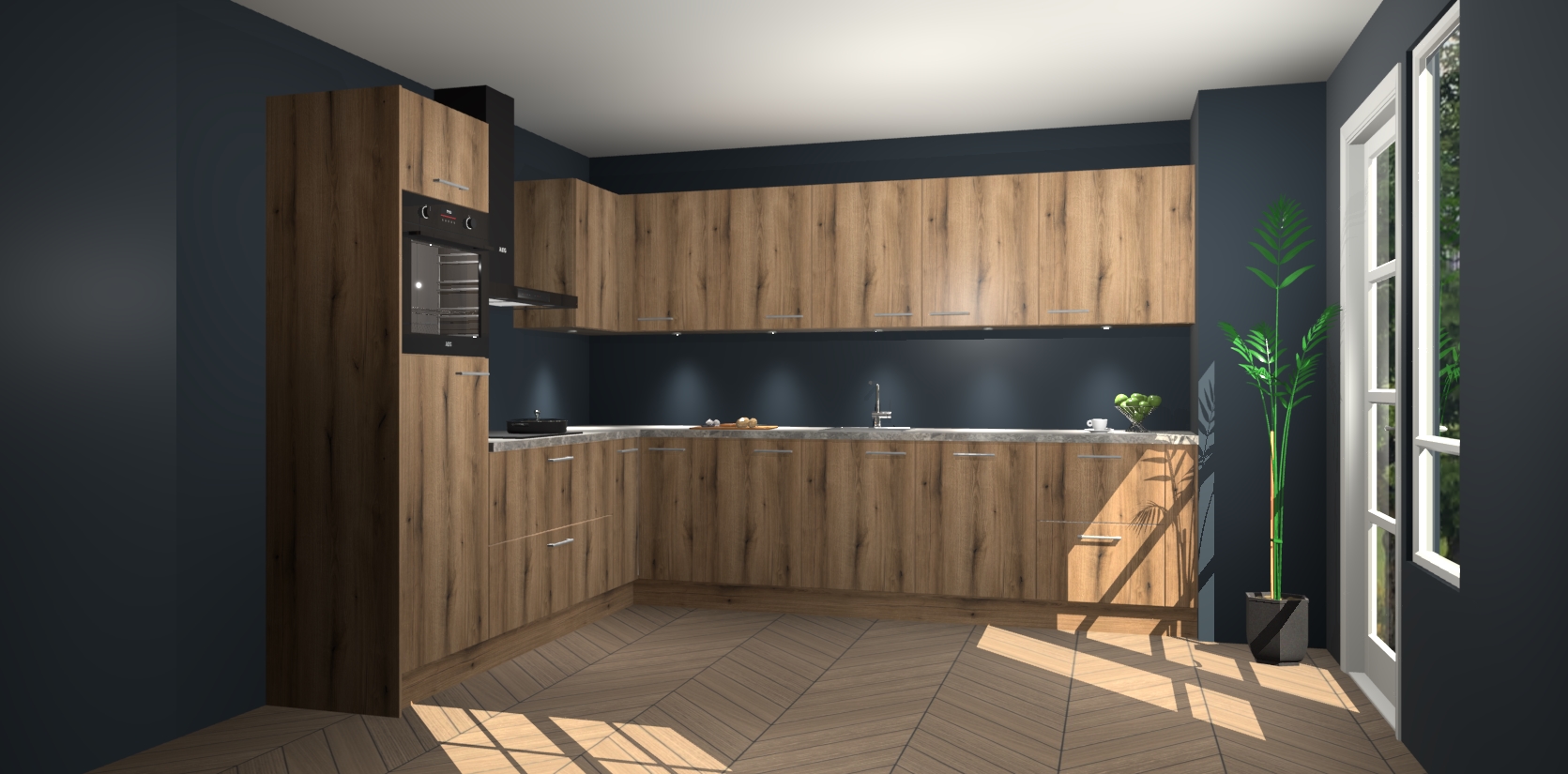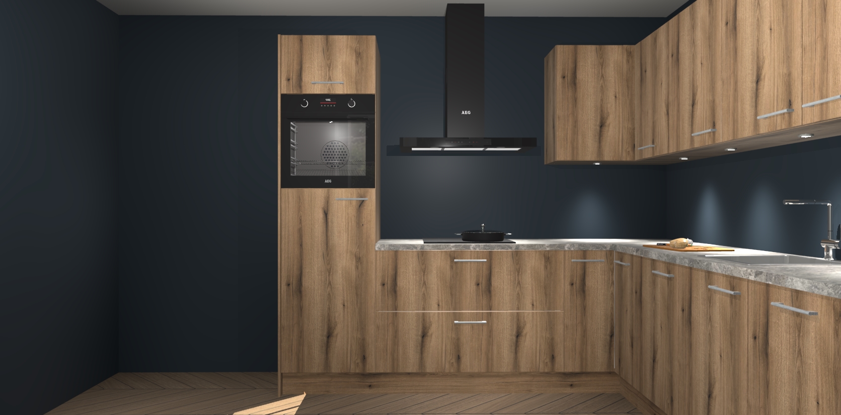 De Goud Eiken keuken Debar is uitgerust met vijf inbouwapparaten die elke kooktaak handig en efficiënt maken. Een oven, inductiekookplaat, afzuigkap, vaatwasser en koelkast zijn standaard, maar kunnen na bestelling eenvoudig worden geupgrade naar AEG. Profiteer vervolgens van de softclose deuren voor snelle toegang en geruisloze toegang.