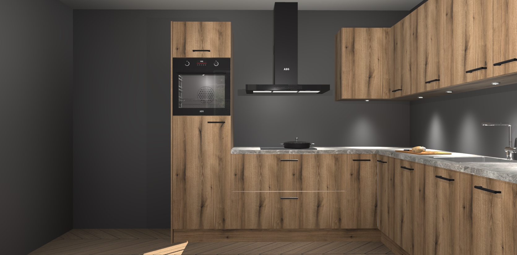 De Goud Eiken keuken Debar is uitgerust met vijf inbouwapparaten die elke kooktaak handig en efficiënt maken. Een oven, inductiekookplaat, afzuigkap, vaatwasser en koelkast zijn standaard, maar kunnen na bestelling eenvoudig worden geupgrade naar AEG. Profiteer vervolgens van de softclose deuren voor snelle toegang en geruisloze toegang.