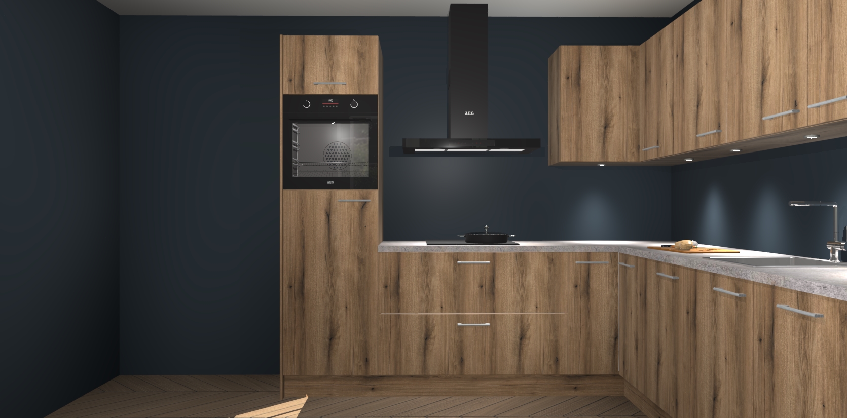 De Goud Eiken keuken Debar is uitgerust met vijf inbouwapparaten die elke kooktaak handig en efficiënt maken. Een oven, inductiekookplaat, afzuigkap, vaatwasser en koelkast zijn standaard, maar kunnen na bestelling eenvoudig worden geupgrade naar AEG. Profiteer vervolgens van de softclose deuren voor snelle toegang en geruisloze toegang.
