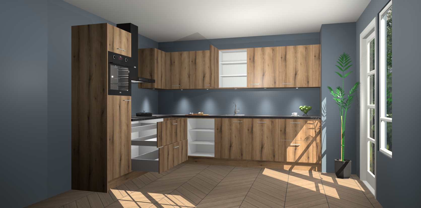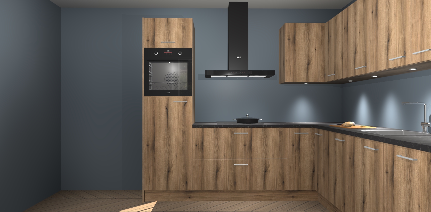 De Goud Eiken keuken Debar is uitgerust met vijf inbouwapparaten die elke kooktaak handig en efficiënt maken. Een oven, inductiekookplaat, afzuigkap, vaatwasser en koelkast zijn standaard, maar kunnen na bestelling eenvoudig worden geupgrade naar AEG. Profiteer vervolgens van de softclose deuren voor snelle toegang en geruisloze toegang.