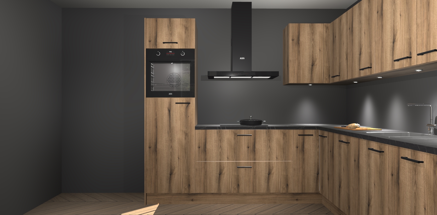 De Goud Eiken keuken Debar is uitgerust met vijf inbouwapparaten die elke kooktaak handig en efficiënt maken. Een oven, inductiekookplaat, afzuigkap, vaatwasser en koelkast zijn standaard, maar kunnen na bestelling eenvoudig worden geupgrade naar AEG. Profiteer vervolgens van de softclose deuren voor snelle toegang en geruisloze toegang.