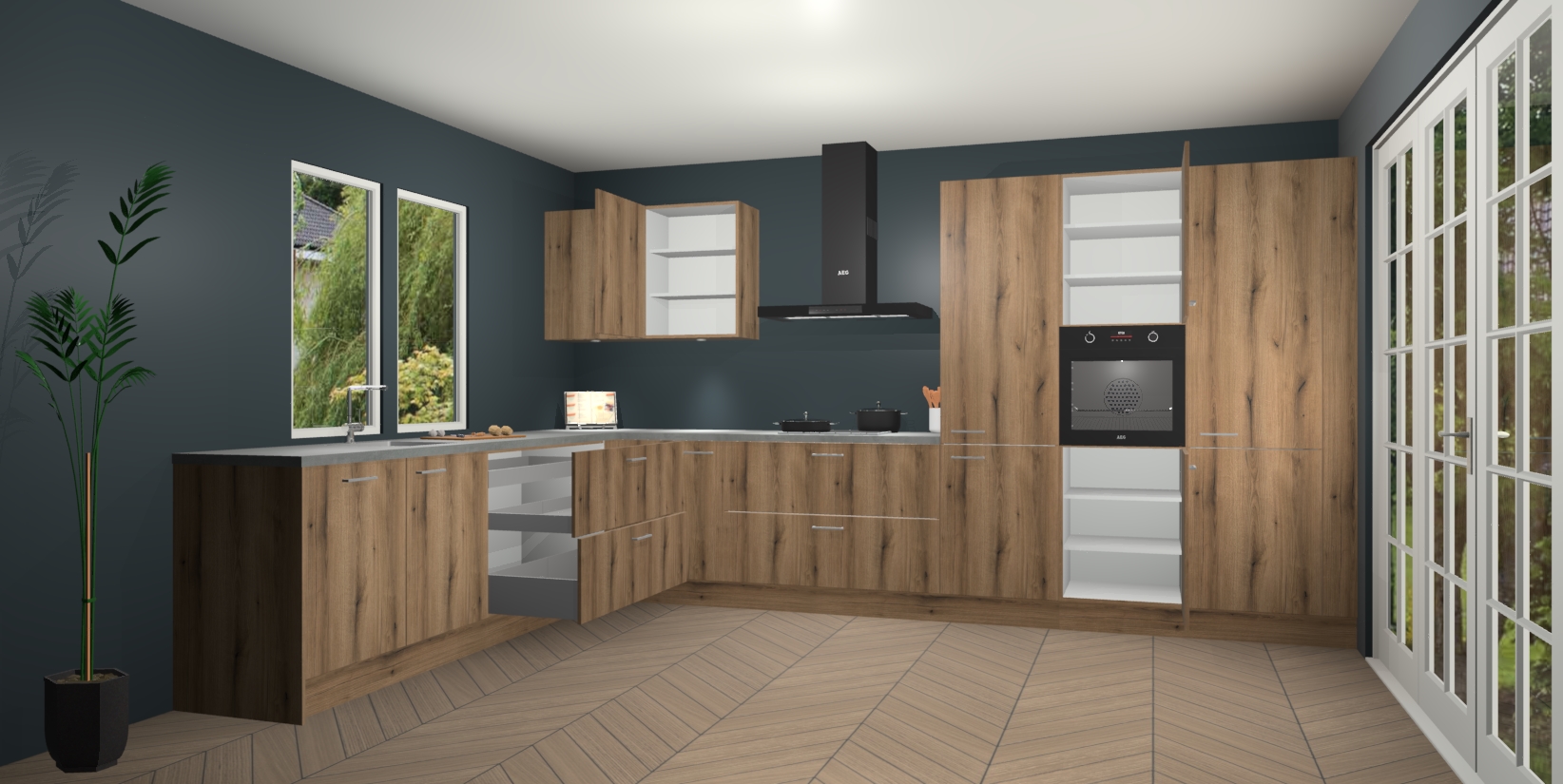 Heeft u nog apparatuur nodig? Geen probleem: de Goud Eiken keuken Debrecen bevat vijf ingebouwde apparaten - een oven, inductiekookplaat, afzuigkap, vaatwasser en koelkast - die gemakkelijk kunnen worden bijgewerkt naar AEG na bestelling. En als dat nog niet genoeg is; onze kasten worden pre-geassembleerd geleverd en zijn verkrijgbaar tegen een vastgeroeste lage prijs! U hoeft nooit meer te zoeken naar goede kwaliteit en service want onze producten hebben echt Duitse kwaliteit.