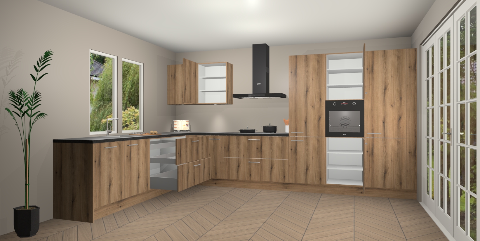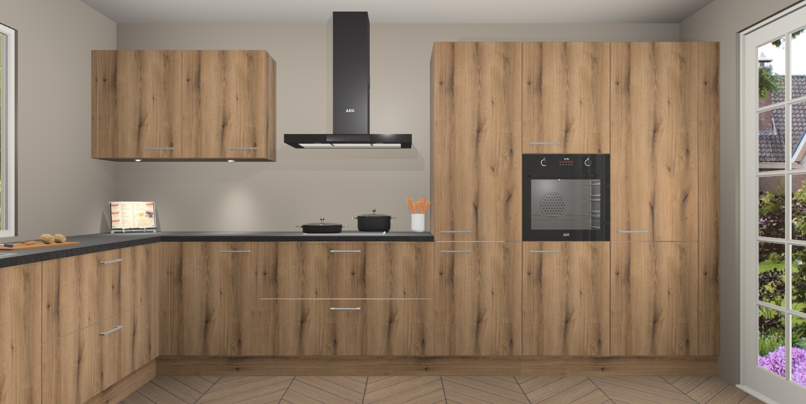 Heeft u nog apparatuur nodig? Geen probleem: de Goud Eiken keuken Debrecen bevat vijf ingebouwde apparaten - een oven, inductiekookplaat, afzuigkap, vaatwasser en koelkast - die gemakkelijk kunnen worden bijgewerkt naar AEG na bestelling. En als dat nog niet genoeg is; onze kasten worden pre-geassembleerd geleverd en zijn verkrijgbaar tegen een vastgeroeste lage prijs! U hoeft nooit meer te zoeken naar goede kwaliteit en service want onze producten hebben echt Duitse kwaliteit.