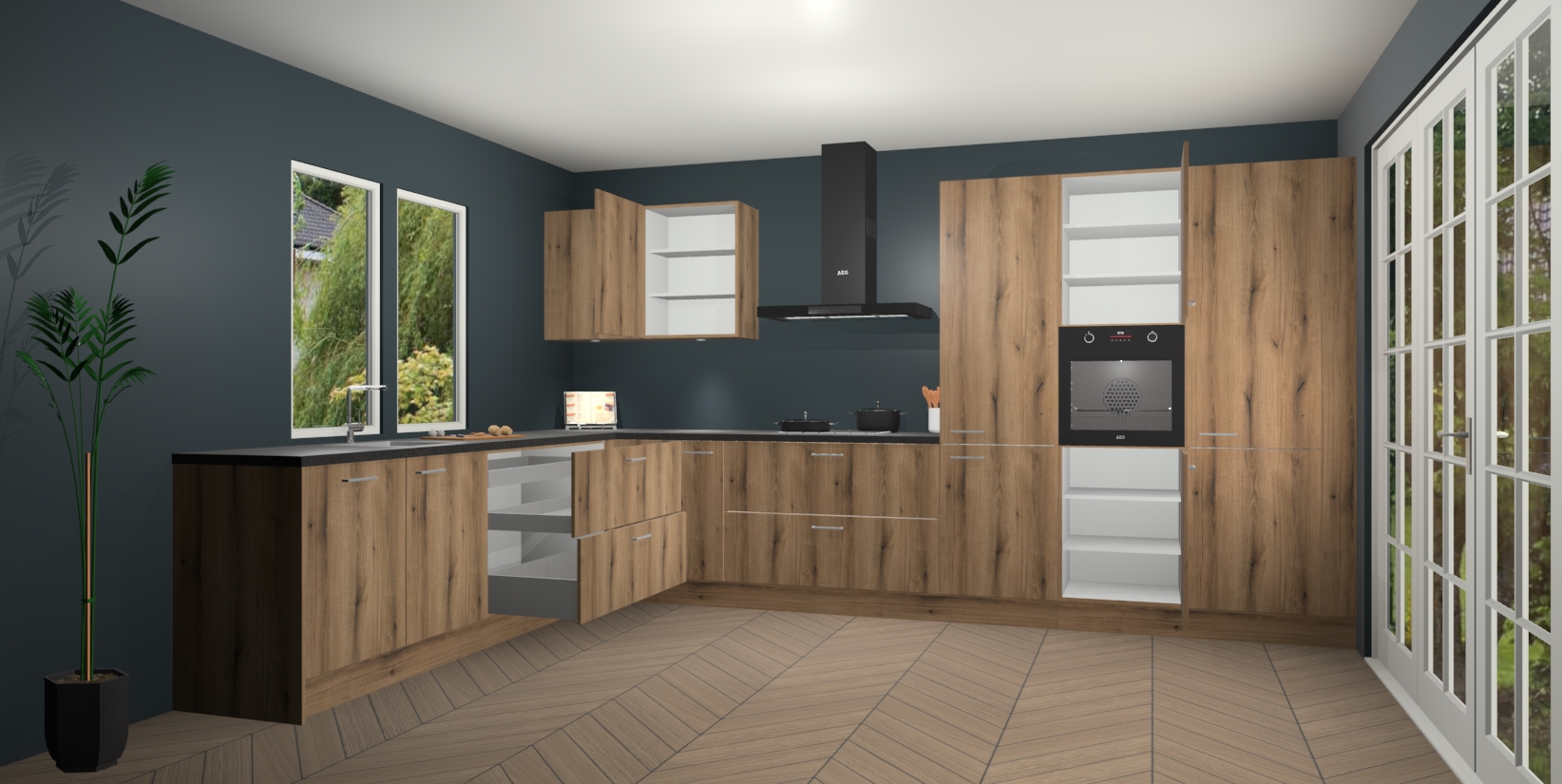 Heeft u nog apparatuur nodig? Geen probleem: de Goud Eiken keuken Debrecen bevat vijf ingebouwde apparaten - een oven, inductiekookplaat, afzuigkap, vaatwasser en koelkast - die gemakkelijk kunnen worden bijgewerkt naar AEG na bestelling. En als dat nog niet genoeg is; onze kasten worden pre-geassembleerd geleverd en zijn verkrijgbaar tegen een vastgeroeste lage prijs! U hoeft nooit meer te zoeken naar goede kwaliteit en service want onze producten hebben echt Duitse kwaliteit.