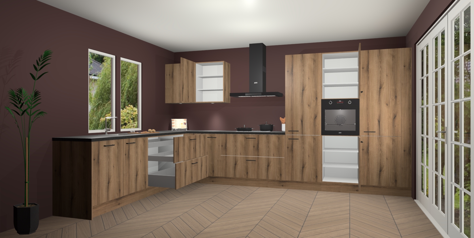 Heeft u nog apparatuur nodig? Geen probleem: de Goud Eiken keuken Debrecen bevat vijf ingebouwde apparaten - een oven, inductiekookplaat, afzuigkap, vaatwasser en koelkast - die gemakkelijk kunnen worden bijgewerkt naar AEG na bestelling. En als dat nog niet genoeg is; onze kasten worden pre-geassembleerd geleverd en zijn verkrijgbaar tegen een vastgeroeste lage prijs! U hoeft nooit meer te zoeken naar goede kwaliteit en service want onze producten hebben echt Duitse kwaliteit.