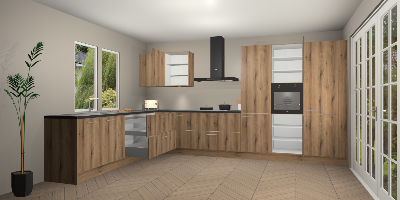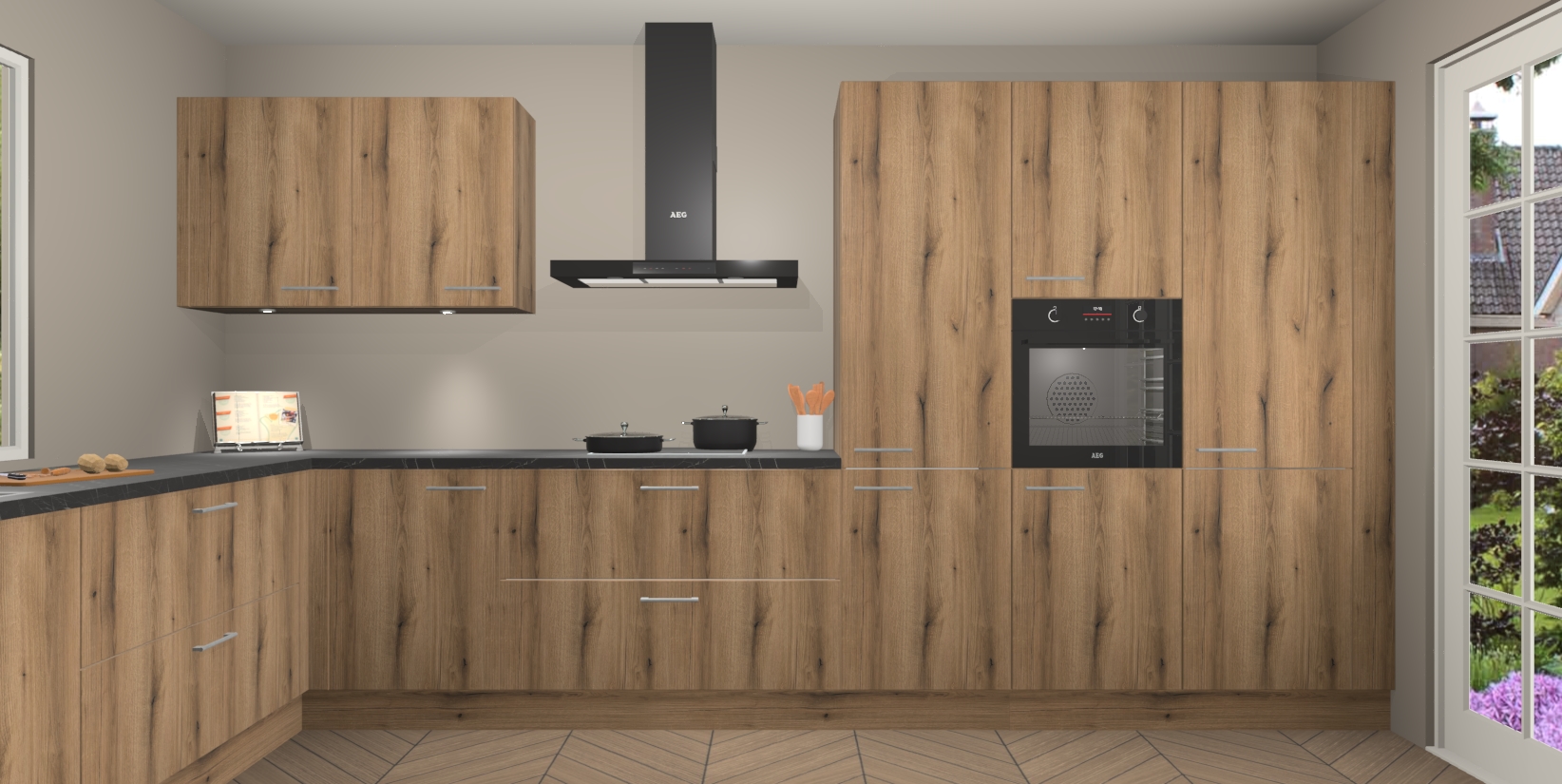Heeft u nog apparatuur nodig? Geen probleem: de Goud Eiken keuken Debrecen bevat vijf ingebouwde apparaten - een oven, inductiekookplaat, afzuigkap, vaatwasser en koelkast - die gemakkelijk kunnen worden bijgewerkt naar AEG na bestelling. En als dat nog niet genoeg is; onze kasten worden pre-geassembleerd geleverd en zijn verkrijgbaar tegen een vastgeroeste lage prijs! U hoeft nooit meer te zoeken naar goede kwaliteit en service want onze producten hebben echt Duitse kwaliteit.