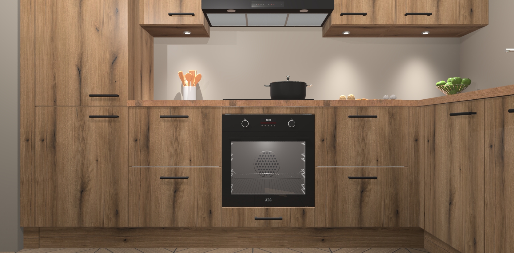 De Goud Eiken keuken Geneve is uitgerust met 5 inbouwapparaten - een oven, inductiekookplaat, afzuigkap, vaatwasser en koelkast - voor al uw kook- en bewaarbehoeftes. U kunt deze apparaten desgewenst eenvoudig upgraden naar AEG of de oven omruilen voor een combimagnetron na het plaatsen van uw bestelling. En met de soft close deuren, voldoende opbergruimte en kasten die voorgemonteerd worden geleverd, bent u in een mum van tijd klaar om heerlijke maaltijden te bereiden!