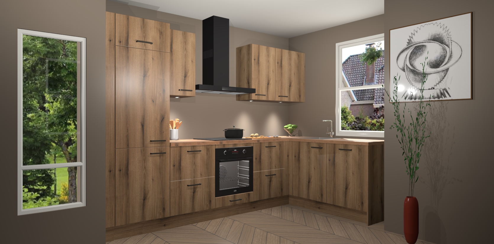 De Goud Eiken keuken Geneve is precies wat u nodig heeft als u op zoek bent naar modern design, versmolten met tijdloze schoonheid. De strakke afwerking voegt klasse toe terwijl het toch een uitnodigende sfeer behoudt; zeker om zowel gasten als uzelf te inspireren om in stijl te gaan koken! En nog beter, het zal uw budget niet breken - dus waarom wachten? Met de Goud Eiken keuken Geneve bent u verzekerd van kwaliteit zonder in te leveren op de prijs!