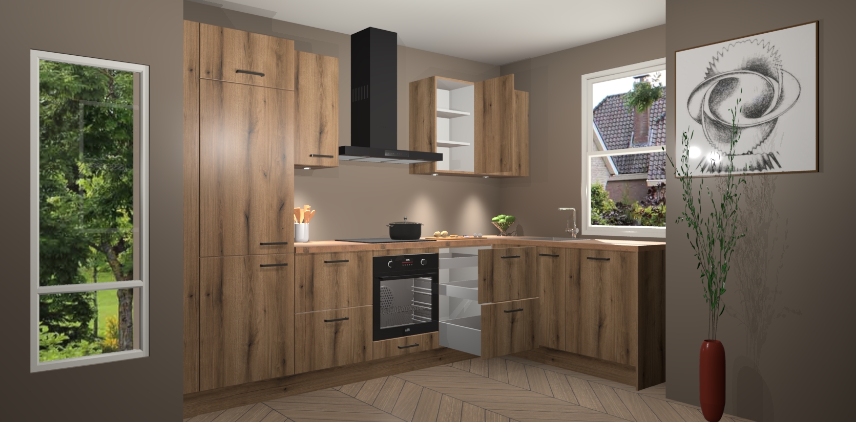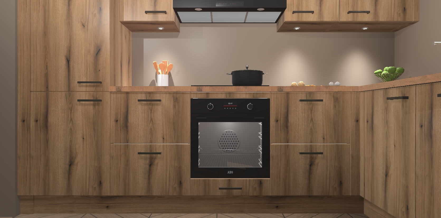 De Goud Eiken keuken Geneve is uitgerust met 5 inbouwapparaten - een oven, inductiekookplaat, afzuigkap, vaatwasser en koelkast - voor al uw kook- en bewaarbehoeftes. U kunt deze apparaten desgewenst eenvoudig upgraden naar AEG of de oven omruilen voor een combimagnetron na het plaatsen van uw bestelling. En met de soft close deuren, voldoende opbergruimte en kasten die voorgemonteerd worden geleverd, bent u in een mum van tijd klaar om heerlijke maaltijden te bereiden!