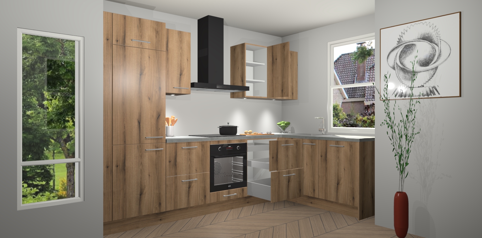 De Goud Eiken keuken Geneve is precies wat u nodig heeft als u op zoek bent naar modern design, versmolten met tijdloze schoonheid. De strakke afwerking voegt klasse toe terwijl het toch een uitnodigende sfeer behoudt; zeker om zowel gasten als uzelf te inspireren om in stijl te gaan koken! En nog beter, het zal uw budget niet breken - dus waarom wachten? Met de Goud Eiken keuken Geneve bent u verzekerd van kwaliteit zonder in te leveren op de prijs!
